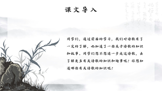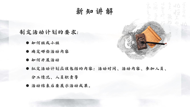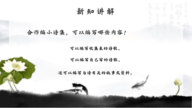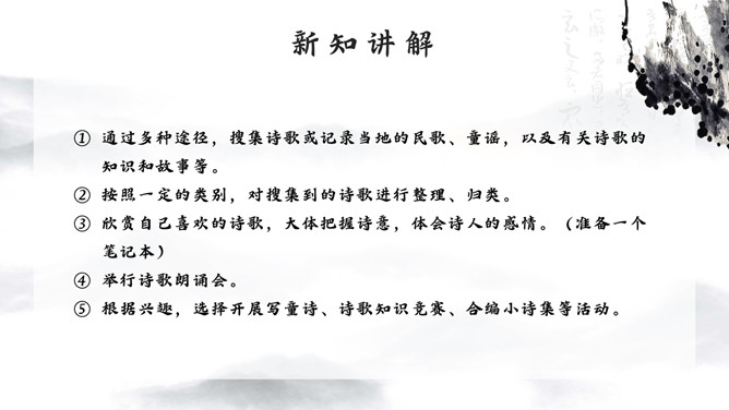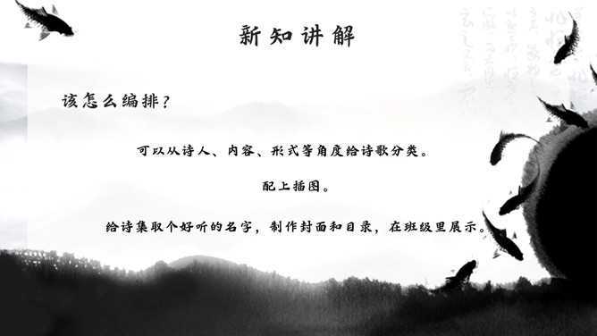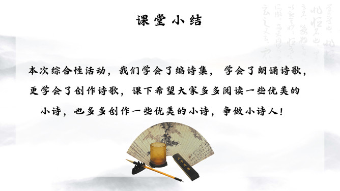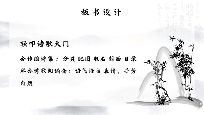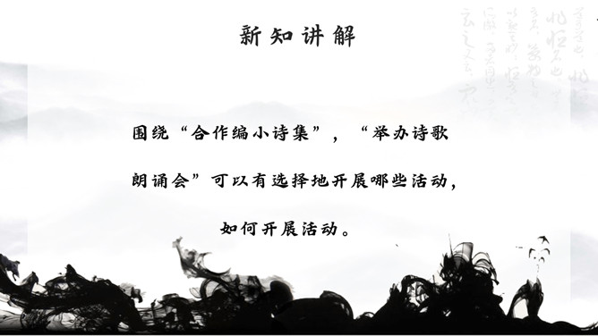 同学们,通过前面的学习,我们对诗歌有了一定的了解,也知道了一些关于诗歌的知识和故事。同学们想不想进一步走近诗歌,去了解更多有关诗歌的知识和趣事呢?你想知道哪些有关诗歌的知识呢?制定活动计划的要求:如何组成小组。确定哪些活动内容。如何开展活动。拟定活动计划应该包括的内容:活动时间、活动内容、参加人员、分工情况、人员职责等。活动结束后要展示活动成果。所属专题:轻扣诗歌大门ppt。