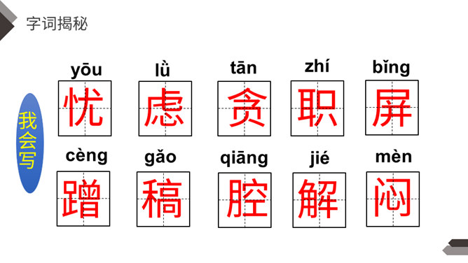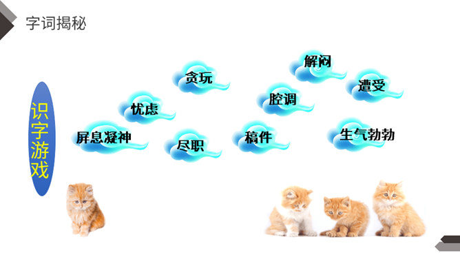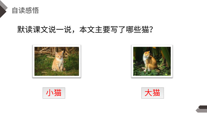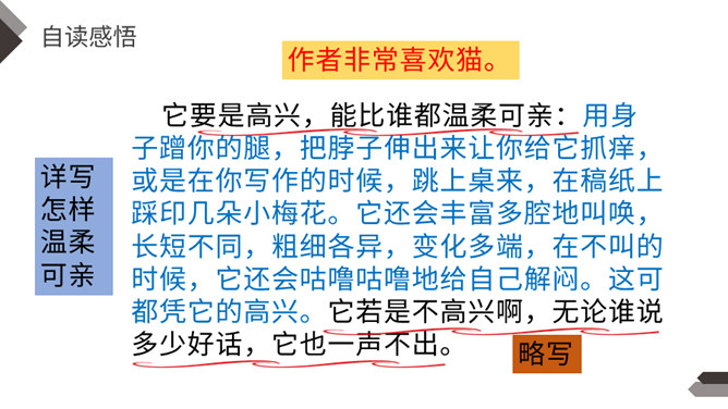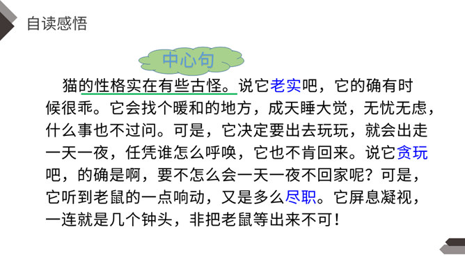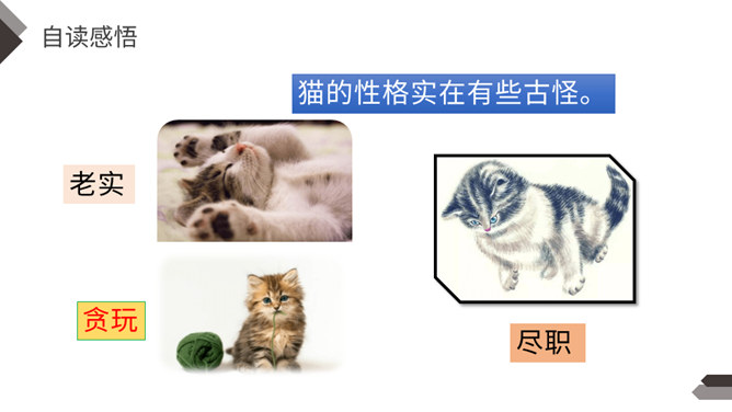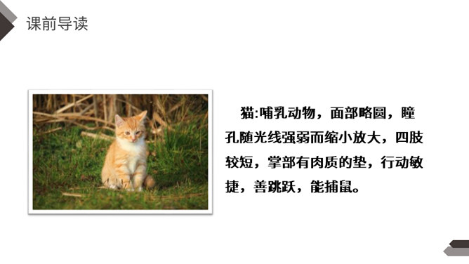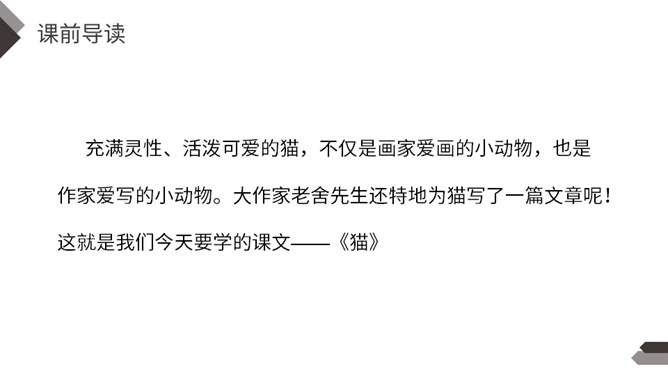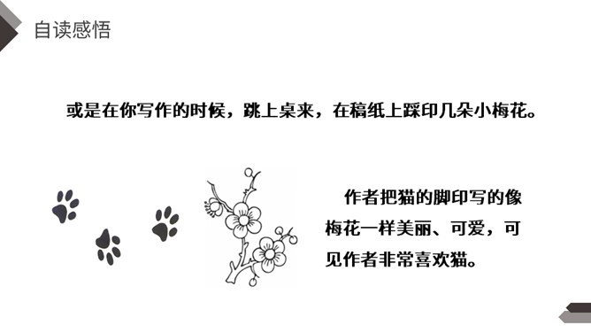 充满灵性、活泼可爱的猫,不仅是画家爱画的小动物,也是作家爱写的小动物。大作家老舍先生还特地为猫写了一篇文章呢!这就是我们今天要学的课文。作者把猫的脚印写的像梅花一样美丽、可爱,可见作者非常喜欢猫。猫高兴时不同的叫声,体现了作者对猫的喜爱。像“变化多端”这样的词,我还能说出几个:千变万化、变幻莫测、变化无常、风云变幻、 瞬息万变……给下列句子换一种说法,意思不变。所属专题:猫ppt。