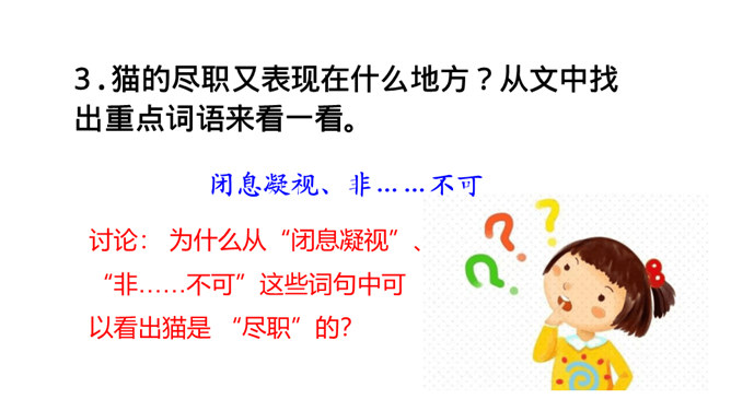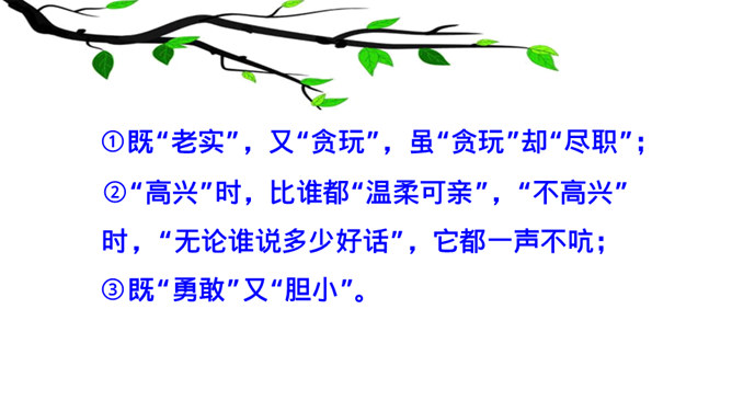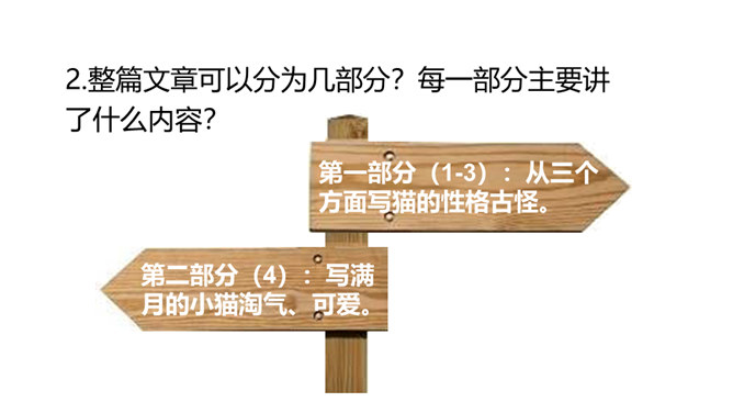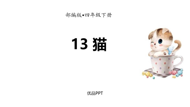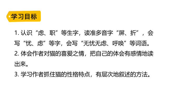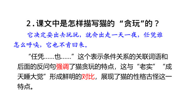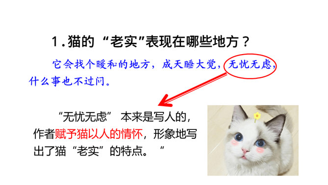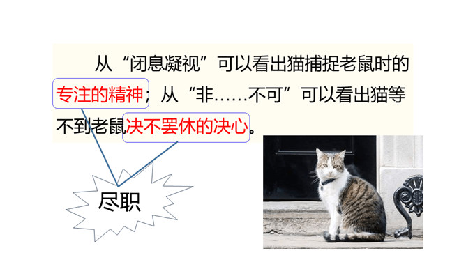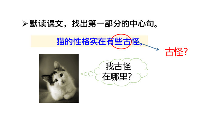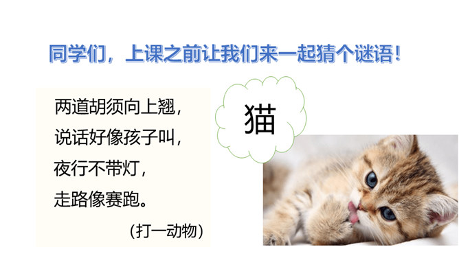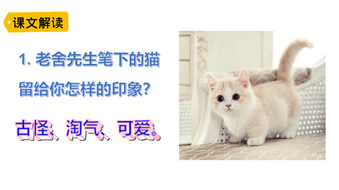 过去我们写动物,只懂写出动物的形状、生活习性,这篇课文却着重写出了猫的性格及作者对猫的爱。选自己所喜爱的一种小动物,说出它的特点,表达出你对它的感情。注意运用具体的事例,写出动物的特点。老舍先生在写猫时,从三个方面具体表现猫的性格古怪:讲它既老实又贪玩,既贪玩又尽职;讲它高兴时和不高兴时截然不同的表现;讲它“什么都怕”,但又那么“勇猛”。所属专题:猫ppt。