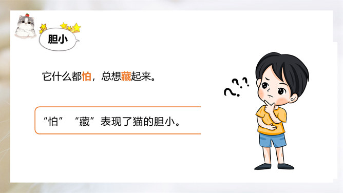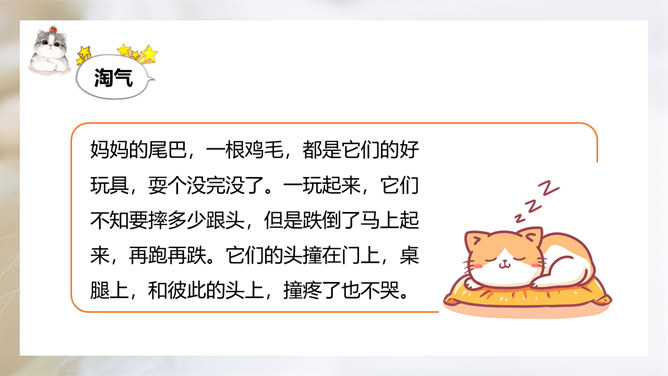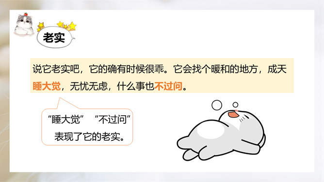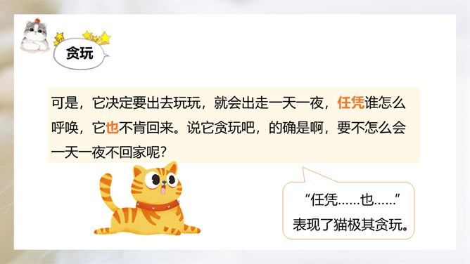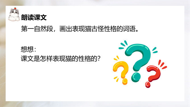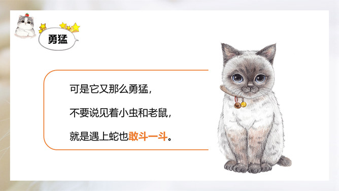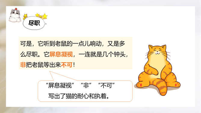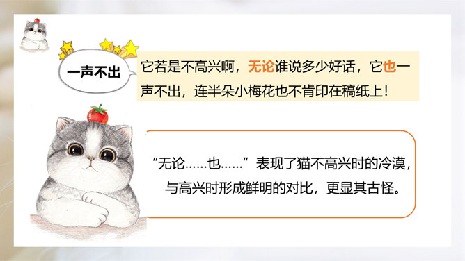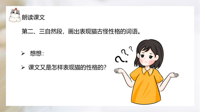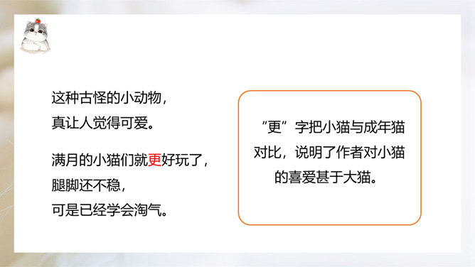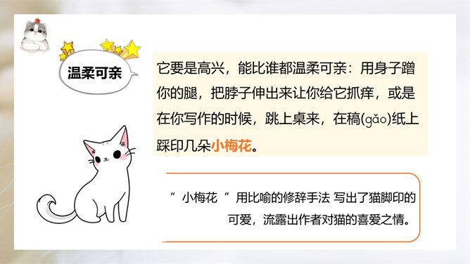 第一自然段,画出表现猫古怪性格的词语。 想想:课文是怎样表现猫的性格的?第二、三自然段,画出表现猫古怪性格的词语。 想想:课文又是怎样表现猫的性格的? ”小梅花 ”用比喻的修辞手法 写出了猫脚印的可爱,流露出作者对猫的喜爱之情。这篇课文细致生动地描述了猫的古怪性格和满月时的淘气可爱,表达了作者对猫的喜爱之情。“更”字把小猫与成年猫对比,说明了作者对小猫的喜爱甚于大猫。所属专题:猫ppt。