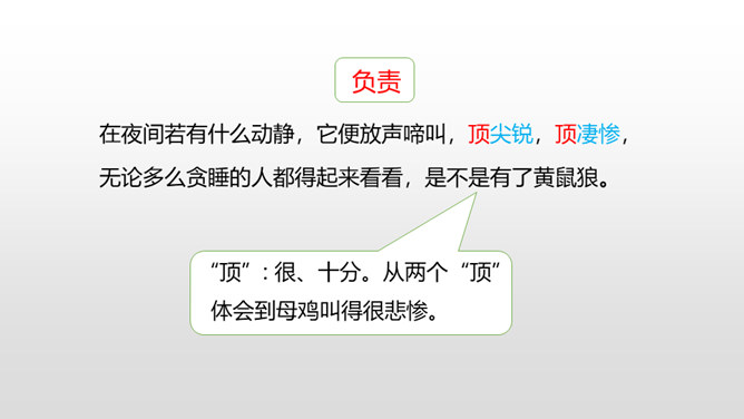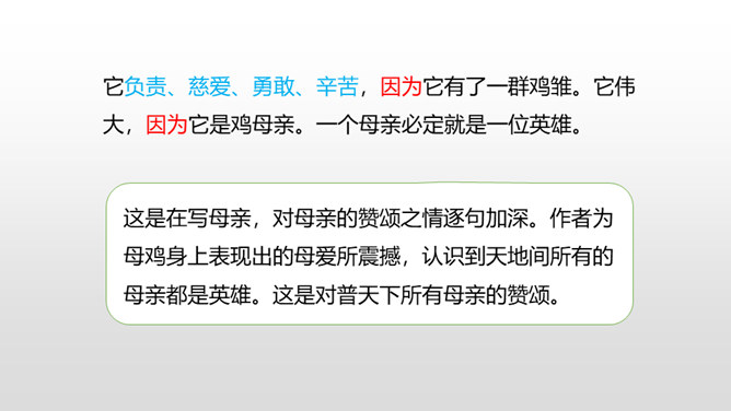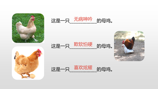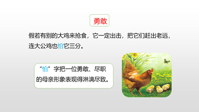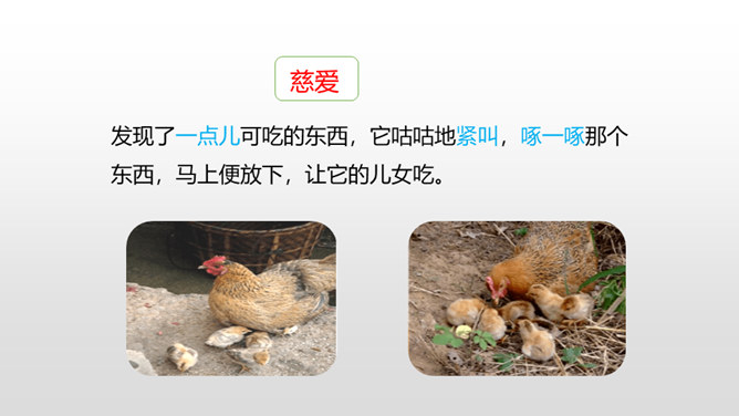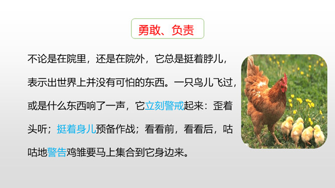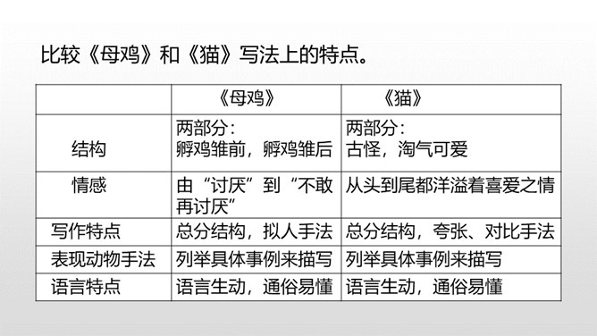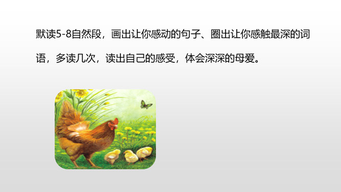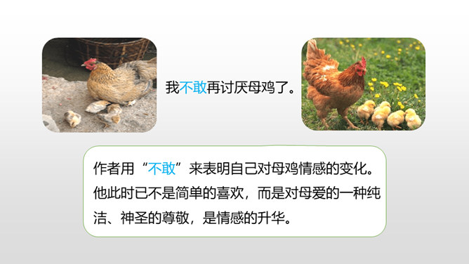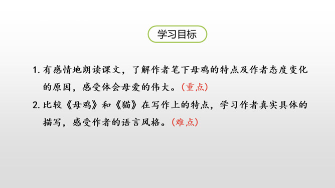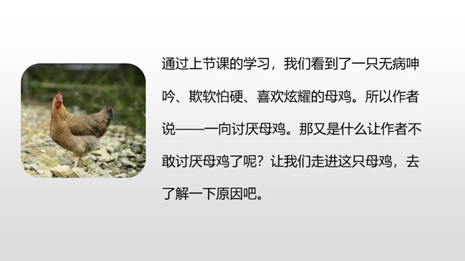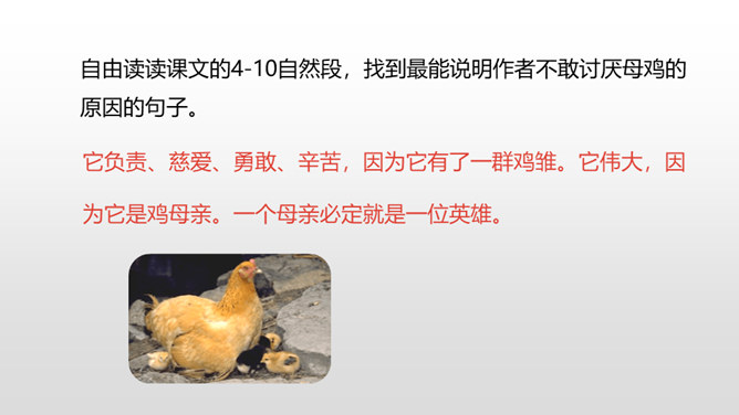 有感情地朗读课文,了解作者笔下母鸡的特点及作者态度变化的原因,感受体会母爱的伟大。比较《母鸡》和《猫》在写作上的特点,学习作者真实具体的描写,感受作者的语言风格。通过上节课的学习,我们看到了一只无病呻吟、欺软怕硬、喜欢炫耀的母鸡。所以作者说一向讨厌母鸡。那又是什么让作者不敢讨厌母鸡了呢?让我们走进这只母鸡,去了解一下原因吧。自由读读课文的4-10自然段,找到最能说明作者不敢讨厌母鸡的原因的句子。所属专题:母鸡ppt。