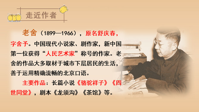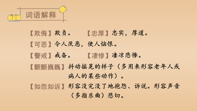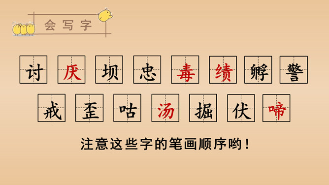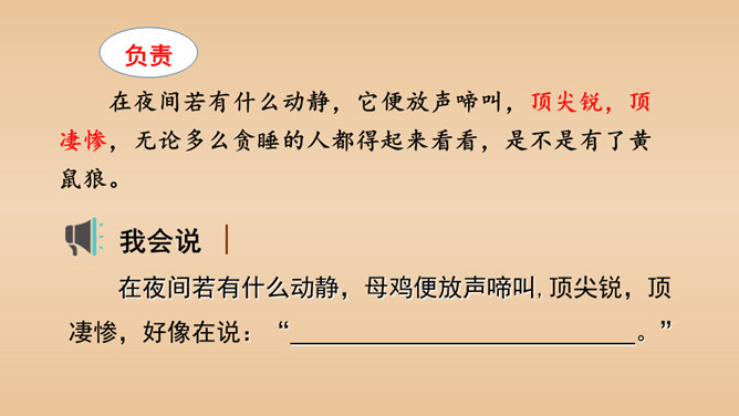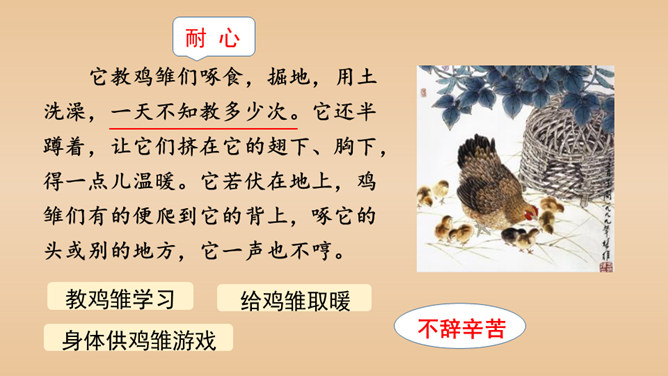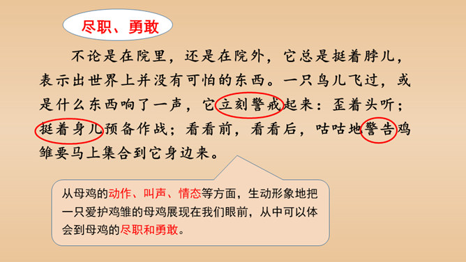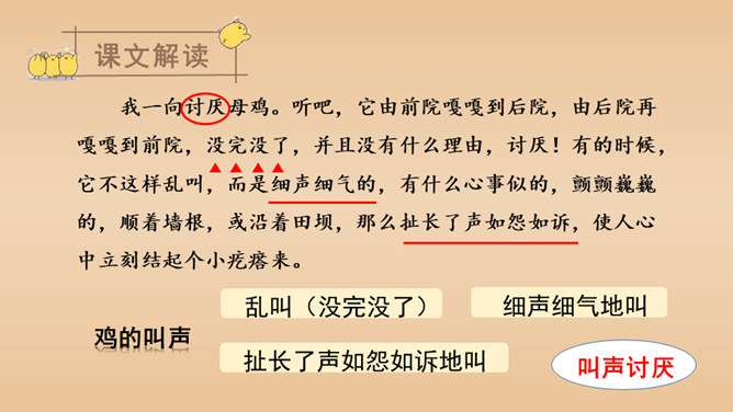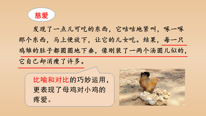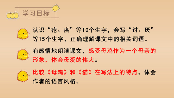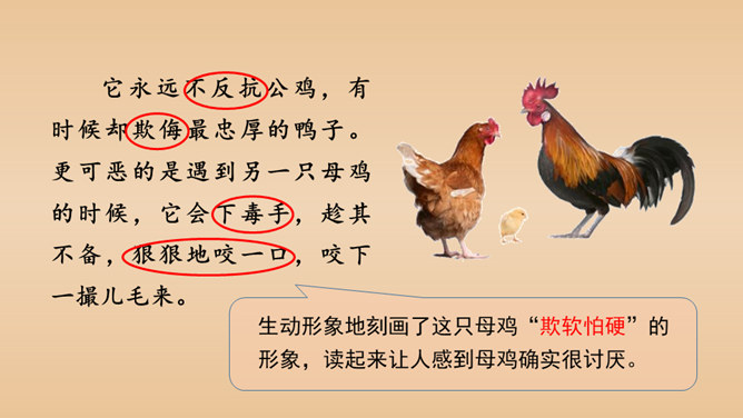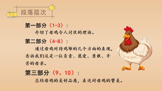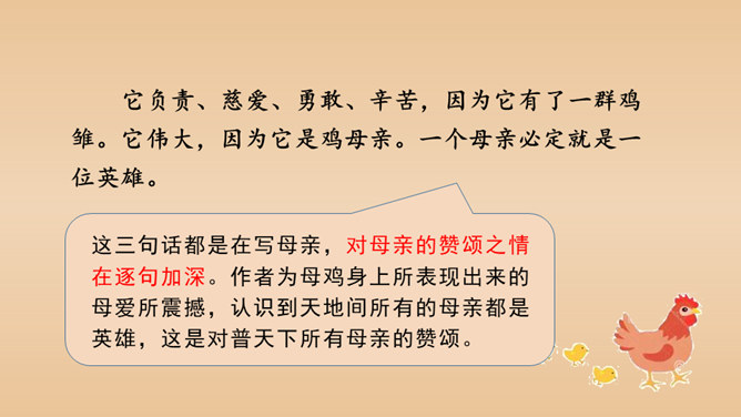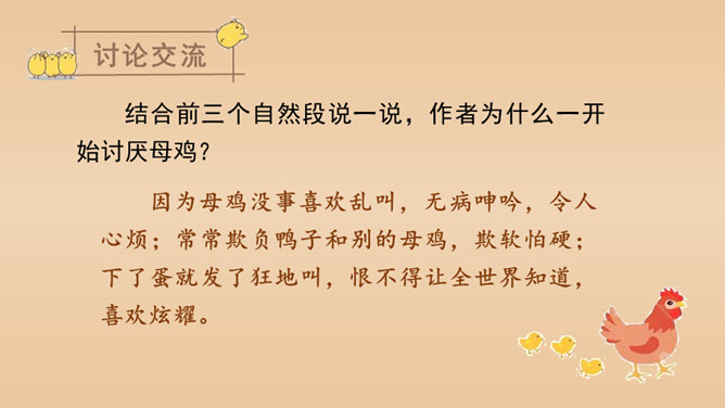 有感情地朗读课文,说说课文的主要内容是什么。本文以作者自己的情感变化为线索,描写了他对母鸡前后看法的变化,塑造了一个无私无畏、日夜操劳的伟大母亲的形象,表达了作者对母亲的崇敬以及对母爱的赞颂之情。结合前三个自然段说一说,作者为什么一开始讨厌母鸡?因为母鸡没事喜欢乱叫,无病呻吟,令人心烦;常常欺负鸭子和别的母鸡,欺软怕硬;下了蛋就发了狂地叫,恨不得让全世界知道,喜欢炫耀。所属专题:母鸡ppt。