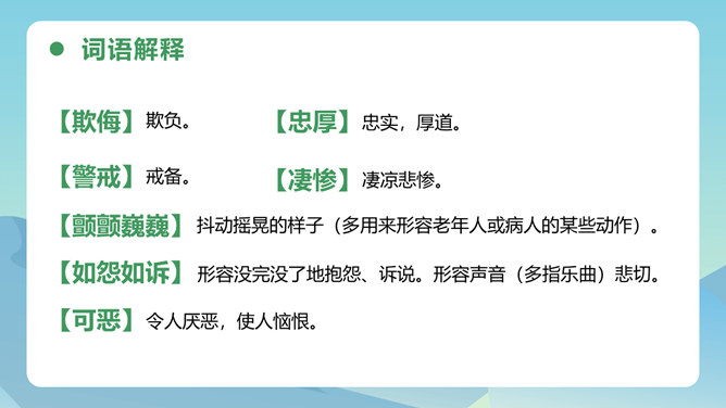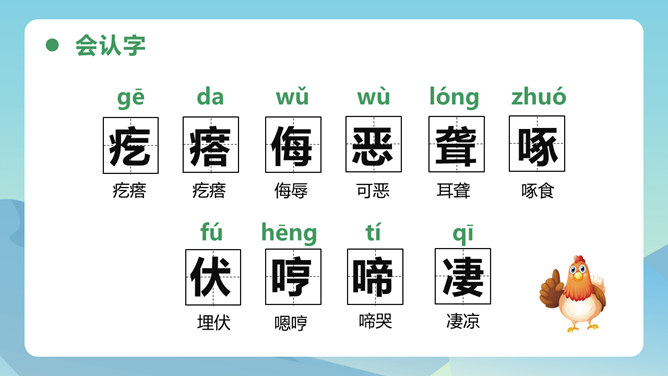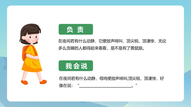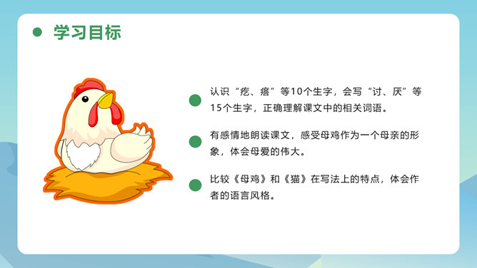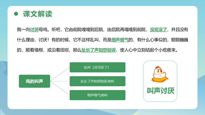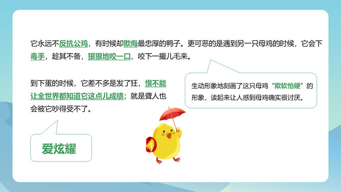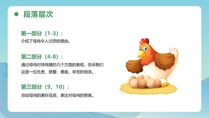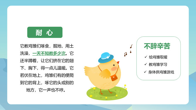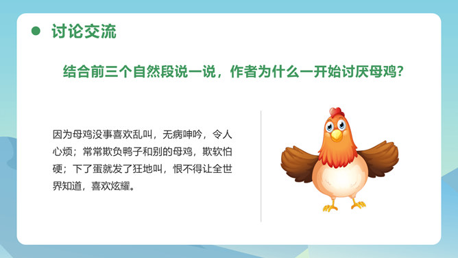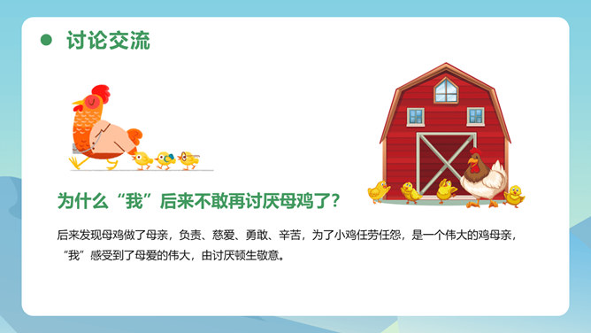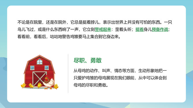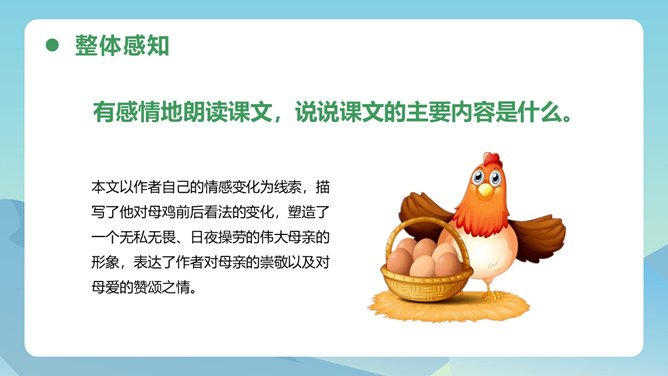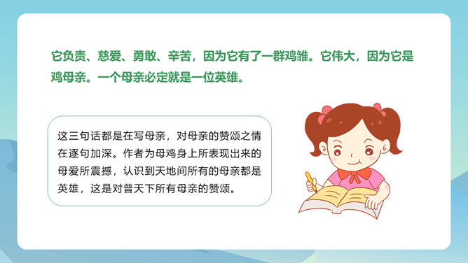 从母鸡的动作、叫声、情态等方面,生动形象地把一只爱护鸡雏的母鸡展现在我们眼前,从中可以体会到母鸡的尽职和勇敢。比喻和对比的巧妙运用,更表现了母鸡对小鸡的疼爱。这三句话都是在写母亲,对母亲的赞颂之情在逐句加深。作者为母鸡身上所表现出来的母爱所震撼,认识到天地间所有的母亲都是英雄,这是对普天下所有母亲的赞颂。后来发现母鸡做了母亲,负责、慈爱、勇敢、辛苦,为了小鸡任劳任怨,是一个伟大的鸡母亲,“我”感受到了母爱的伟大,由讨厌顿生敬意。所属专题:母鸡ppt。