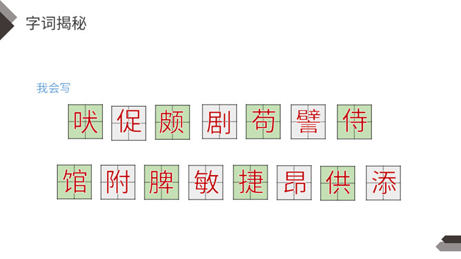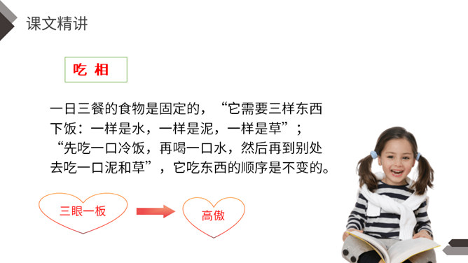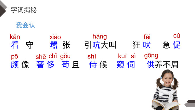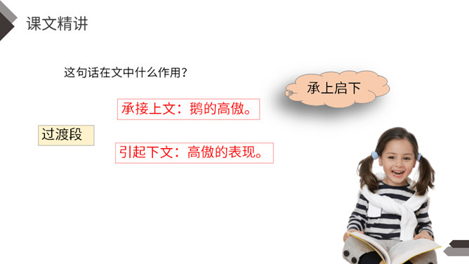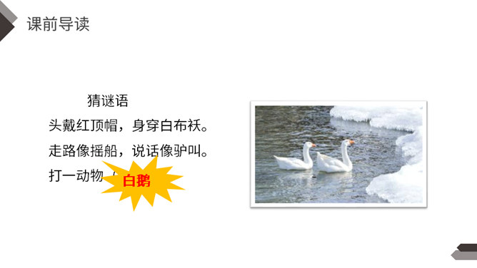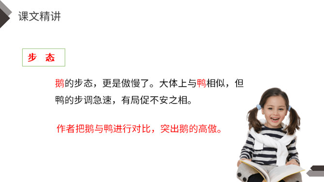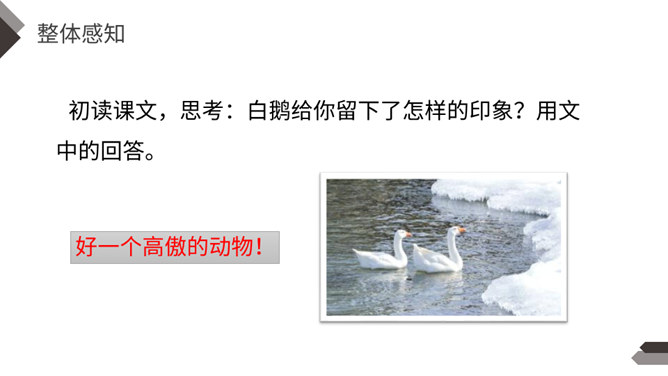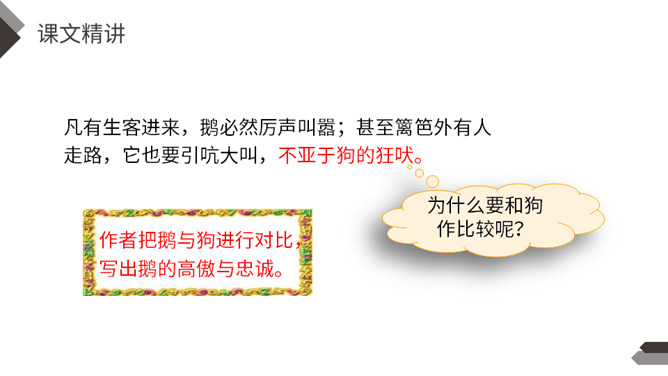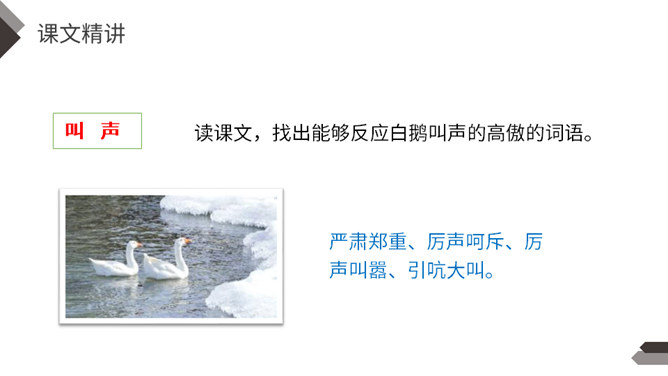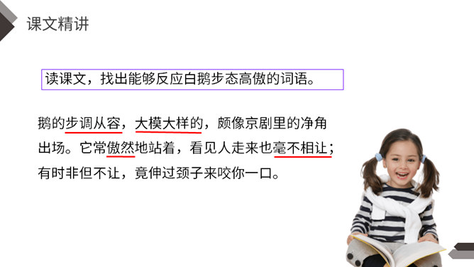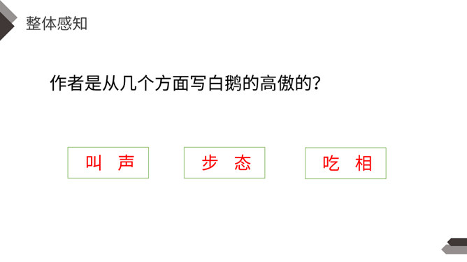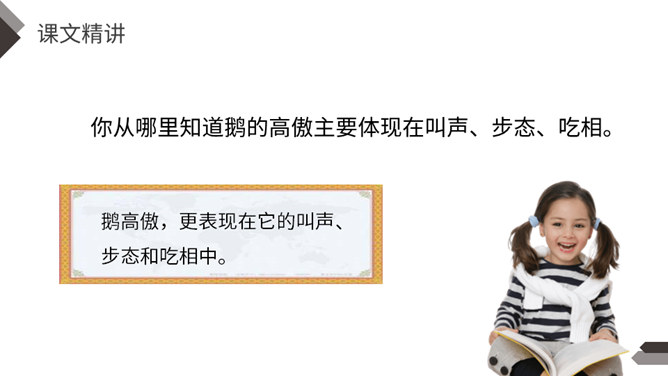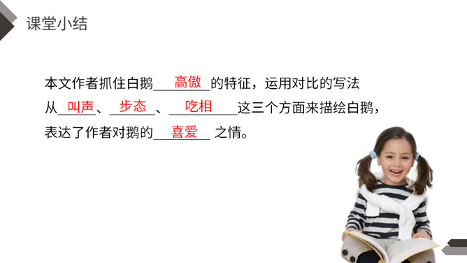 初读课文,思考:白鹅给你留下了怎样的印象?用文中的回答。作者是从几个方面写白鹅的高傲的?你从哪里知道鹅的高傲主要体现在叫声、步态、吃相。鹅高傲,更表现在它的叫声、步态和吃相中。读课文,找出能够反应白鹅叫声的高傲的词语。作者把鹅与狗进行对比,写出鹅的高傲与忠诚。读课文,找出能够反应白鹅步态高傲的词语。造句:夏天的阵雨是个急脾气,来得快去的也快。书写指导:左窄右宽,第十笔是竖撇。所属专题:白鹅ppt。