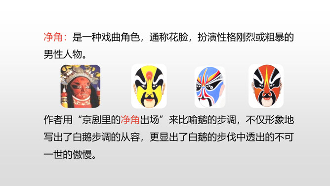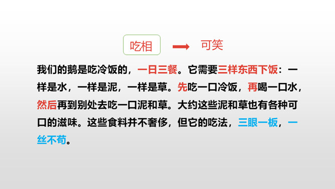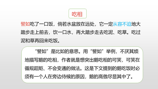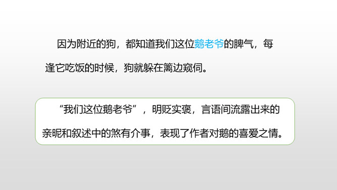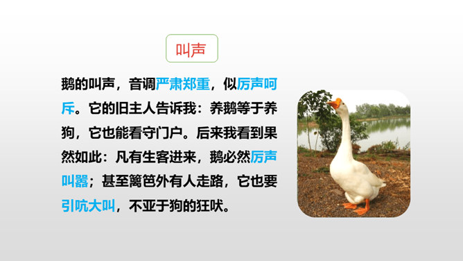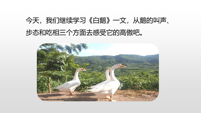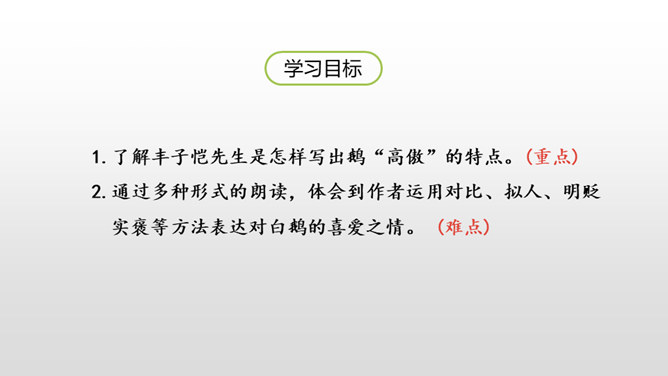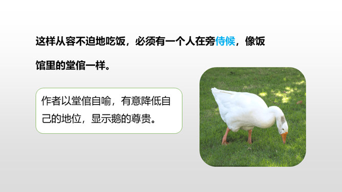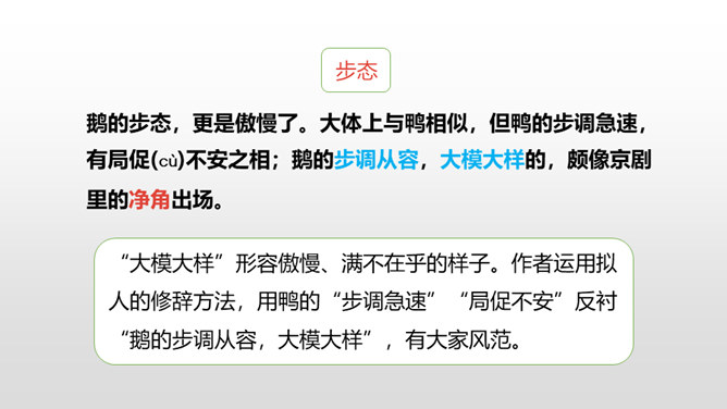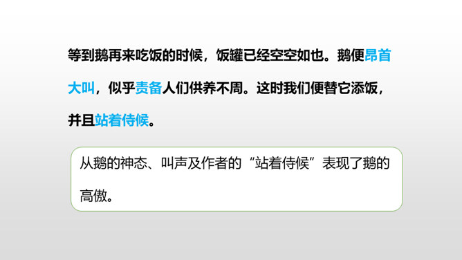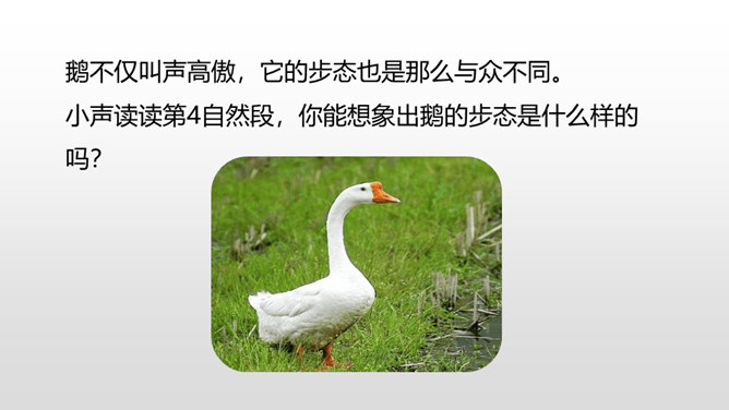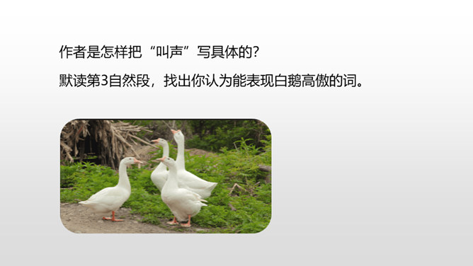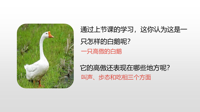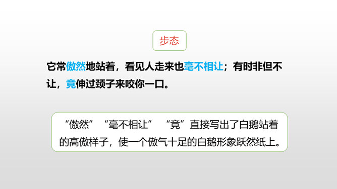 1.了解丰子恺先生是怎样写出鹅“高傲”的特点。(重点)2.通过多种形式的朗读,体会到作者运用对比、拟人、明贬实褒等方法表达对白鹅的喜爱之情。 (难点)通过上节课的学习,这你认为这是一只怎样的白鹅呢?它的高傲还表现在哪些地方呢?叫声、步态和吃相三个方面。今天,我们继续学习《白鹅》一文,从鹅的叫声、步态和吃相三个方面去感受它的高傲吧。作者是怎样把“叫声”写具体的?默读第3自然段,找出你认为能表现白鹅高傲的词。所属专题:白鹅ppt。