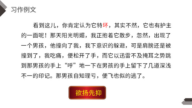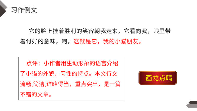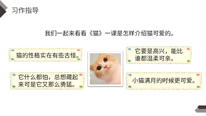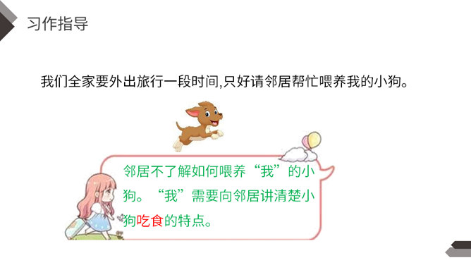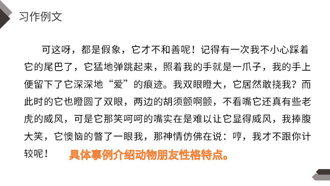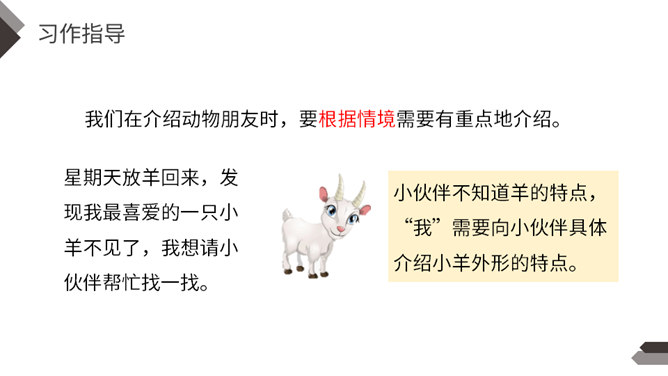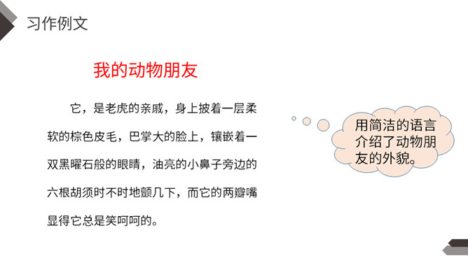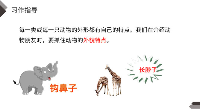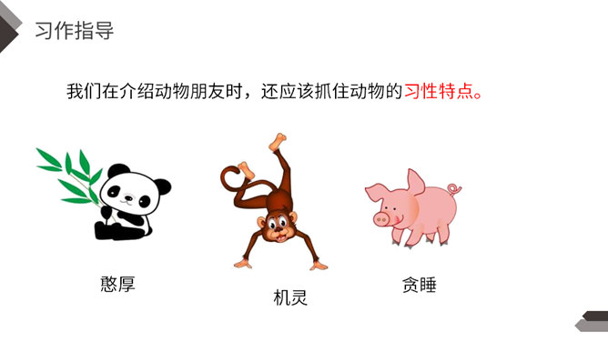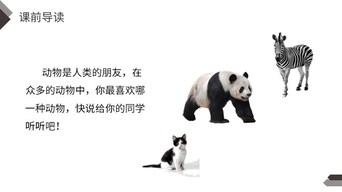 动物是人类的朋友,在众多的动物中,你最喜欢哪一种动物,快说给你的同学听听吧!每一类或每一只动物的外形都有自己的特点。我们在介绍动物朋友时,要抓住动物的外貌特点。我们在介绍动物朋友时,还应该抓住动物的习性特点。我们全家要外出旅行一段时间,只好请邻居帮忙喂养我的小狗。邻居不了解如何喂养“我”的小狗。“我”需要向邻居讲清楚小狗吃食的特点。我们家就要搬到外地去了,我想请一位同学收养我的小猫。所属专题:我的动物朋友ppt。