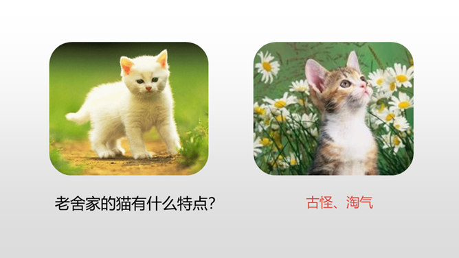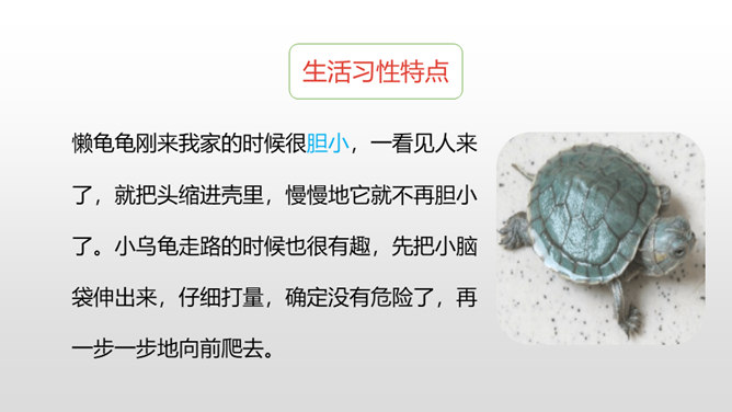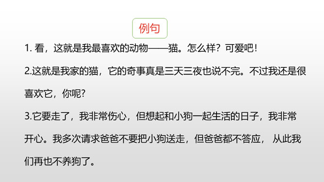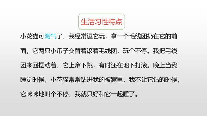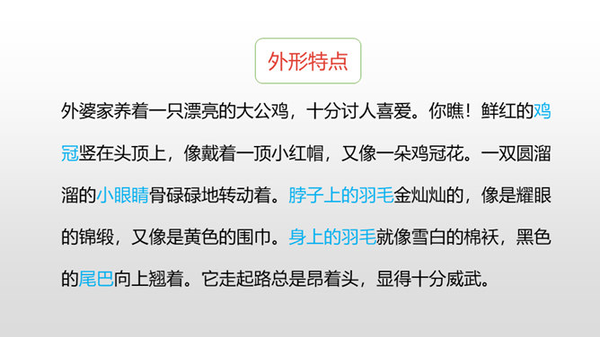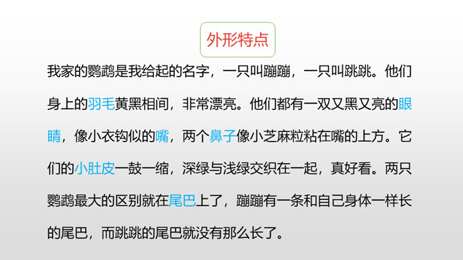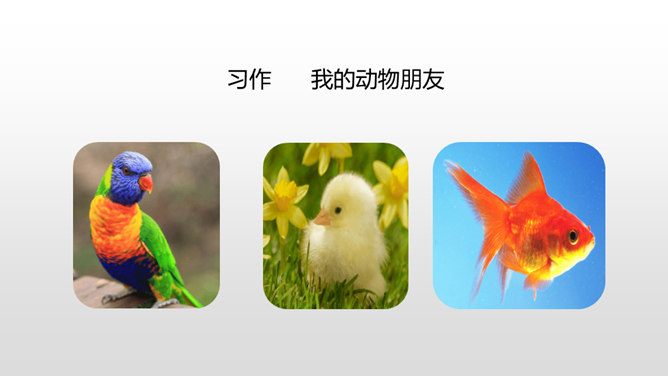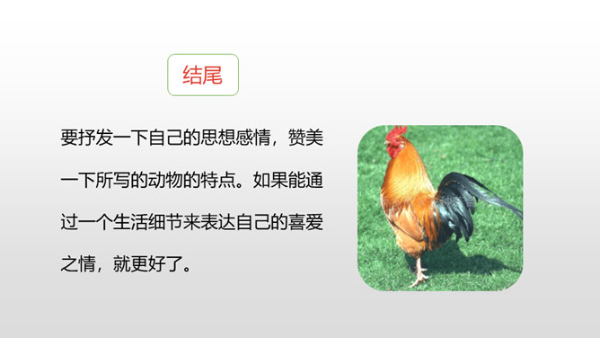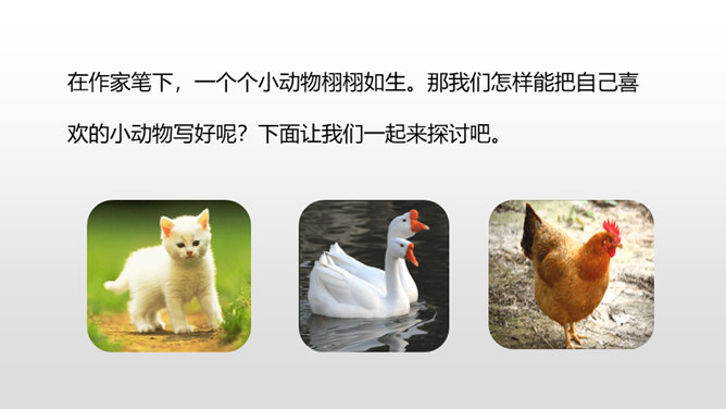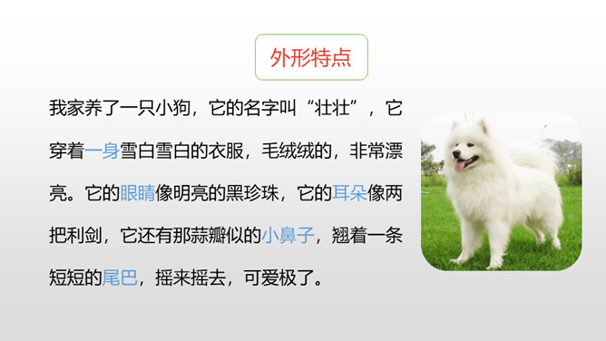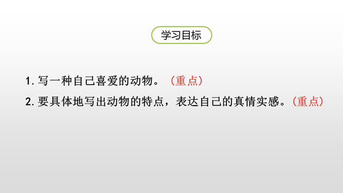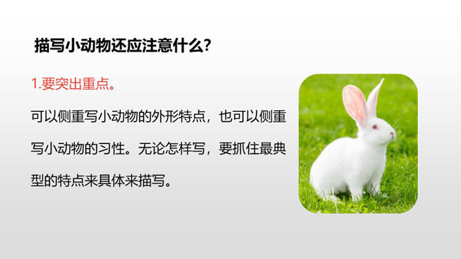 写好动物应该抓住哪些方面的特点呢?(可以结合自己喜欢的动物来说一说)一、外形特点(头部、四肢、尾巴、毛发、身体等)二、生活习性特点(喜好、活动、饮食、脾气等)1.要突出重点。可以侧重写小动物的外形特点,也可以侧重写小动物的习性。无论怎样写,要抓住最典型的特点来具体来描写。2.要细致地描写。准确地使用形容词、动词,再现出小动物外形特点和活动情景。3.要条理清楚。部分到整体,总分结构。所属专题:我的动物朋友ppt。