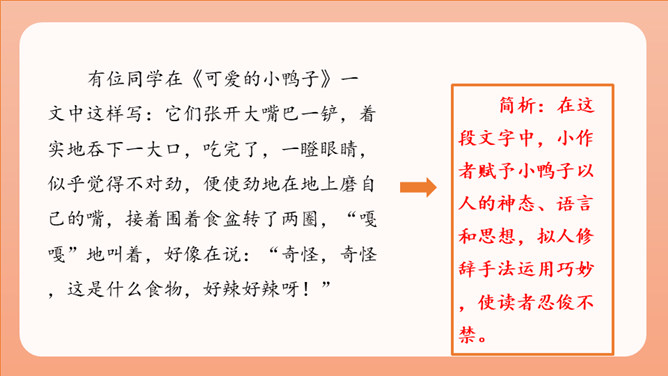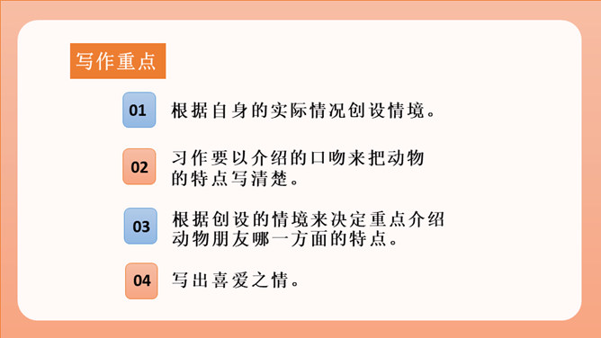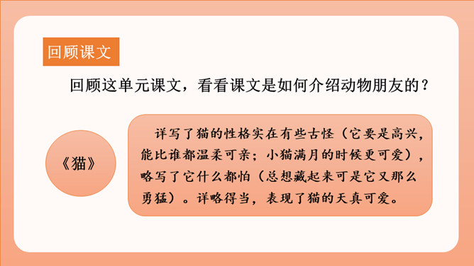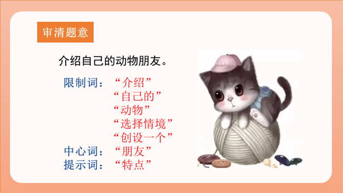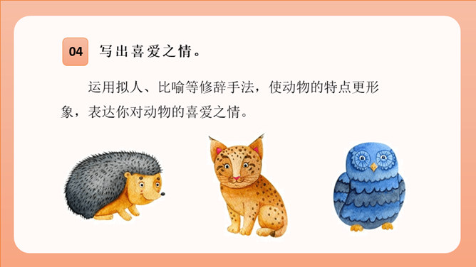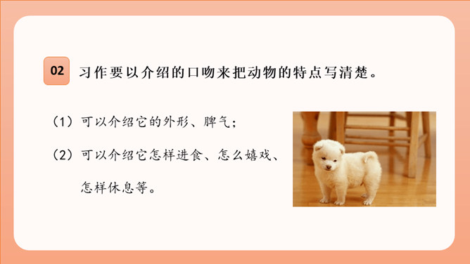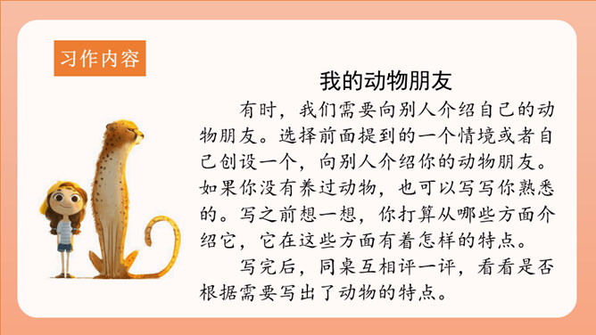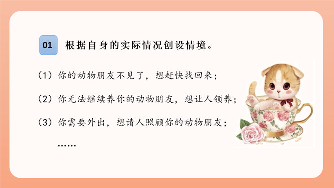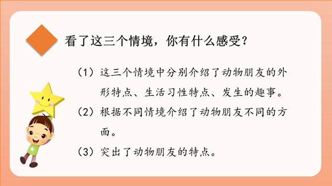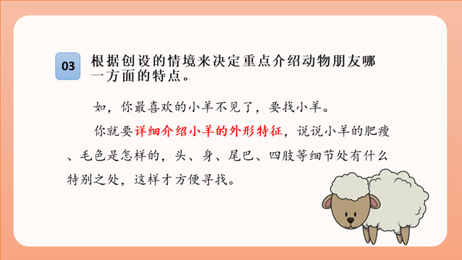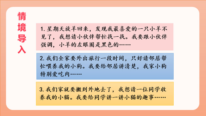 1.星期天放羊回来,发现我最喜爱的一只小羊不见了,我想请小伙伴帮忙找一找。我要跟小伙伴强调,小羊的左眼圈是黑色的……2.我们全家要外出旅行一段时间,只好请邻居帮忙喂养我的小狗。我要给邻居讲清楚,我家小狗特别爱吃肉……3.我们家就要搬到外地去了,我想请一位同学收养我的小猫。我要给同学讲一讲小猫的趣事……看了这三个情境,你有什么感受?这三个情境中分别介绍了动物朋友的外形特点、生活习性特点、发生的趣事。所属专题:我的动物朋友ppt。