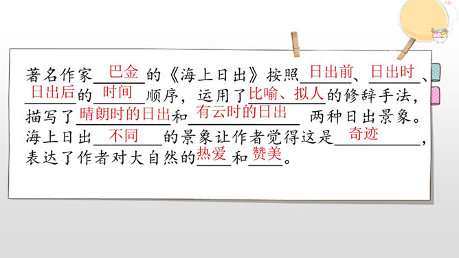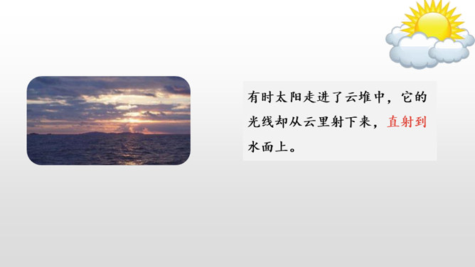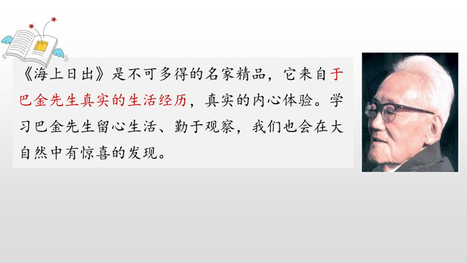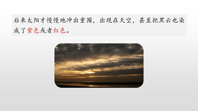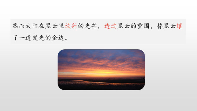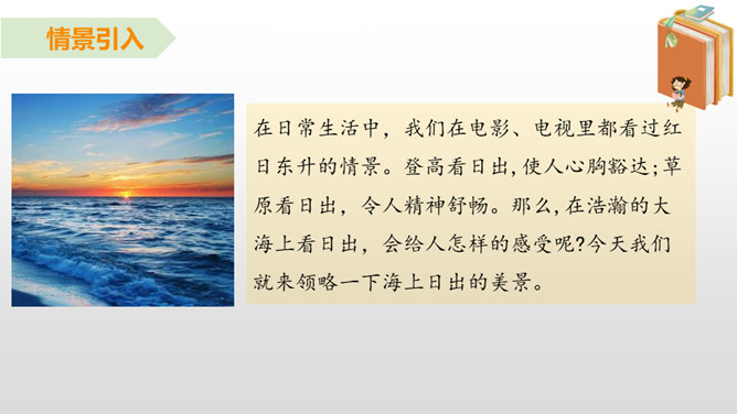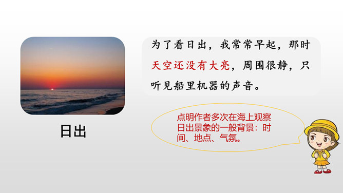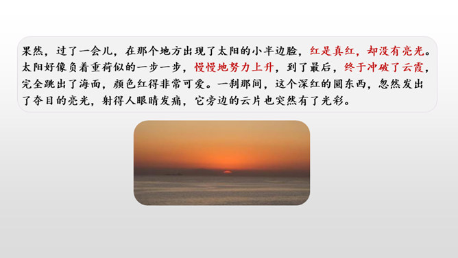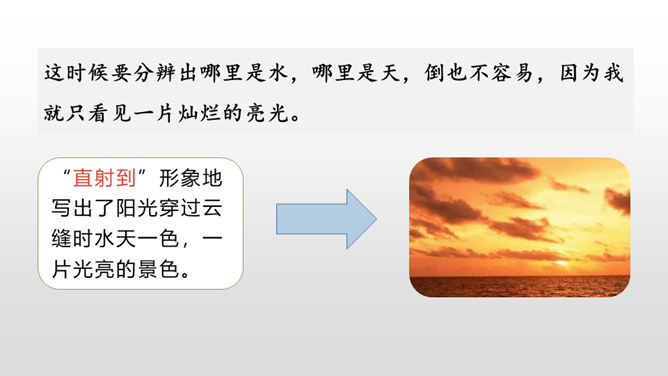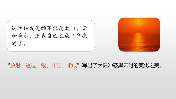 在日常生活中,我们在电影、电视里都看过红日东升的情景。登高看日出,使人心胸豁达;草原看日出,令人精神舒畅。那么,在浩瀚的大海上看日出,会给人怎样的感受呢?今天我们就来领略一下海上日出的美景。点明作者多次在海上观察日出景象的一般背景:时间、地点、气氛。“直射到”形象地写出了阳光穿过云缝时水天一色,一片光亮的景色。“放射、透过、镶、冲出、染成”写出了太阳冲破黑云时的变化之美。所属专题:海上日出ppt。