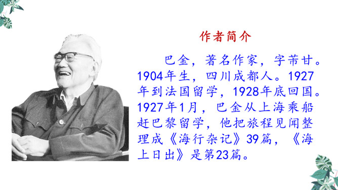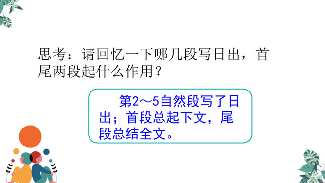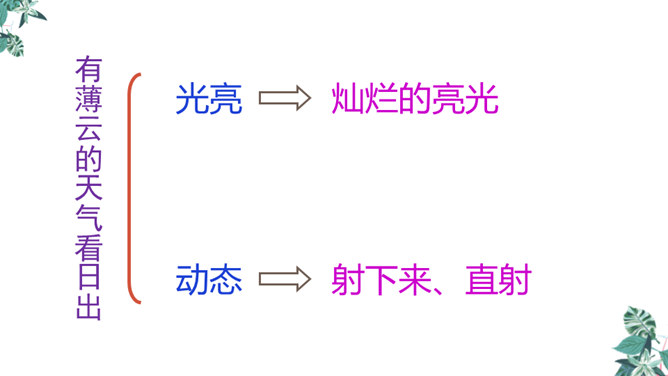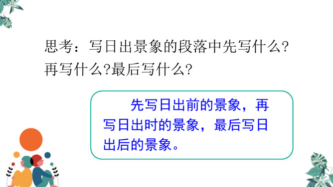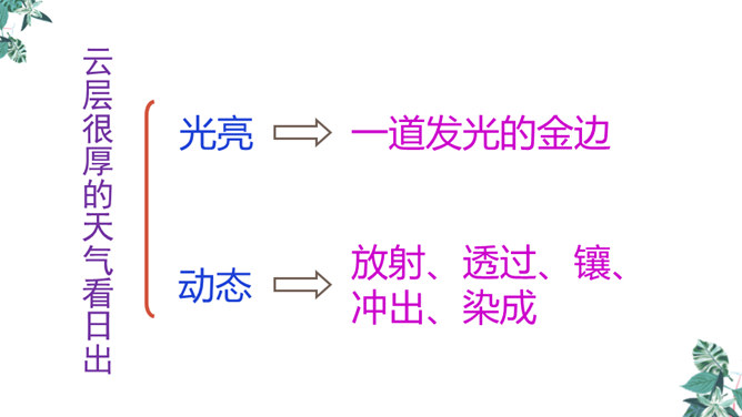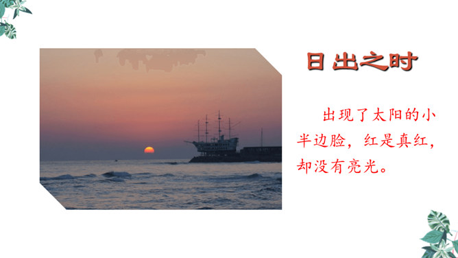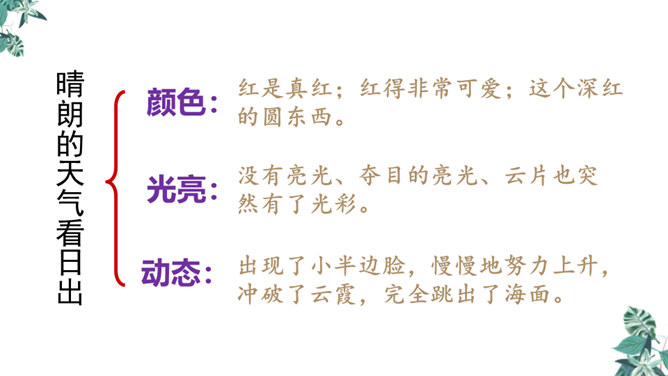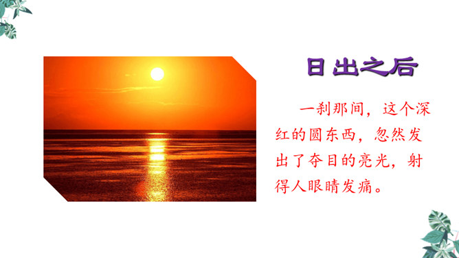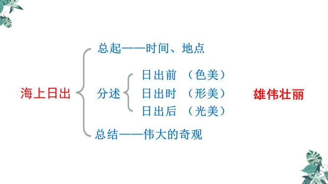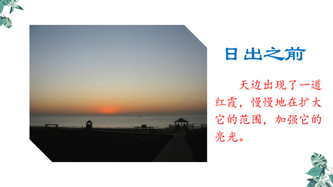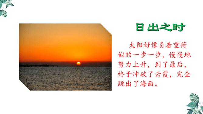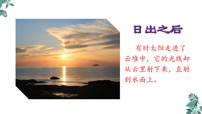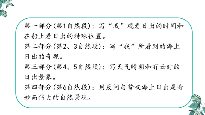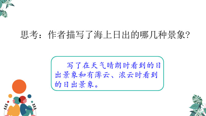 思考:作者描写了海上日出的哪几种景象? 写了在天气晴朗时看到的日出景象和有薄云、浓云时看到的日出景象。思考:请回忆一下哪几段写日出,首尾两段起什么作用?第2~5自然段写了日出;首段总起下文,尾段总结全文。思考:写日出景象的段落中先写什么?再写什么?最后写什么? 先写日出前的景象,再写日出时的景象,最后写日出后的景象。思考:课文可以分为几个部分,试着说一说。所属专题:海上日出ppt。