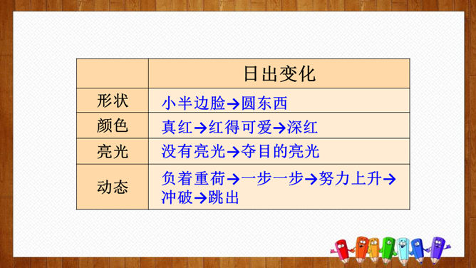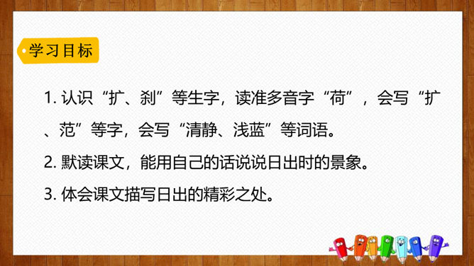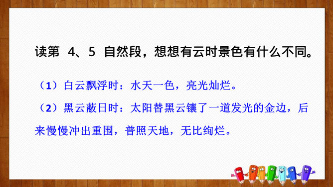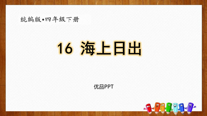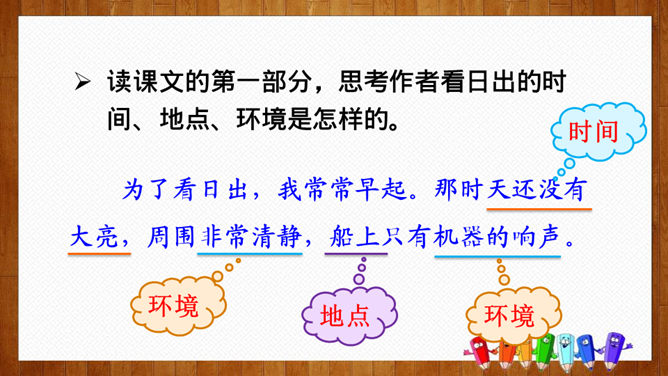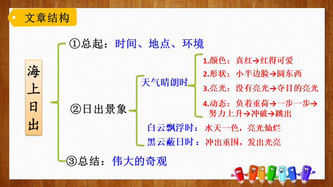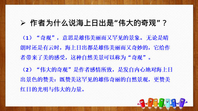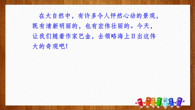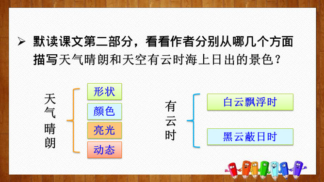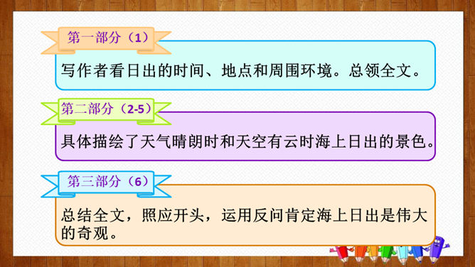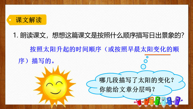 朗读课文,想想这篇课文是按照什么顺序描写日出景象的?按照太阳升起的时间顺序(或按照早晨太阳变化的顺序)描写的。哪几段描写了太阳的变化?你能给文章分层吗?第一部分(1)写作者看日出的时间、地点和周围环境。总领全文。第二部分(2-5)具体描绘了天气晴朗时和天空有云时海上日出的景色。第三部分(6)总结全文,照应开头,运用反问肯定海上日出是伟大的奇观。所属专题:海上日出ppt。