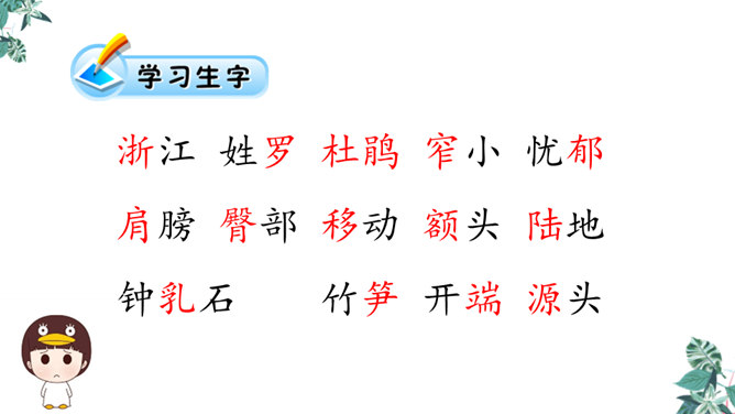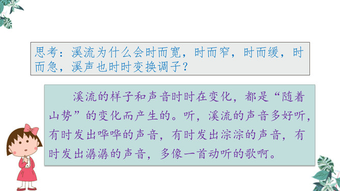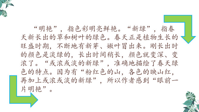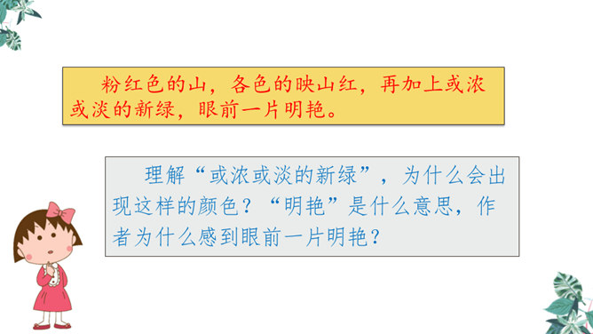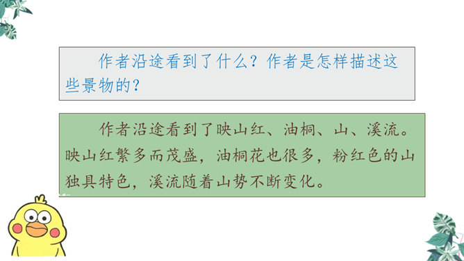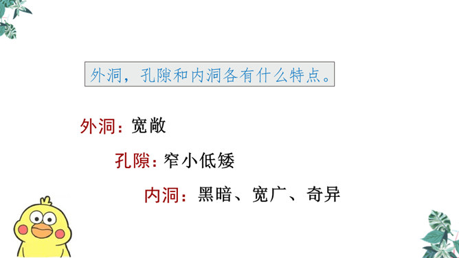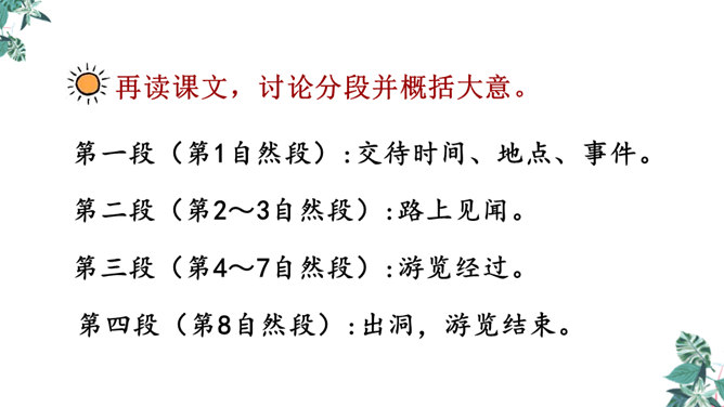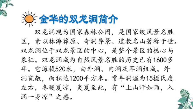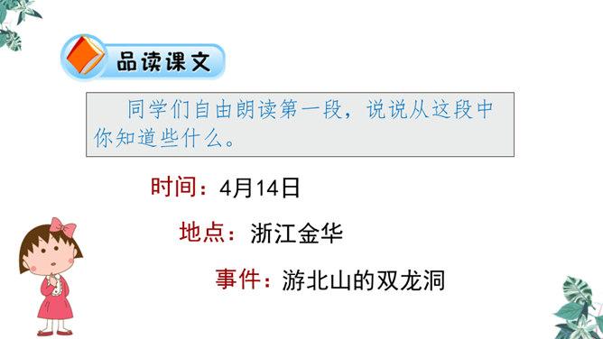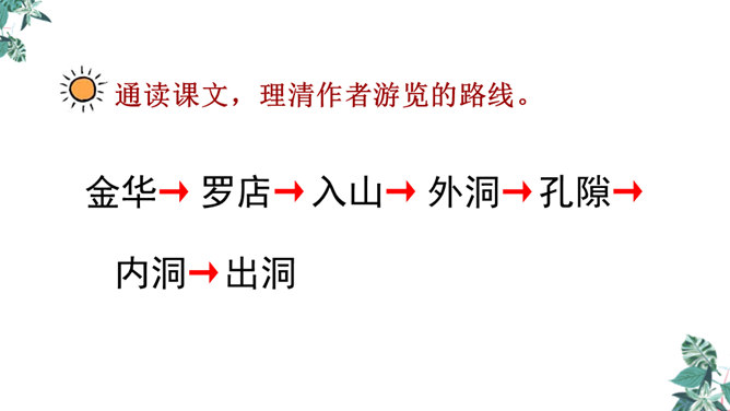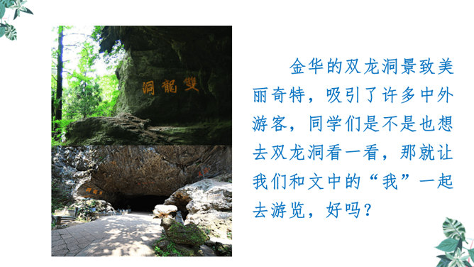 金华的双龙洞景致美丽奇特,吸引了许多中外游客,同学们是不是也想去双龙洞看一看,那就让我们和文中的“我”一起去游览,好吗?同学们自由朗读第一段,说说从这段中你知道些什么。作者沿途看到了什么?作者是怎样描述这些景物的?作者沿途看到了映山红、油桐、山、溪流。映山红繁多而茂盛,油桐花也很多,粉红色的山独具特色,溪流随着山势不断变化。理解“或浓或淡的新绿”,为什么会出现这样的颜色?“明艳”是什么意思,作者为什么感到眼前一片明艳?所属专题:记金华的双龙洞ppt。