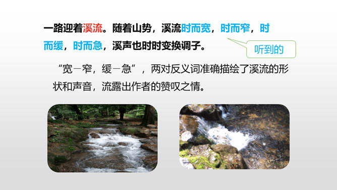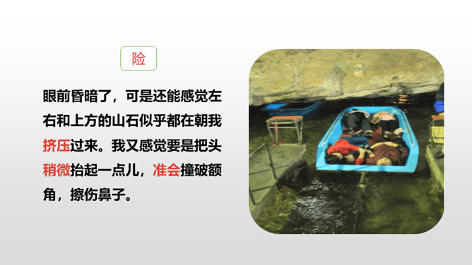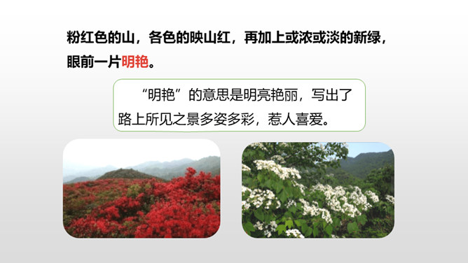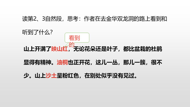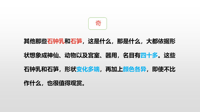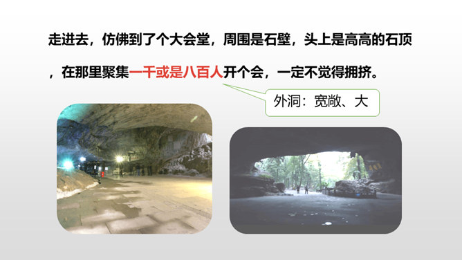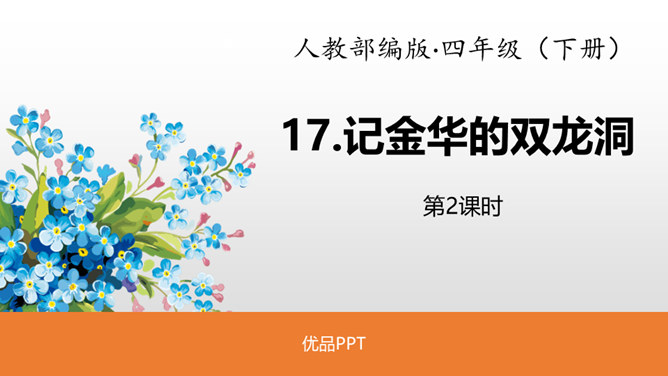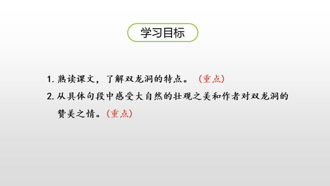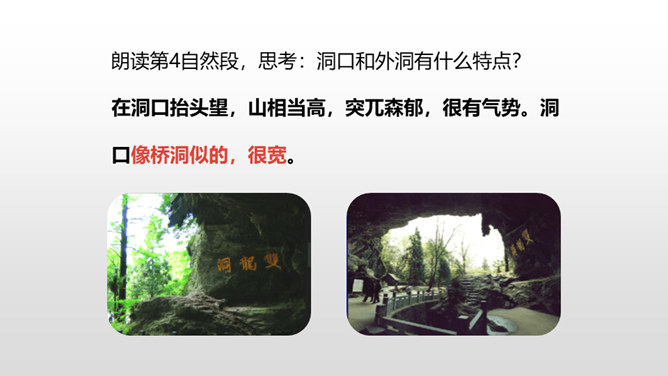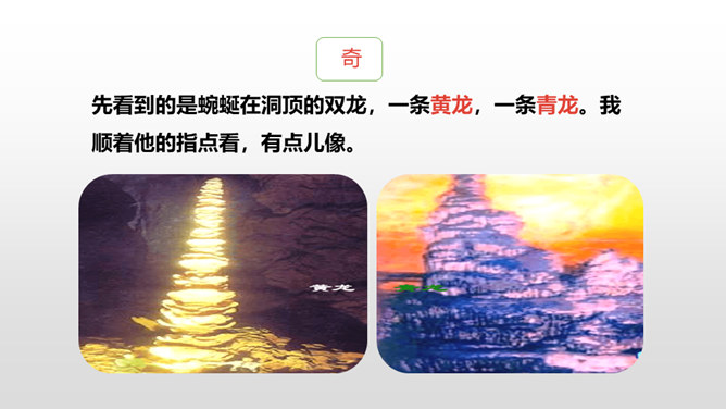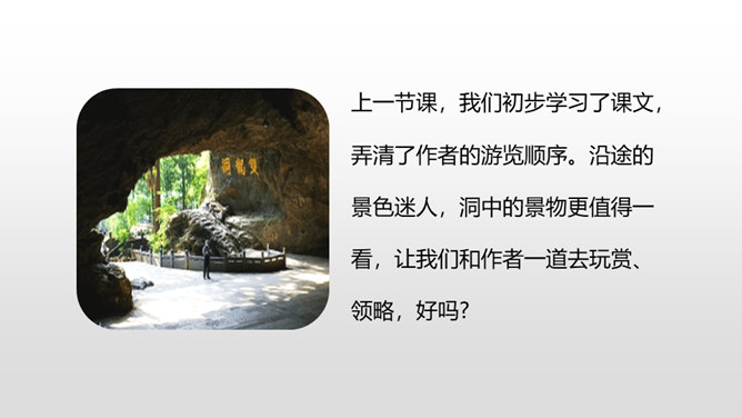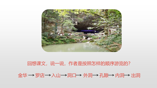 熟读课文,了解双龙洞的特点。从具体句段中感受大自然的壮观之美和作者对双龙洞的赞美之情。回想课文,说一说,作者是按照怎样的顺序游览的?上一节课,我们初步学习了课文,弄清了作者的游览顺序。沿途的景色迷人,洞中的景物更值得一看,让我们和作者一道去玩赏、领略,好吗?读第2、3自然段,思考:作者在去金华双龙洞的路上看到和听到了什么?“明艳”的意思是明亮艳丽,写出了路上所见之景多姿多彩,惹人喜爱。所属专题:记金华的双龙洞ppt。