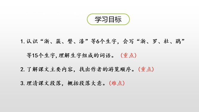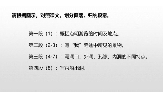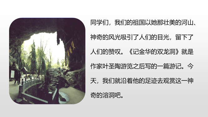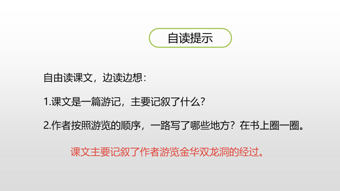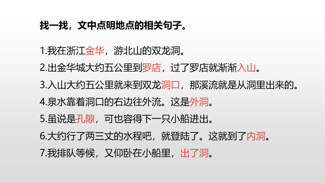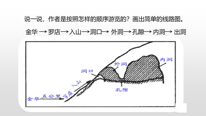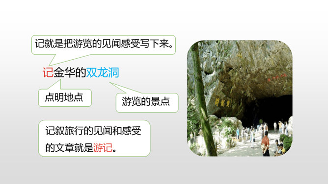 1.认识“浙、簇、臀、漆”等6个生字,会写“浙、罗、杜、鹃”等15个生字,理解生字组成的词语。 (重点)2.了解课文主要内容,找出作者的游览顺序。(重点) 3.理清课文段落,概括段落大意。(难点)同学们,我们的祖国以她那壮美的河山、神奇的风光吸引了人们的目光,留下了人们的赞叹。今天,我们就沿着他的足迹去观赏这一神奇的溶洞吧。自由读课文,边读边想:1.课文是一篇游记,主要记叙了什么?2.作者按照游览的顺序,一路写了哪些地方?在书上圈一圈。所属专题:记金华的双龙洞ppt。