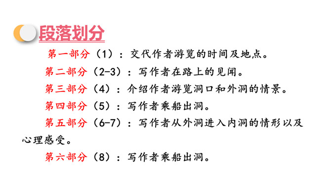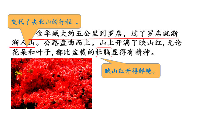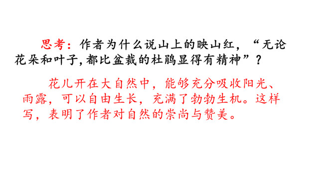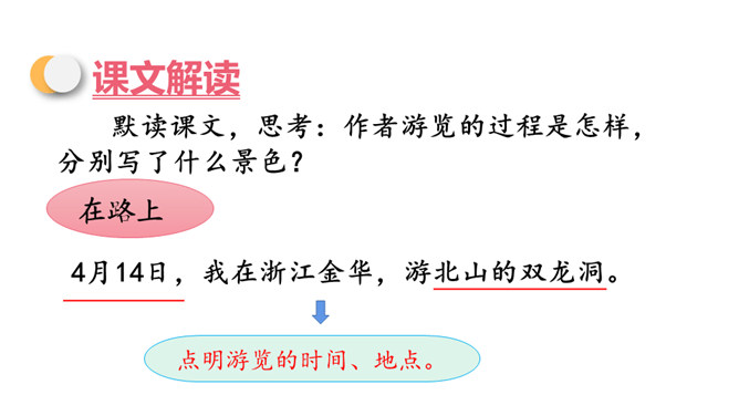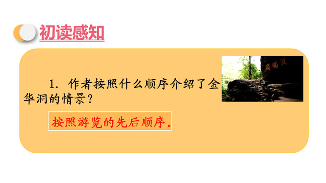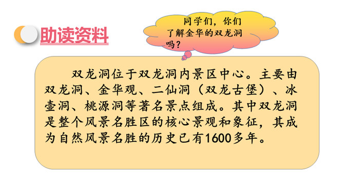 同学们,你们知道图片展示的是什么地方吗?对了,它就是金华的双龙洞。今天,我们就跟随叶圣陶老先生一起去游览一番。默读课文,思考:作者游览的过程是怎样,分别写了什么景色?思考:作者为什么说山上的映山红,“无论花朵和叶子,都比盆裁的杜鹃显得有精神”?花儿开在大自然中,能够充分吸收阳光、雨露,可以自由生长,充满了勃勃生机。这样写,表明了作者对自然的崇尚与赞美。所属专题:记金华的双龙洞ppt。