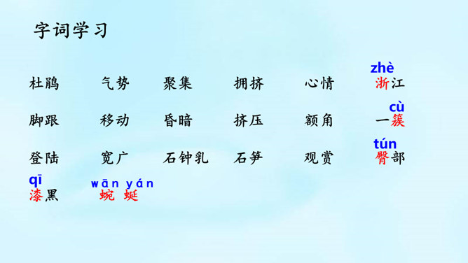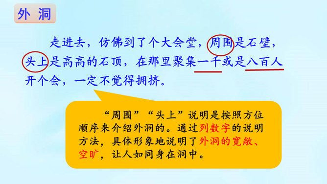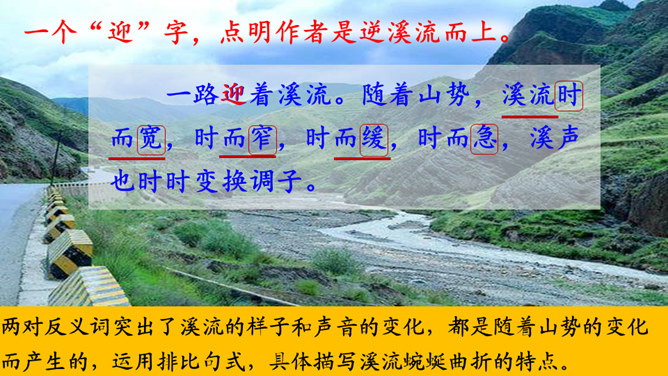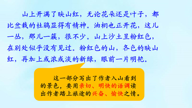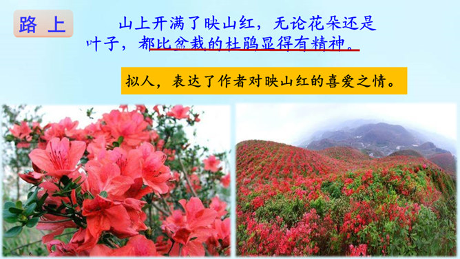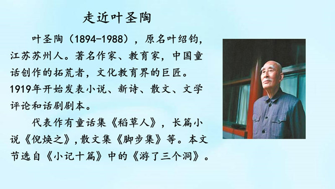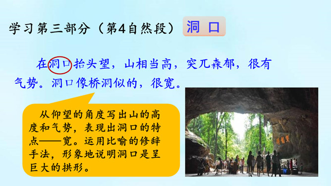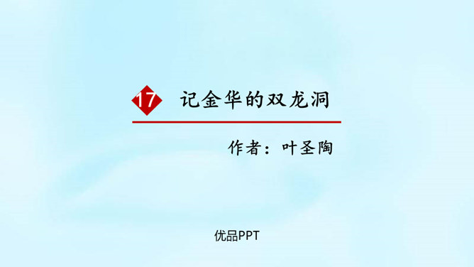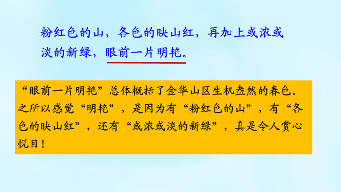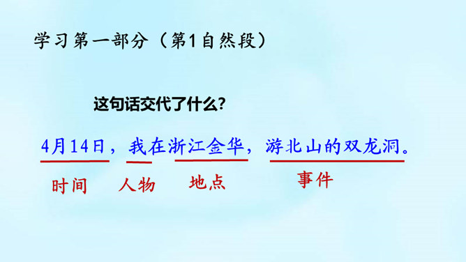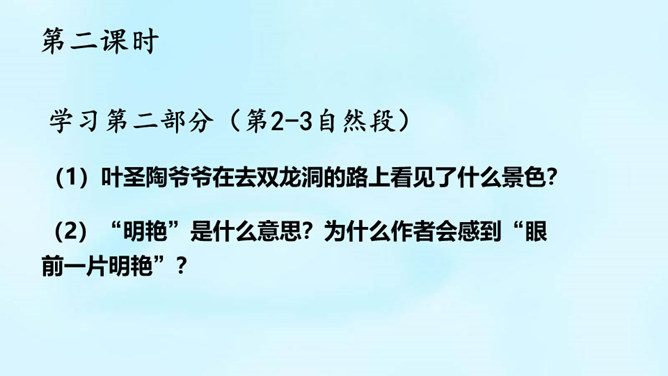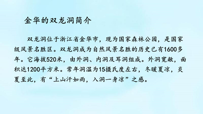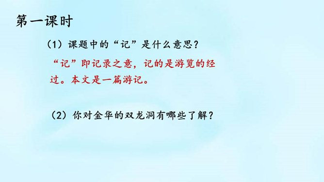 (1)课题中的“记”是什么意思?“记”即记录之意,记的是游览的经过。本文是一篇游记。(2)你对金华的双龙洞有哪些了解?学习第二部分(第2-3自然段)(1)叶圣陶爷爷在去双龙洞的路上看见了什么景色?(2)“明艳”是什么意思?为什么作者会感到“眼前一片明艳”?“眼前一片明艳”总体概括了金华山区生机盎然的春色。之所以感觉“明艳”,是因为有“粉红色的山”,有“各色的映山红”,还有“或浓或淡的新绿”,真是令人赏心悦目!所属专题:记金华的双龙洞ppt。