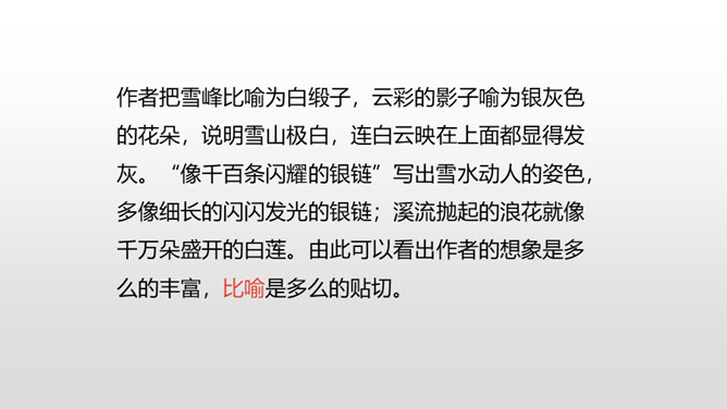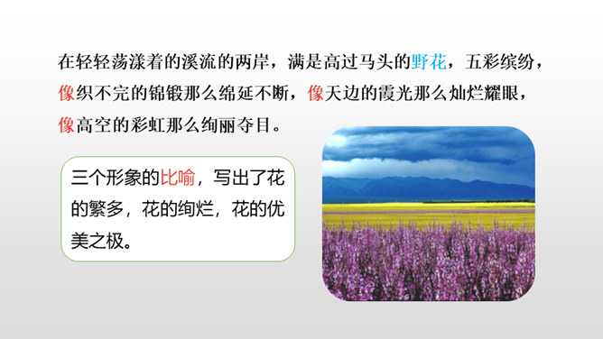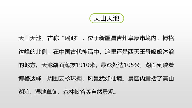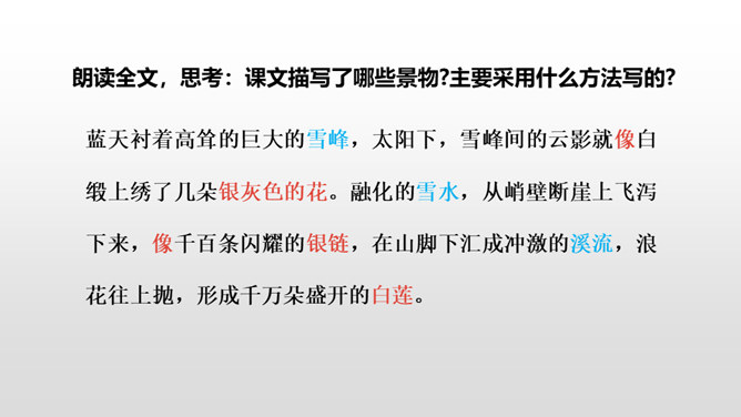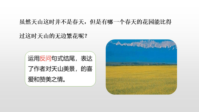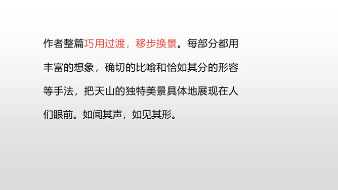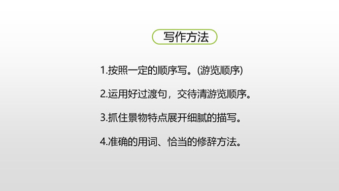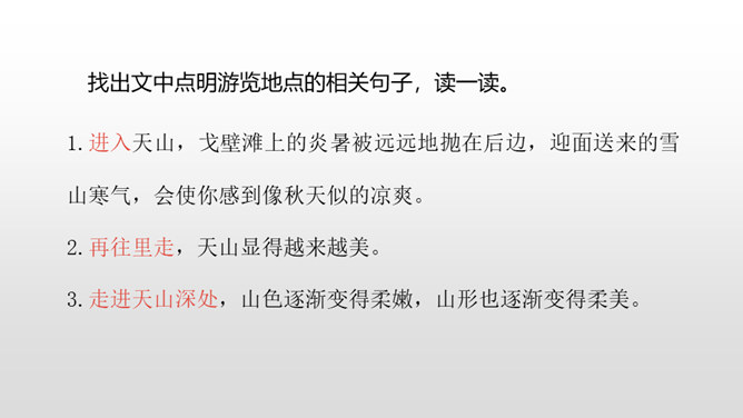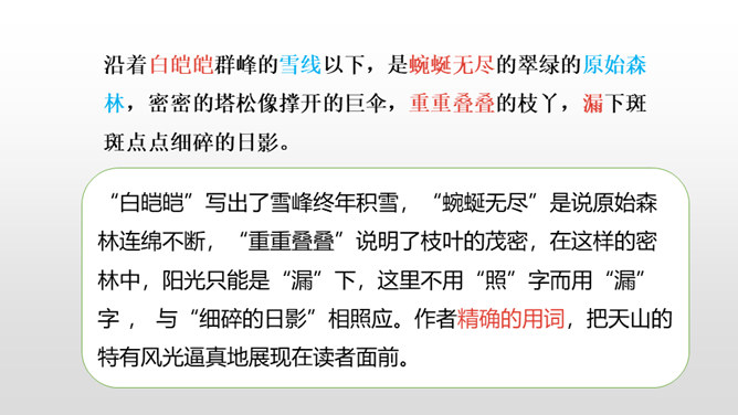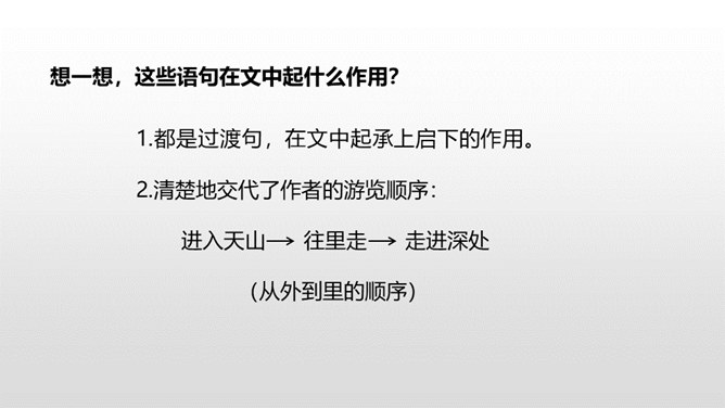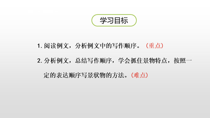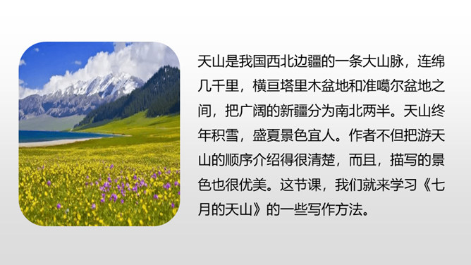 1.阅读例文,分析例文中的写作顺序。 (重点)2.分析例文,总结写作顺序,学会抓住景物特点,按照一定的表达顺序写景状物的方法。(难点) 天山是我国西北边疆的一条大山脉,连绵几千里,横亘塔里木盆地和准噶尔盆地之间,把广阔的新疆分为南北两半。天山终年积雪,盛夏景色宜人。作者不但把游天山的顺序介绍得很清楚,而且,描写的景色也很优美。这节课,我们就来学习《七月的天山》的一些写作方法。