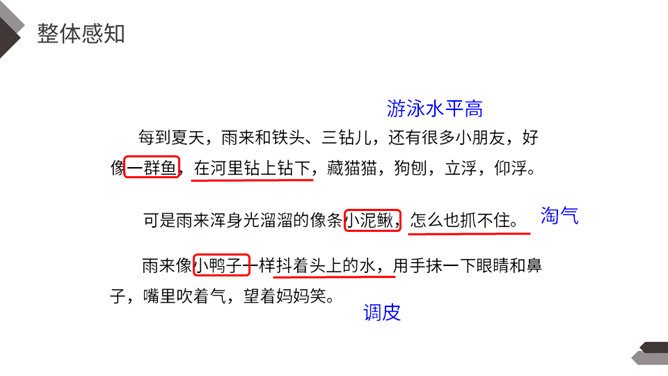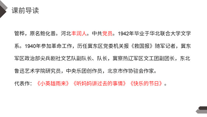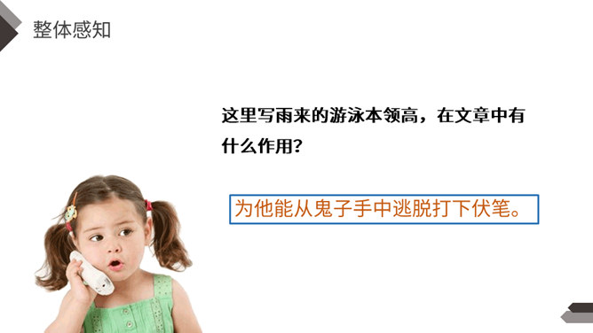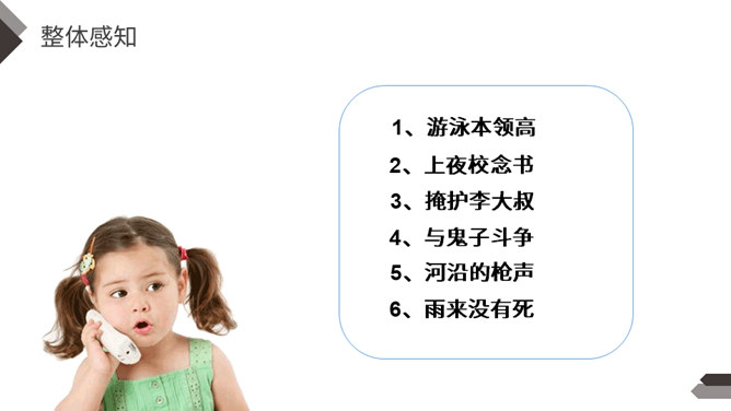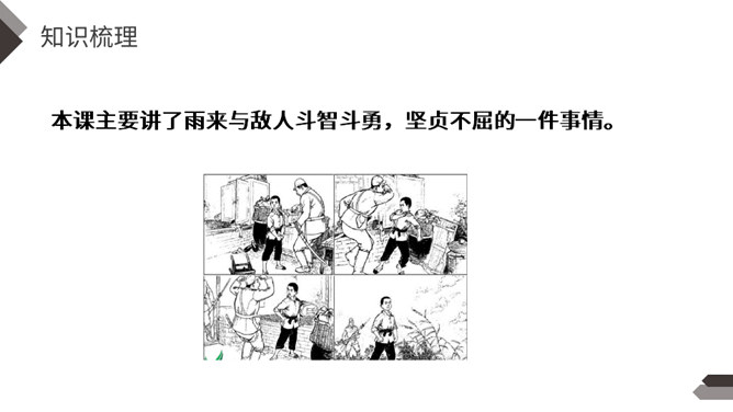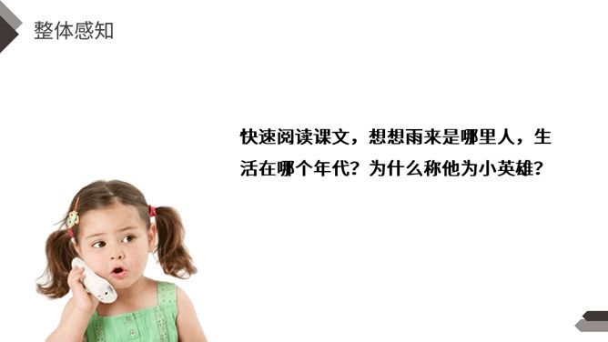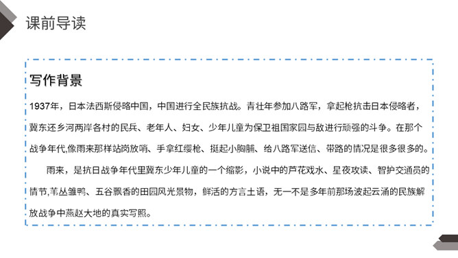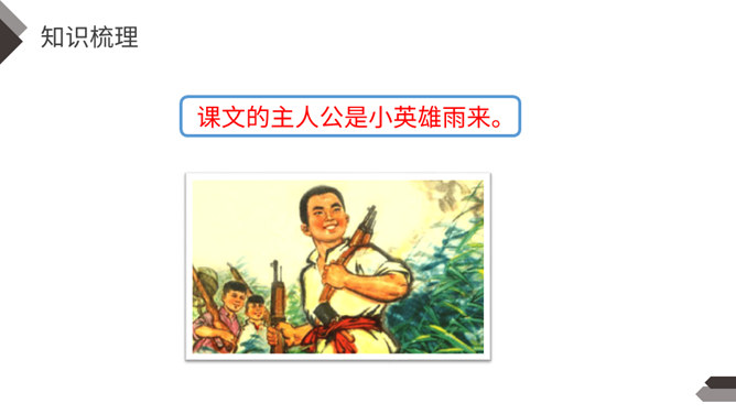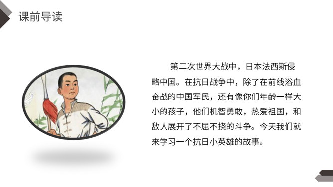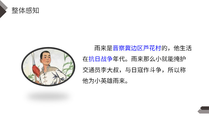 在抗日战争中,除了在前线浴血奋战的中国军民,还有像你们年龄一样大小的孩子,他们机智勇敢,热爱祖国,和敌人展开了不屈不挠的斗争。今天我们就来学习一个抗日小英雄的故事。雨来,是抗日战争年代里冀东少年儿童的一个缩影,小说中的芦花戏水、星夜攻读、智护交通员的情节,苇丛雏鸭、五谷飘香的田园风光景物,鲜活的方言土语,无一不是多年前那场波起云涌的民族解放战争中燕赵大地的真实写照。所属专题:小英雄雨来ppt。