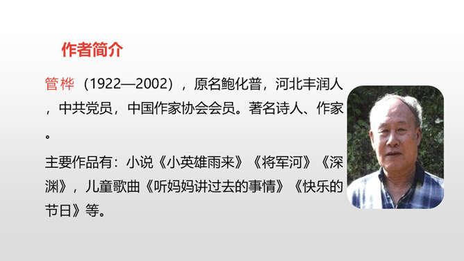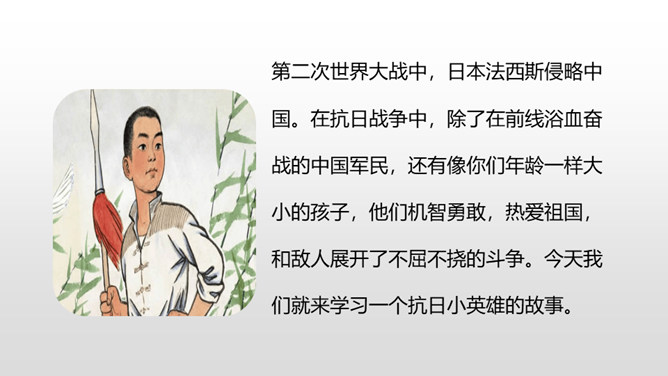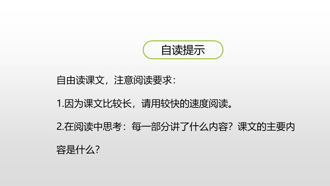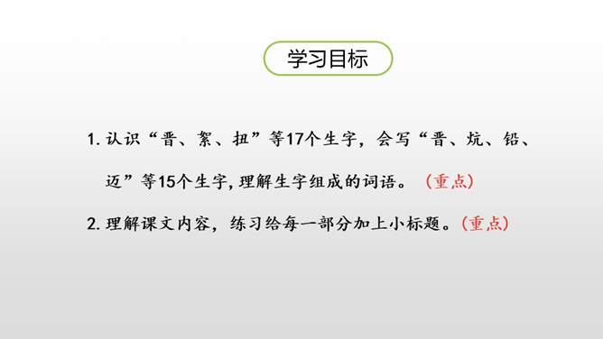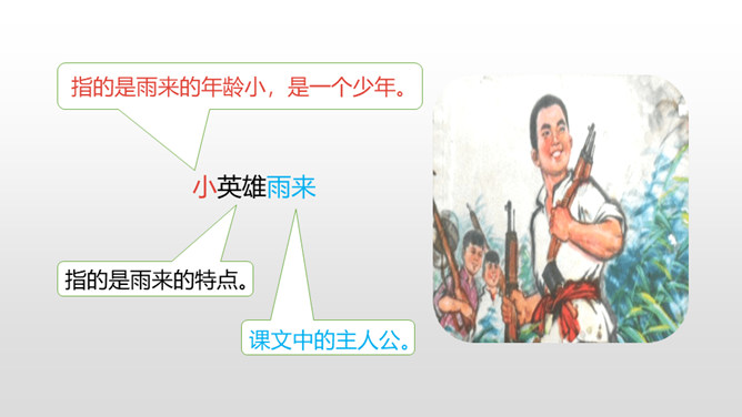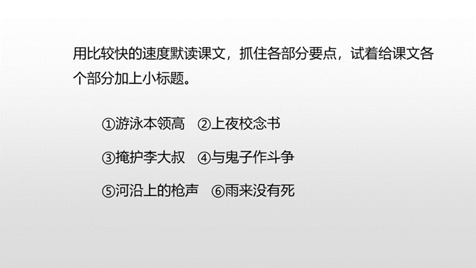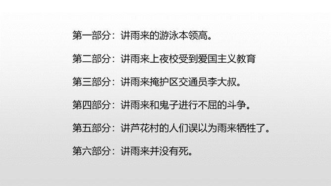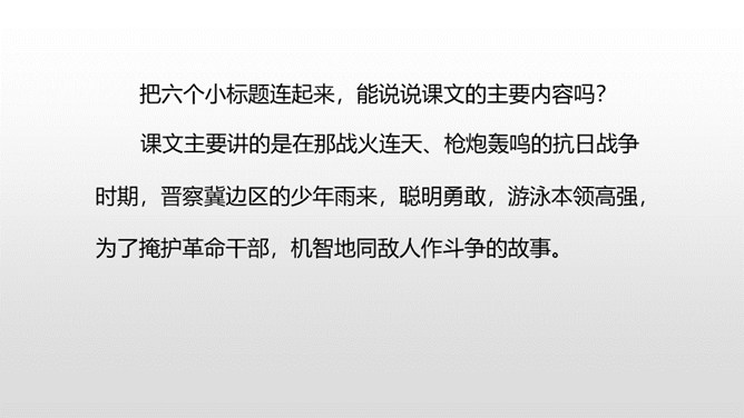 自由读课文,注意阅读要求: 1.因为课文比较长,请用较快的速度阅读。2.在阅读中思考:每一部分讲了什么内容?课文的主要内容是什么? 1.认识“晋、絮、扭”等17个生字,会写“晋、炕、铅、迈”等15个生字,理解生字组成的词语。 (重点)2.理解课文内容,练习给每一部分加上小标题。(重点)第一部分:讲雨来的游泳本领高。第二部分:讲雨来上夜校受到爱国主义教育。第三部分:讲雨来掩护区交通员李大叔。所属专题:小英雄雨来ppt。