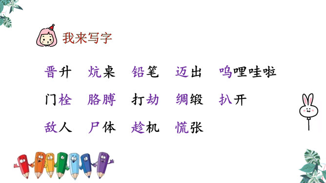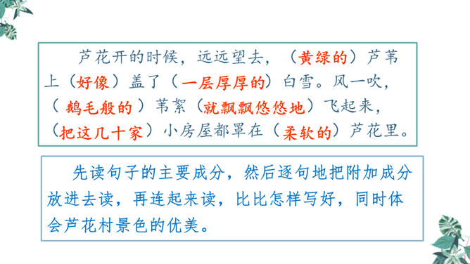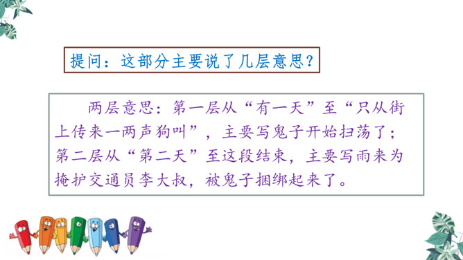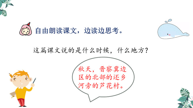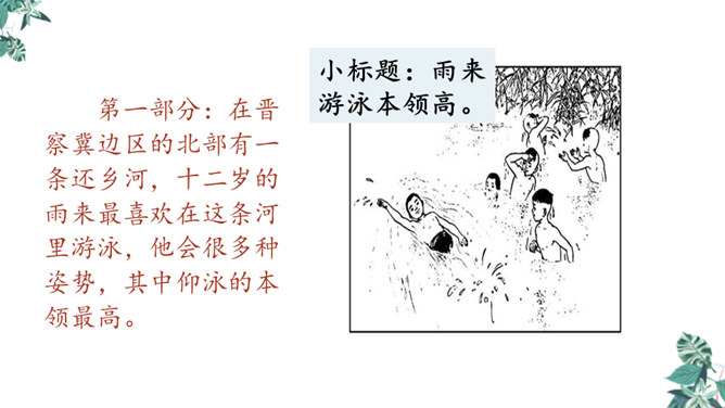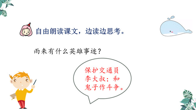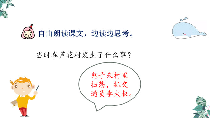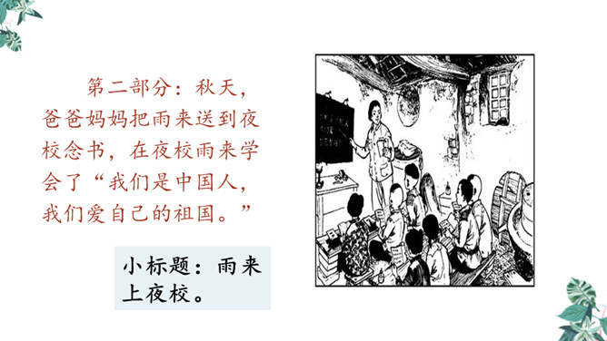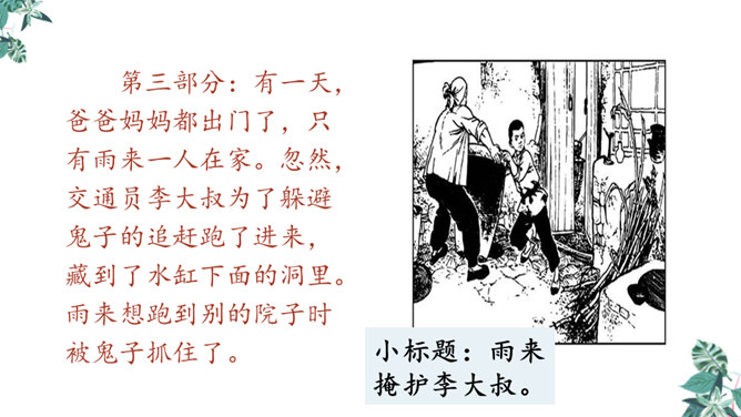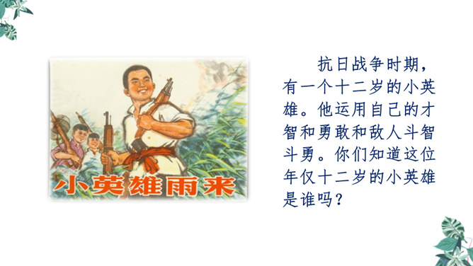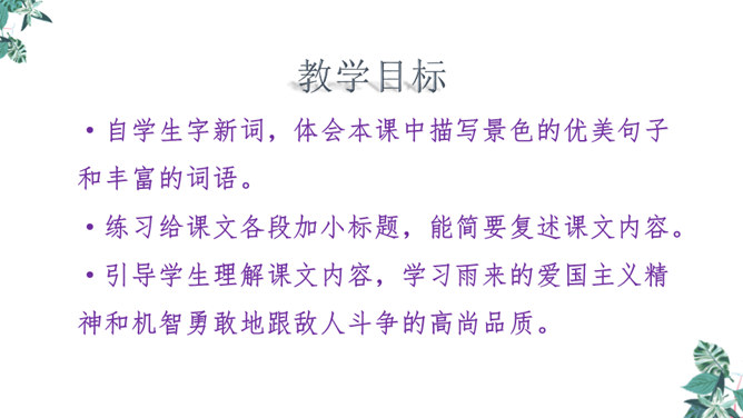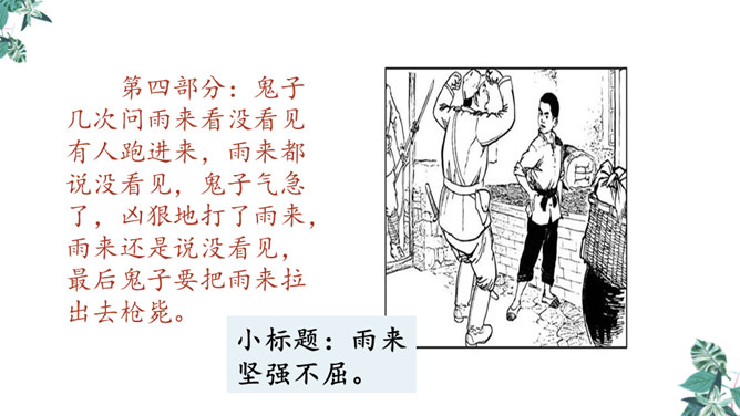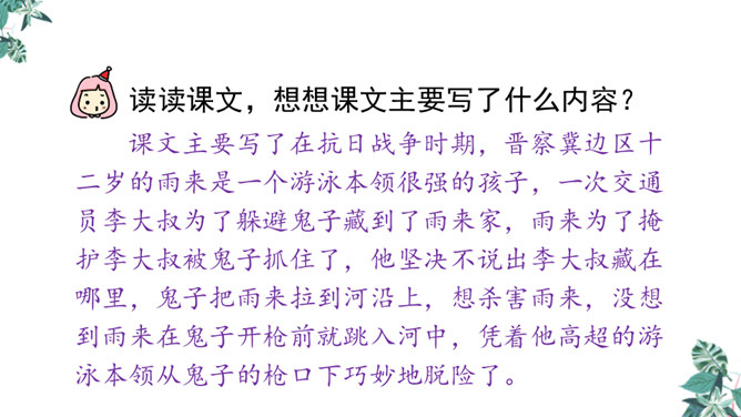 自学生字新词,体会本课中描写景色的优美句子和丰富的词语。练习给课文各段加小标题,能简要复述课文内容。引导学生理解课文内容,学习雨来的爱国主义精神和机智勇敢地跟敌人斗争的高尚品质。先读句子的主要成分,然后逐句地把附加成分放进去读,再连起来读,比比怎样写好,同时体会芦花村景色的优美。两层意思:第一层从“有一天”至“只从街上传来一两声狗叫”,主要写鬼子开始扫荡了;第二层从“第二天”至这段结束,主要写雨来为掩护交通员李大叔,被鬼子捆绑起来了。所属专题:小英雄雨来ppt。
