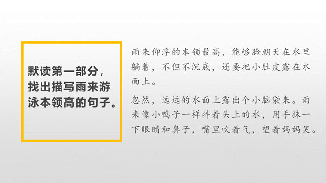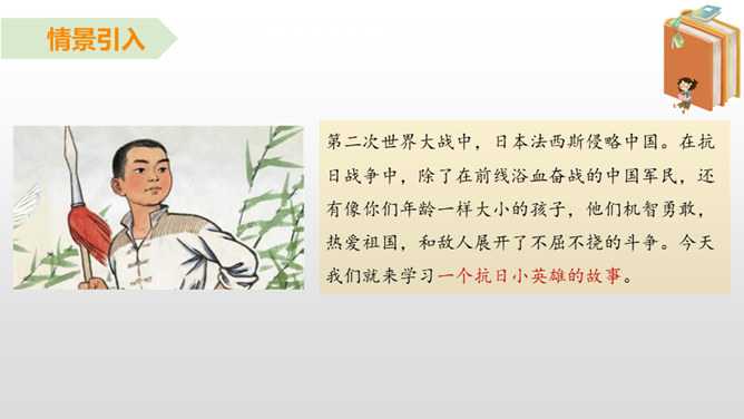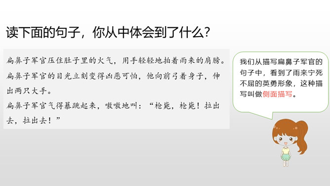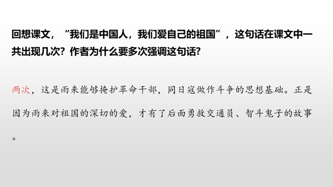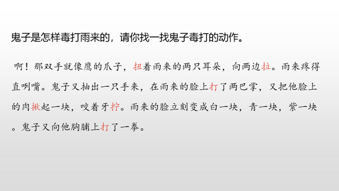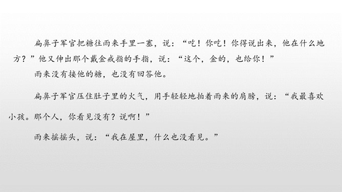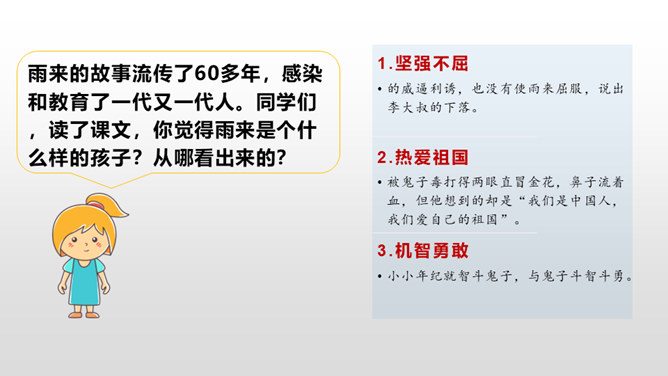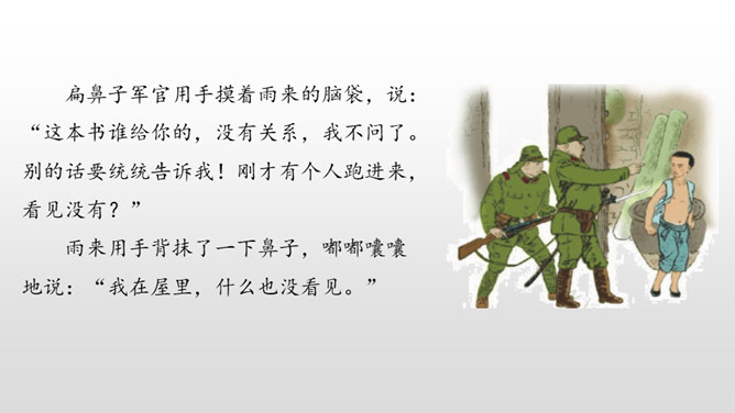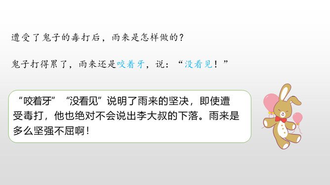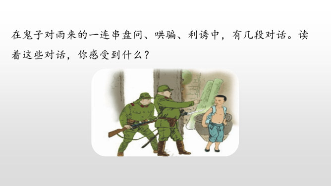 雨来的故事流传了60多年,感染和教育了一代又一代人。同学们,读了课文,你觉得雨来是个什么样的孩子?从哪看出来的?在鬼子对雨来的一连串盘问、哄骗、利诱中,有几段对话。读着这些对话,你感受到什么?从这一连串的扭、打、拧、揪中,我们完全可以想象,鬼子是多么残忍、残暴、没有人性。“咬着牙”“没看见”说明了雨来的坚决,即使遭受毒打,他也绝对不会说出李大叔的下落。雨来是多么坚强不屈啊!所属专题:小英雄雨来ppt。