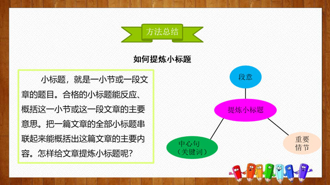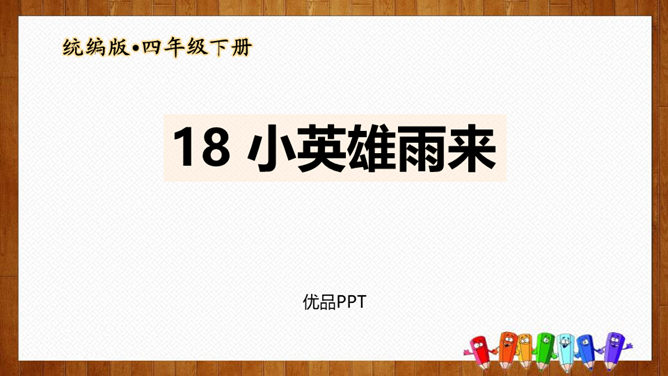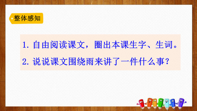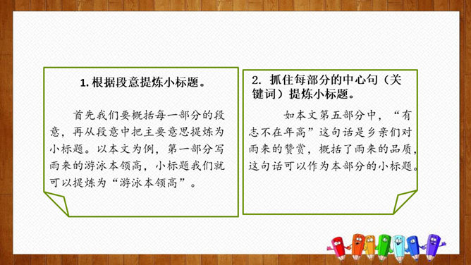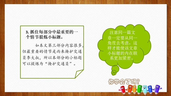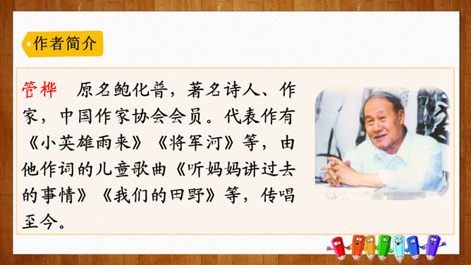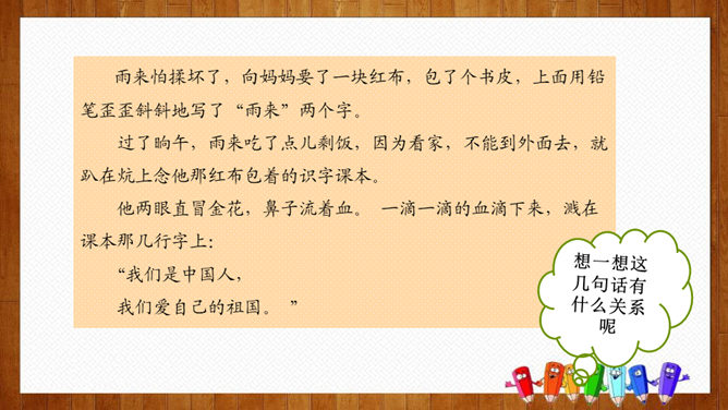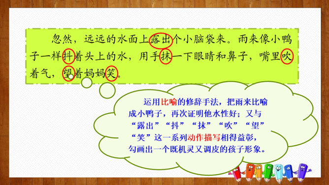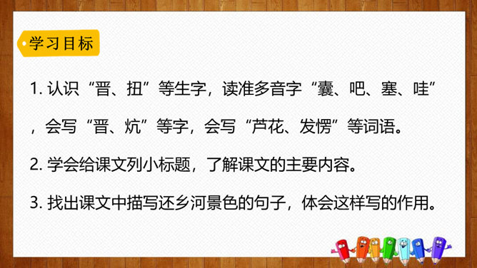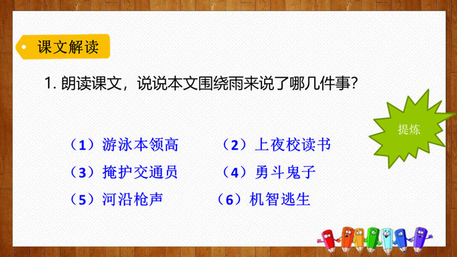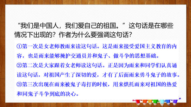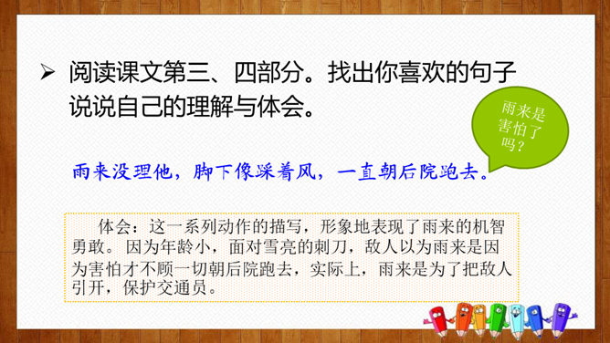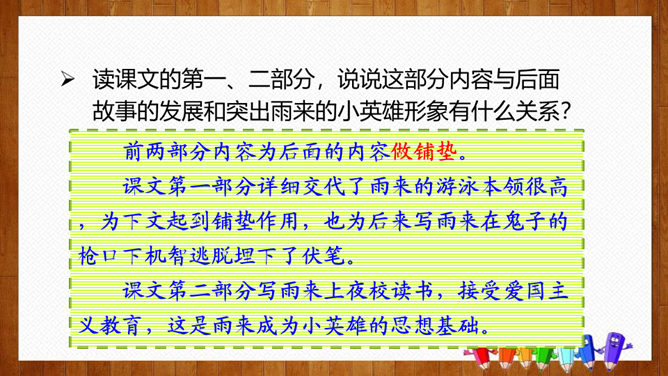 会认会写课文中的生字词,能用自己的话说说课文主要讲了雨来的哪些事。体会伏笔与照应的写作手法,并尝试将其运用到写作中去。课文中多次写到还乡河的景色,再说说这样写有什么作用。作用:此处描写了芦花村优美的环境,一方面展示了雨来家乡美丽的风光,顺势交代了故事发生的地点;另一方面为下文叙述雨来脱险埋下伏笔。 正是这还乡河的存在,雨来才练就了一身游泳的本领,而漫天飞舞的柳絮也为雨来脱险提供了帮助。所属专题:小英雄雨来ppt。
