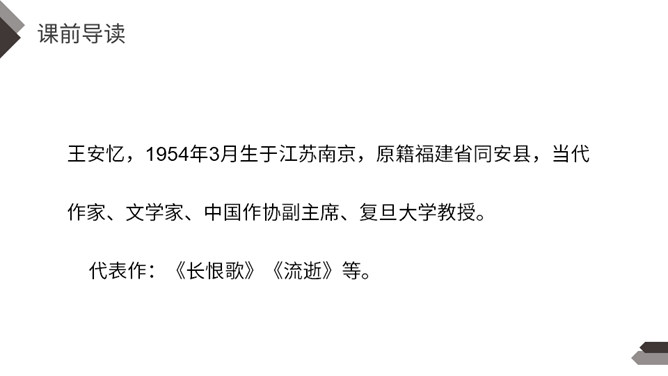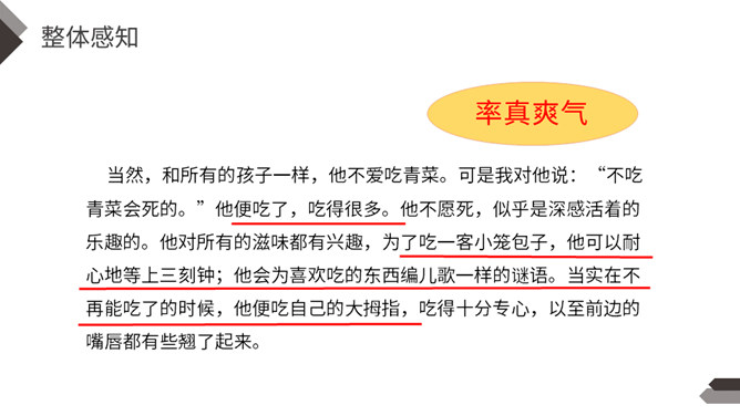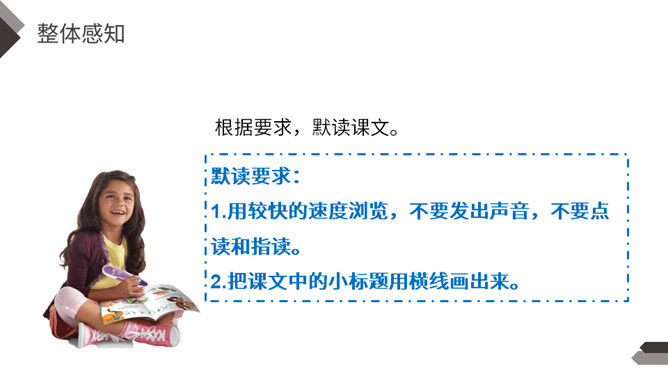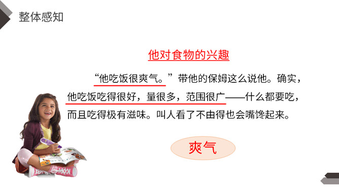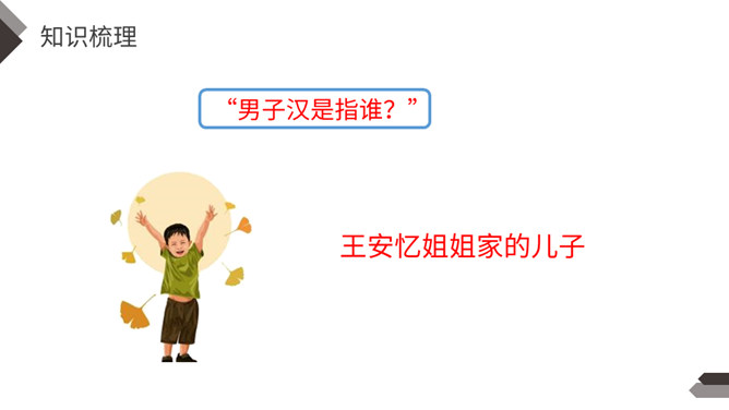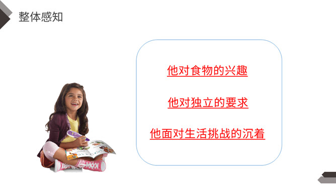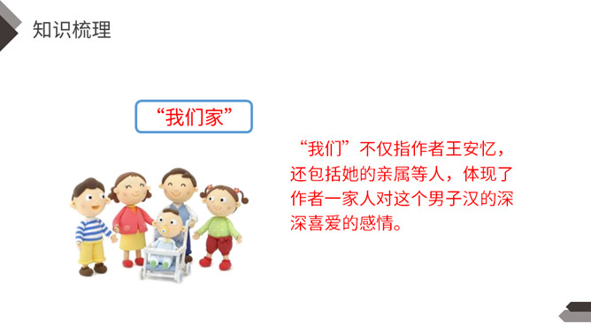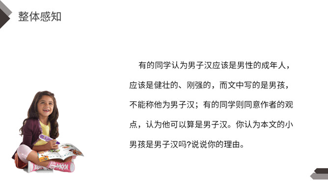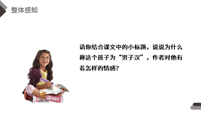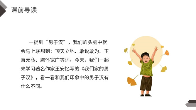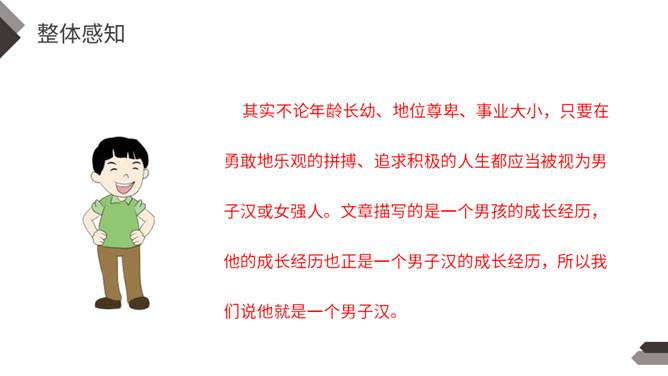 一提到“男子汉”,我们的头脑中就会马上联想到:顶天立地、敢说敢为、正直无私、胸怀宽广等词。今天,我们一起来学习著名作家王安忆写的《我们家的男子汉》,看一看和我们印象中的男子汉有什么不同。“我们”不仅指作者王安忆,还包括她的亲属等人,体现了作者一家人对这个男子汉的深深喜爱的感情。默读要求:1.用较快的速度浏览,不要发出声音,不要点读和指读。2.把课文中的小标题用横线画出来。所属专题:我们家的男子汉ppt。