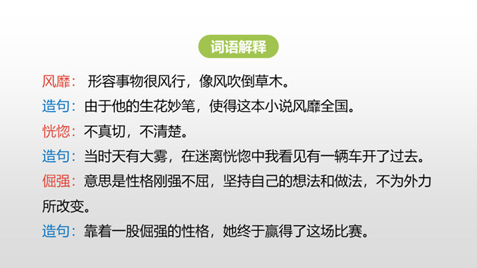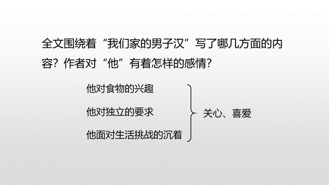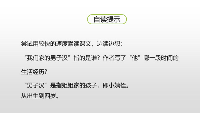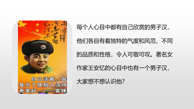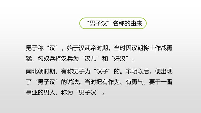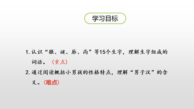 1.认识“徽、谜、唇、尚”等15个生字,理解生字组成的词语。 (重点)2.通过阅读概括小男孩的性格特点,理解“男子汉”的含义。(难点)每个人心目中都有自己欣赏的男子汉,他们各自有着独特的气度和风范、不同的品质和性格,令人可敬可叹。著名女作家王安忆的心目中也有一个男子汉,大家想不想认识他?男子称“汉”,始于汉武帝时期。当时因汉朝将士作战勇猛,匈奴兵将汉兵为“汉儿”和“好汉”。所属专题:我们家的男子汉ppt。