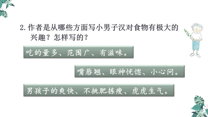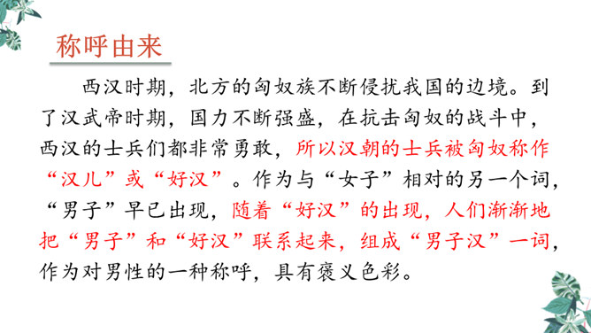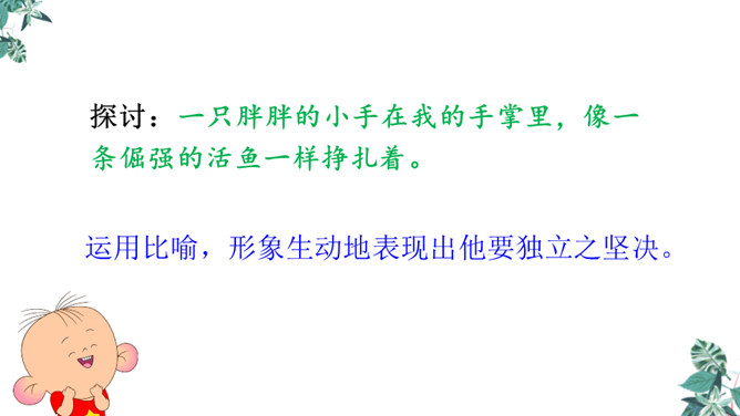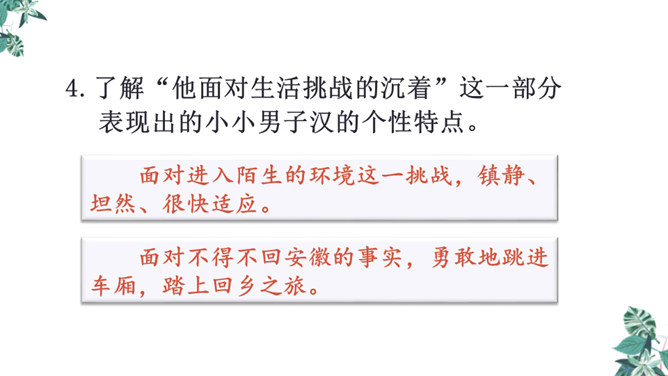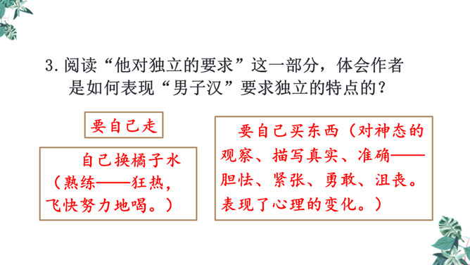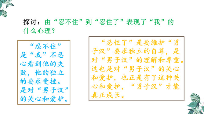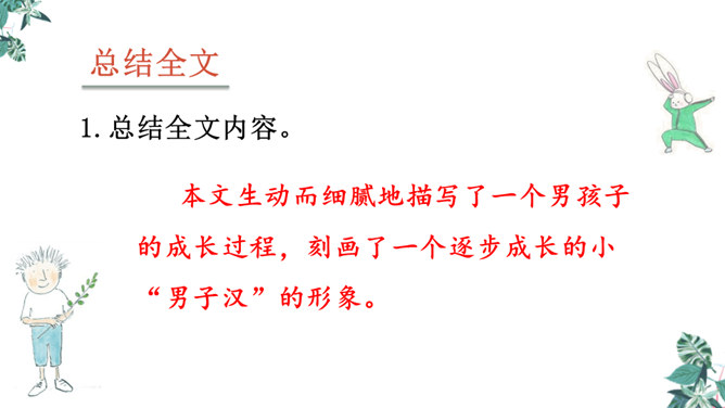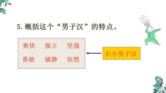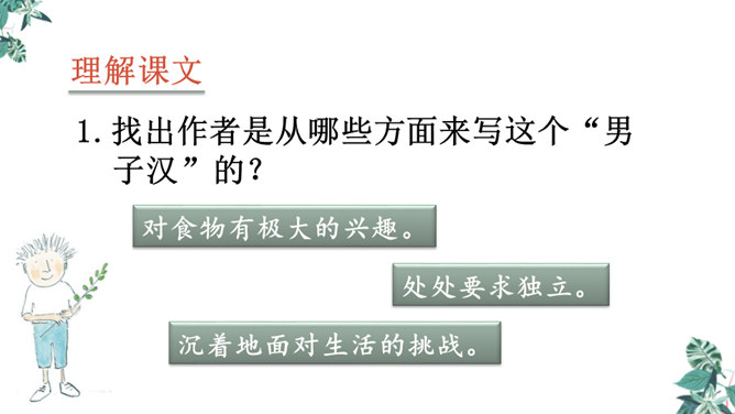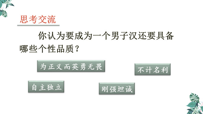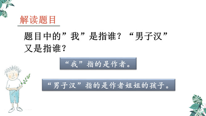 在一个蹒跚学步、稚气未脱的小男孩的生活细节中,我们认识到至情至信、自主独立、刚强坦诚的人就是男子汉。不论年龄的大小,也不论财富的多少,只要拥有了这些优秀品质,你就是一个顶天立地的男子汉。希望我们每个同学都能成为真正的男子汉!大家看下列人物的行为是否属于男子汉的行为,你是否对男子汉的内涵有了新的认识。按人物的性格特点组织、安排材料。自然、亲切、细腻、风趣的语言特点。所属专题:我们家的男子汉ppt。