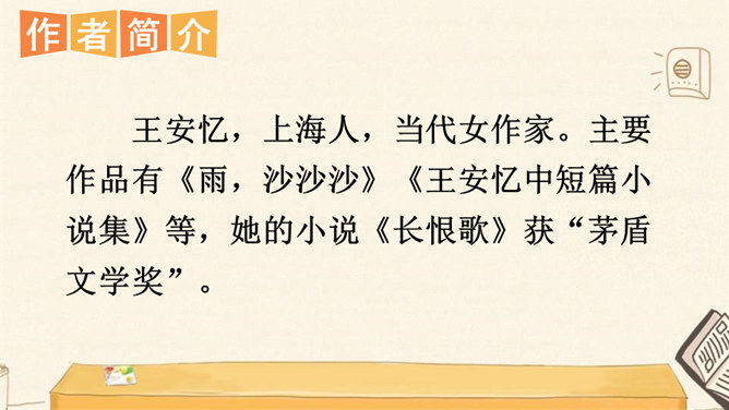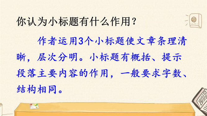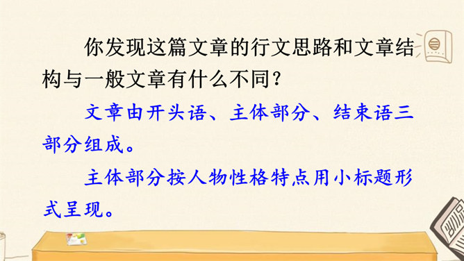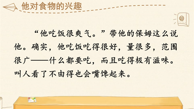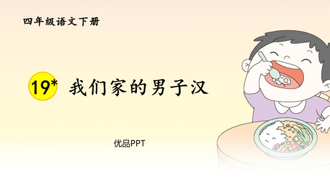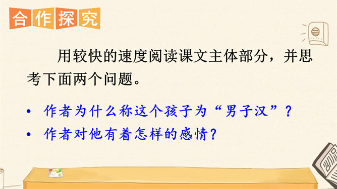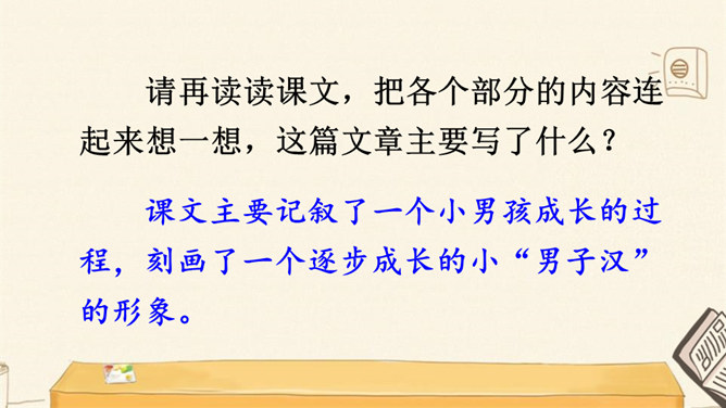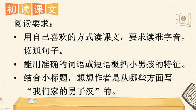 阅读要求:用自己喜欢的方式读课文,要求读准字音,读通句子。能用准确的词语或短语概括小男孩的特征。结合小标题,想想作者是从哪些方面写“我们家的男子汉”的。你认为小标题有什么作用?作者运用3个小标题使文章条理清晰,层次分明。小标题有概括、提示段落主要内容的作用,一般要求字数、结构相同。你发现这篇文章的行文思路和文章结构与一般文章有什么不同?文章由开头语、主体部分、结束语三部分组成。所属专题:我们家的男子汉ppt。