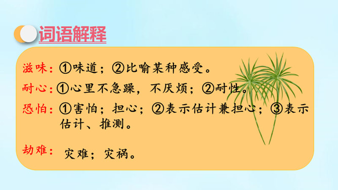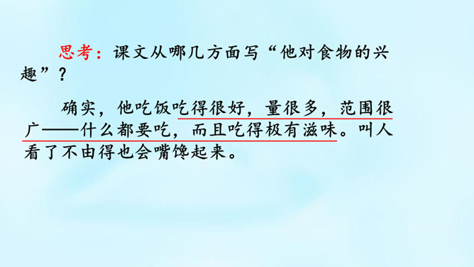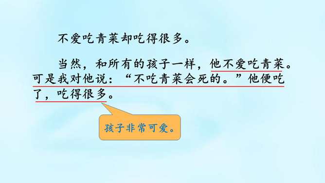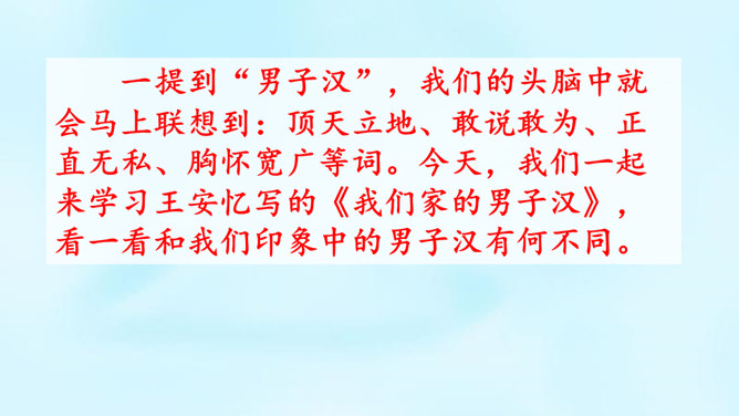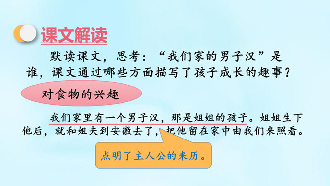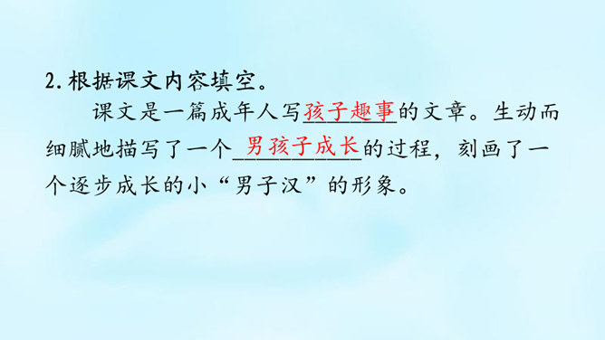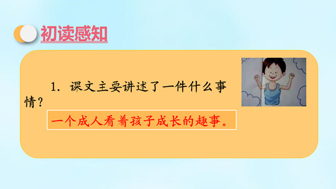 思考:看着孩子逐渐长大,我有什么感受?看着他一点儿一点儿长大,他的脸盘的轮廓,他的手掌上的细纹,他的身体,他的力气,他的智慧,他的性格,还有他的性别,那样神秘地一点儿一点儿鲜明,突出,扩大,再扩大,实在是一件最最奇妙的事情。把描写语言和神态的句子抄下来。写一段话描写一下自己熟悉的人。“勇敢地抓住”“有力地蹬”“攀上” 说明了他的勇敢,动作迅速,可以看出他真的像一个小男子汉那样,面对困难不退缩。所属专题:我们家的男子汉ppt。