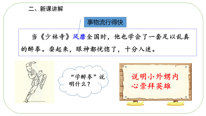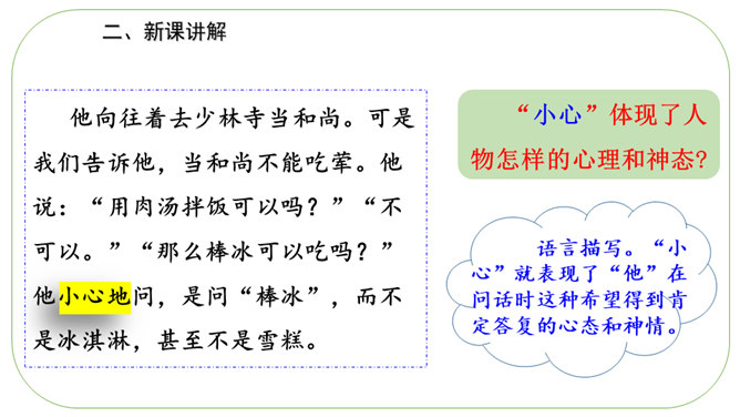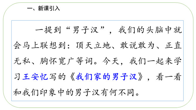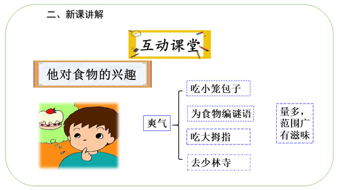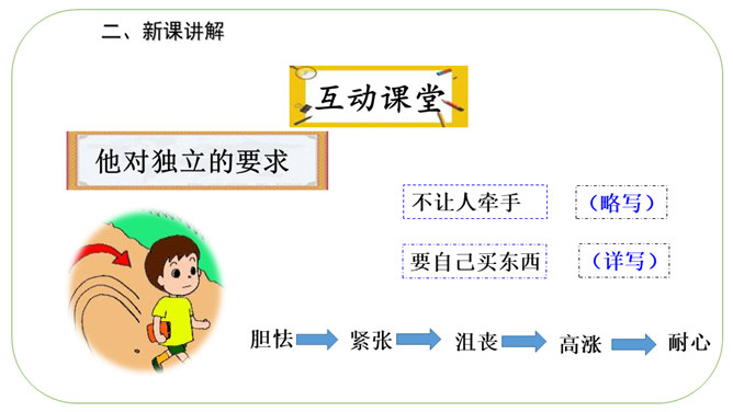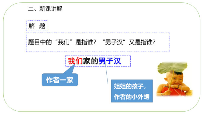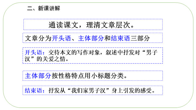 通读课文,理清文章层次。文章分为开头语、主体部分和结束语三部分。开头语:交待本文的写作对象,叙述中抒发对“男子汉”的关爱之情。主体部分按性格特点用小标题分类。结束语:抒发从“我们家男子汉”身上引发的感受。默读课文,思考:作者是从哪些方面来写这个“男子汉”的?1.他对食物有极大的兴趣。2.他对独立的要求。 3.他沉着面对生活的挑战。“小心”体现了人物怎样的心理和神态?所属专题:我们家的男子汉ppt。