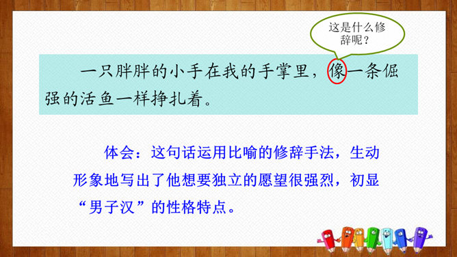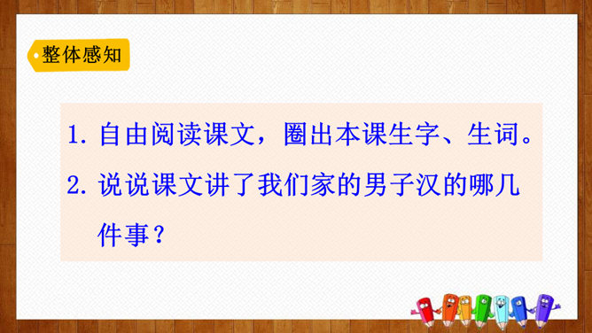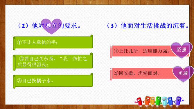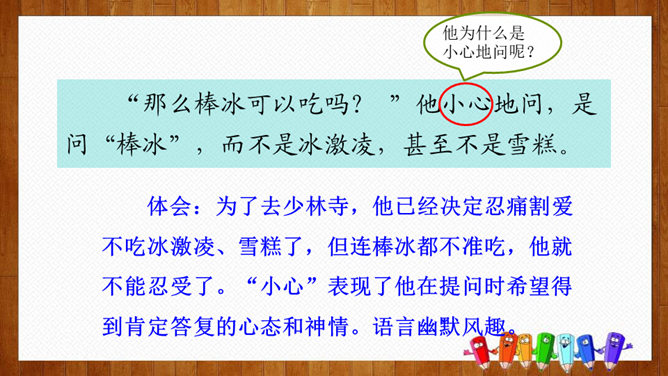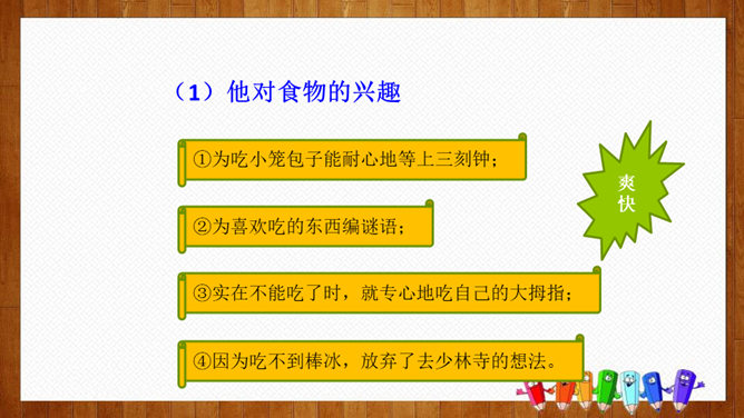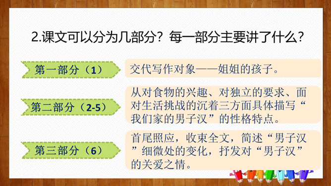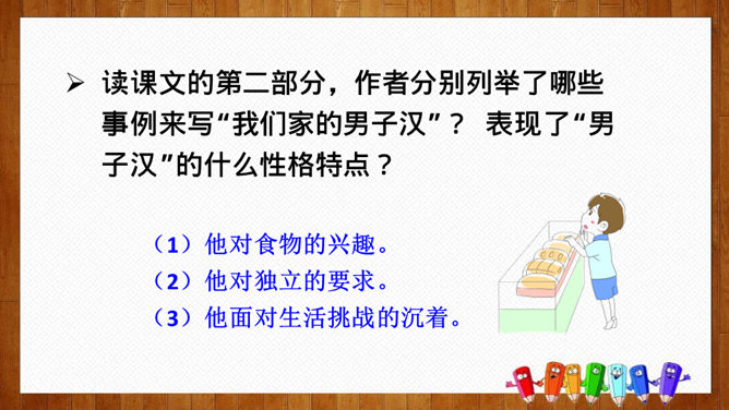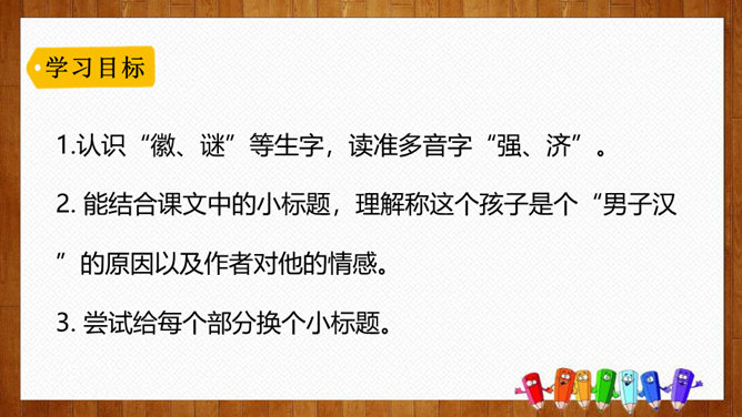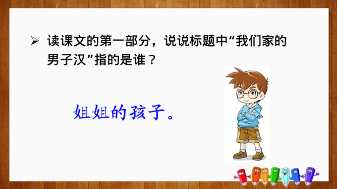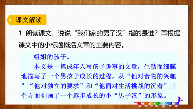 根据课文中的小标题概括文章的主要内容。姐姐的孩子。本文是一篇成年人写孩子趣事的文章,生动而细腻地描写了一个男孩子成长的过程,从“他对食物的兴趣”“他对独立的要求”和“他面对生活挑战的沉着”三个方面刻画了一个逐步成长的小“男子汉”的形象。体会:为了去少林寺,他已经决定忍痛割爱不吃冰激凌、雪糕了,但连棒冰都不准吃,他就不能忍受了。“小心”表现了他在提问时希望得到肯定答复的心态和神情。语言幽默风趣。所属专题:我们家的男子汉ppt。