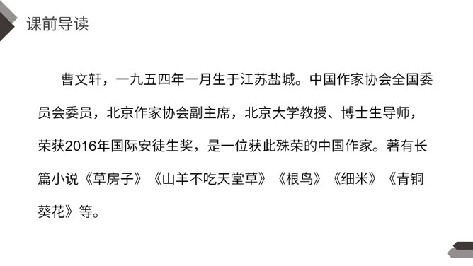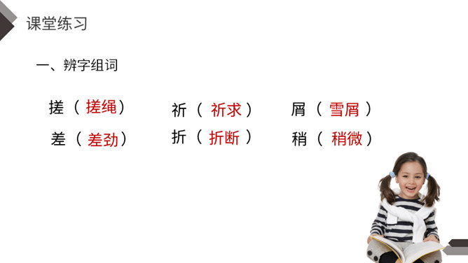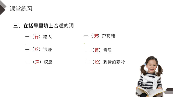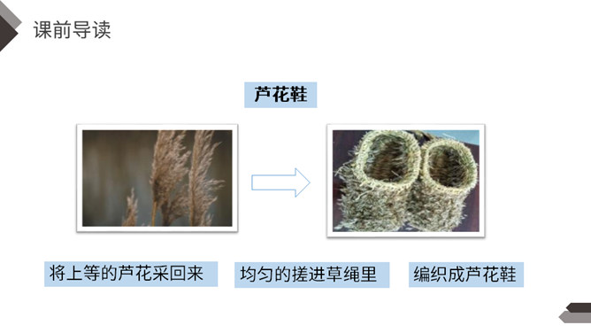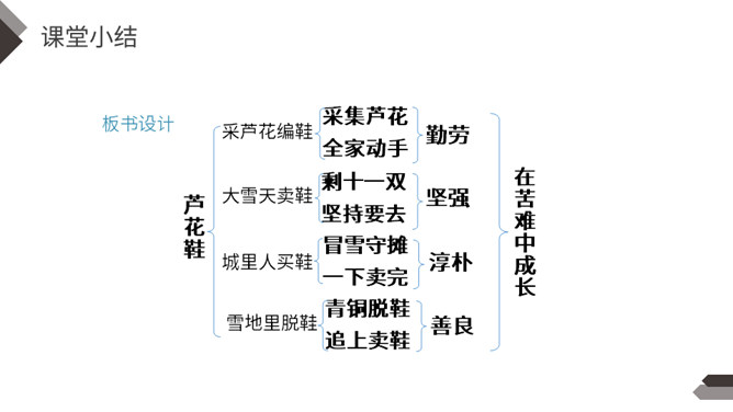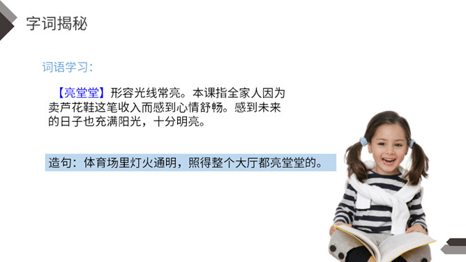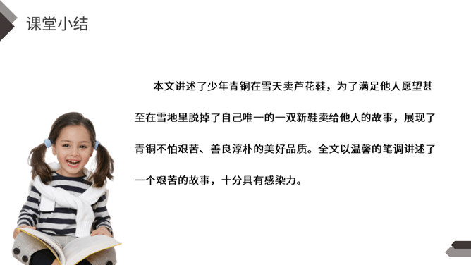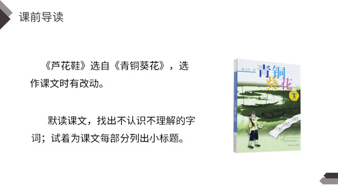 默读课文,找出不认识不理解的字词;试着为课文每部分列出小标题。本文讲述了少年青铜在雪天卖芦花鞋,为了满足他人愿望甚至在雪地里脱掉了自己唯一的一双新鞋卖给他人的故事,展现了青铜不怕艰苦、善良淳朴的美好品质。全文以温馨的笔调讲述了一个艰苦的故事,十分具有感染力。【亮堂堂】形容光线常亮。本课指全家人因为卖芦花鞋这笔收入而感到心情舒畅。感到未来的日子也充满阳光,十分明亮。所属专题:芦花鞋ppt。