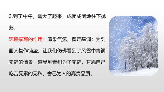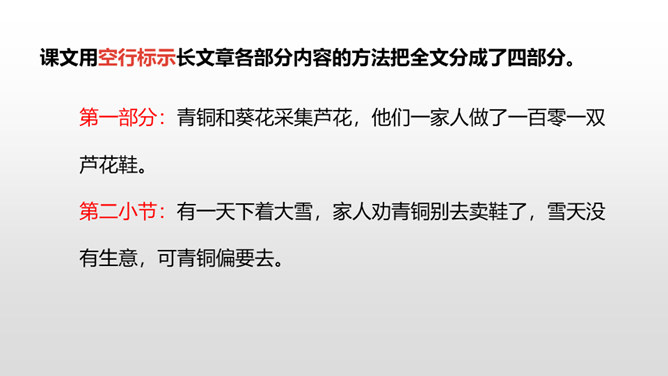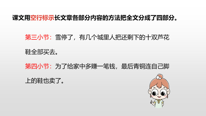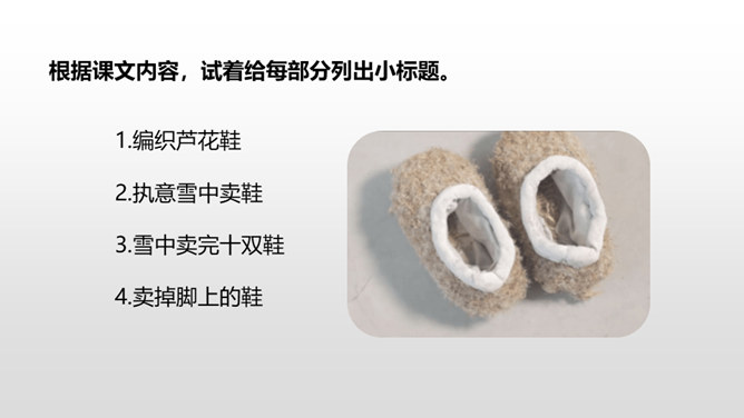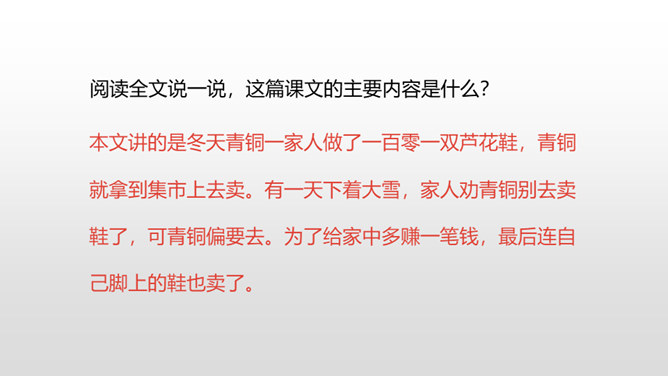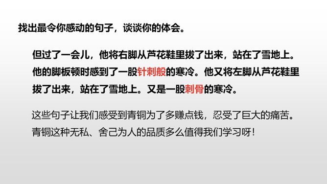 1.有困难是坏事也是好事,困难会逼着人想办法,困难环境能锻炼出人才来,因此,应该迎着困难前进。2.苦难是孕育在珠蚌成年累月而不言放弃的等待,是幼海龟们为争取生存的权利破壳后一往无前的决心,苦难是小草的岁岁枯荣,必须保持生命的活力,也是松柏经历岁月的雕琢的见证。本文主要写了青铜雪天卖掉了剩下的十双鞋,为了给家里多赚点钱,最后连自己脚上的鞋也卖了的事,表现了青铜无私、舍己为人的精神。所属专题:芦花鞋ppt。