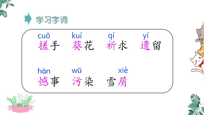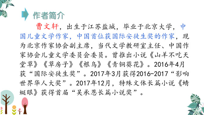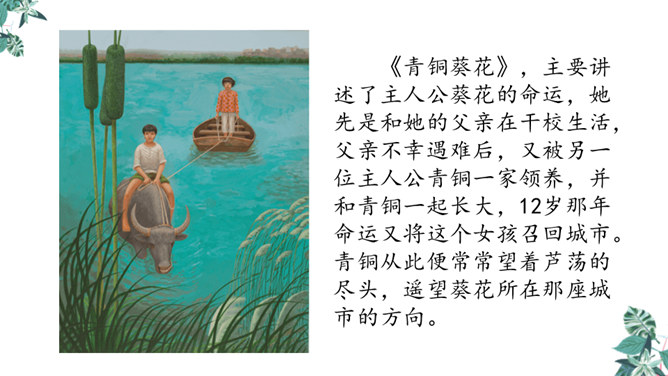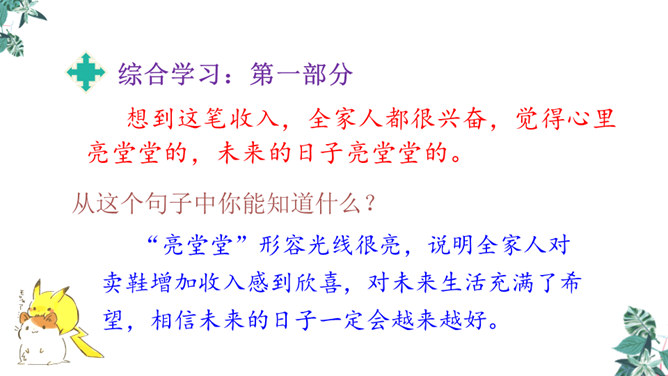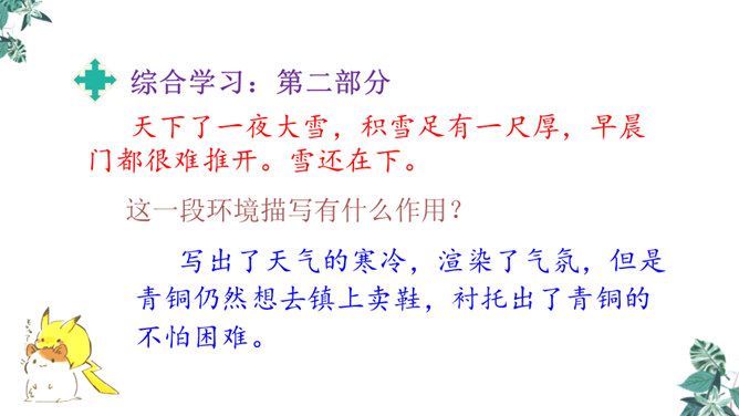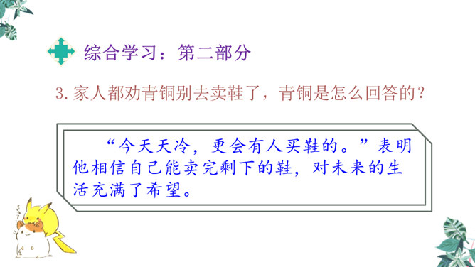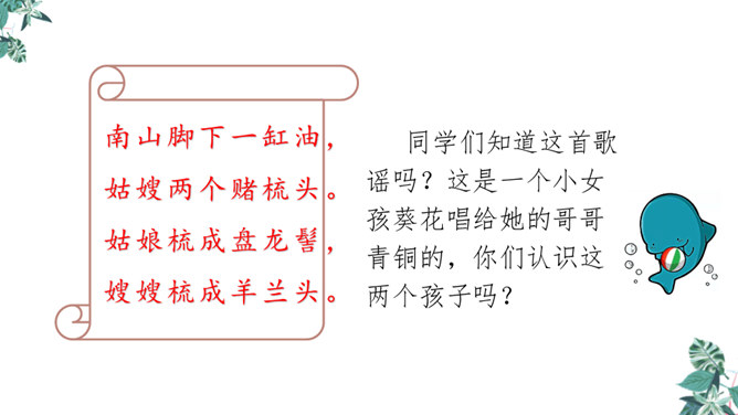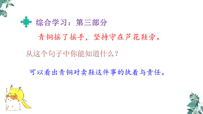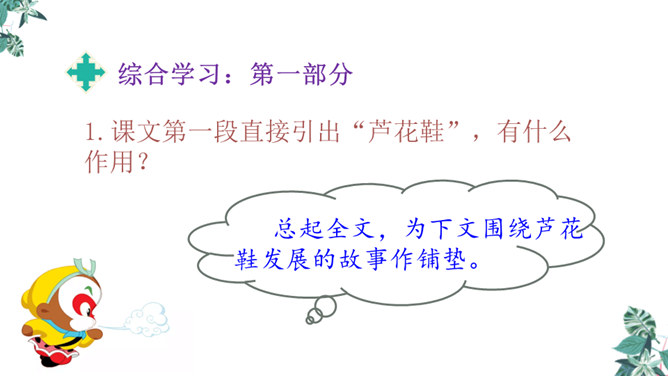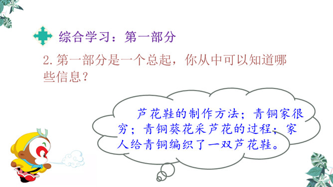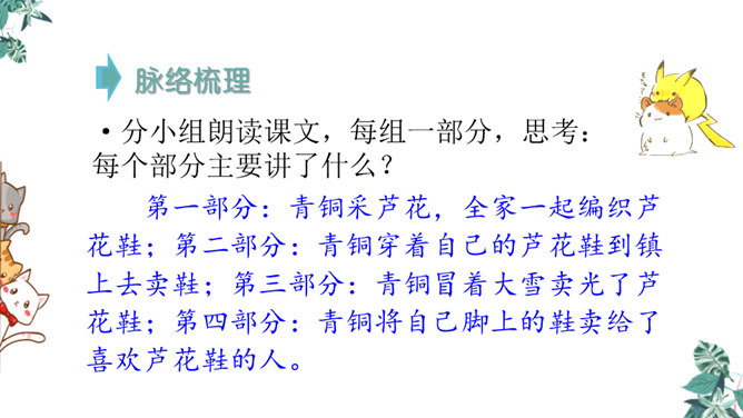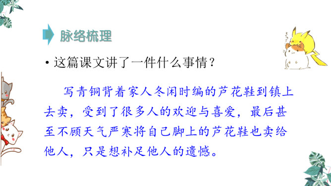同学们知道这首歌谣吗?这是一个小女孩葵花唱给她的哥哥青铜的,你们认识这两个孩子吗?这篇课文讲了一件什么事情?写青铜背着家人冬闲时编的芦花鞋到镇上去卖,受到了很多人的欢迎与喜爱,最后甚至不顾天气严寒将自己脚上的芦花鞋也卖给他人,只是想补足他人的遗憾。分小组朗读课文,每组一部分,思考:每个部分主要讲了什么?第一部分是一个总起,你从中可以知道哪些信息?所属专题:芦花鞋ppt。