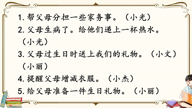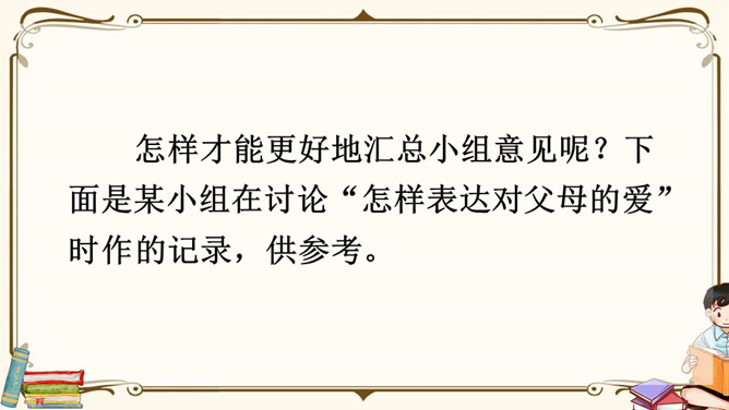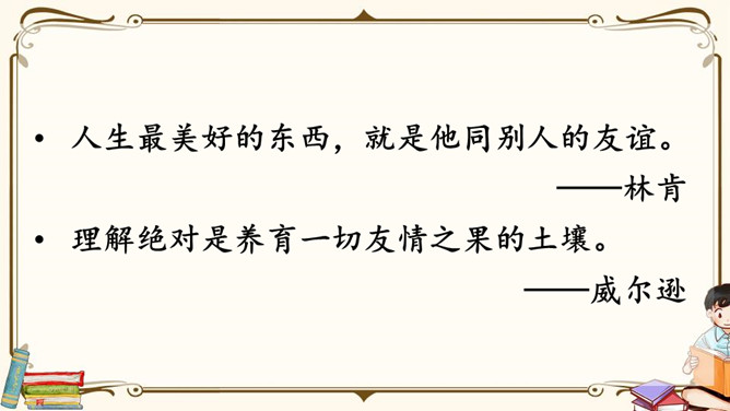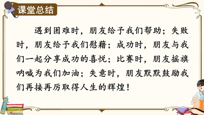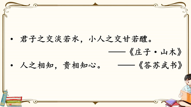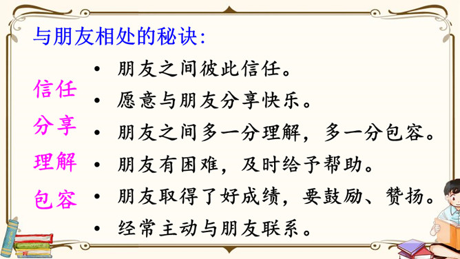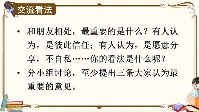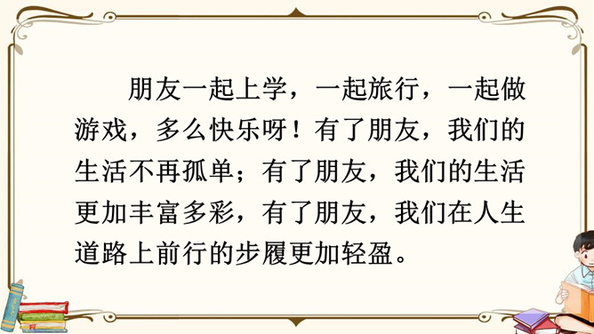 生活中,你们一定也有不少朋友吧,谁愿意分享自己与朋友相处的故事呢?朋友一起上学,一起旅行,一起做游戏,多么快乐呀!有了朋友,我们的生活不再孤单;有了朋友,我们的生活更加丰富多彩,有了朋友,我们在人生道路上前行的步履更加轻盈。怎样才能更好地汇总小组意见呢?下面是某小组在讨论“怎样表达对父母的爱”时作的记录,供参考。我把痛苦向朋友诉说,就只剩下半份痛苦;我把快乐与朋友分享,就会变成两份快乐。所属专题:朋友相处的秘诀ppt。