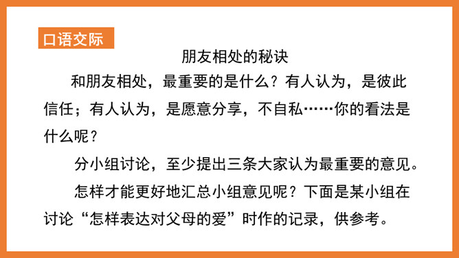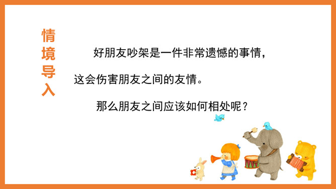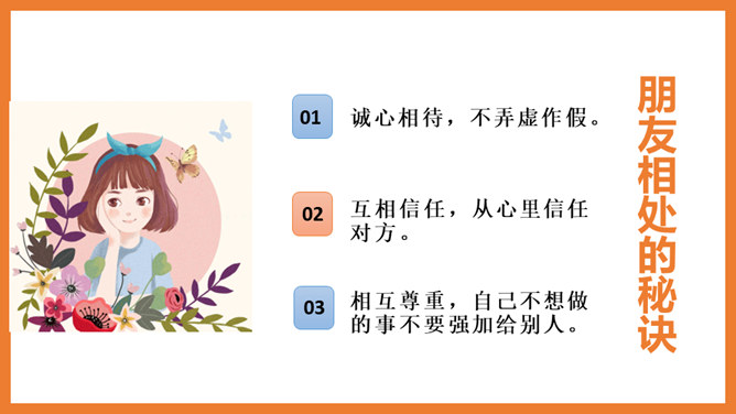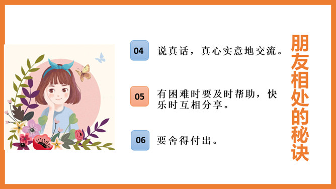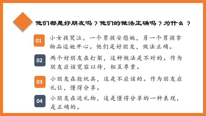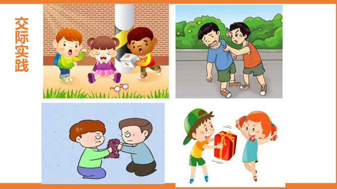 诚心相待,不弄虚作假。互相信任,从心里信任对方。相互尊重,自己不想做的事不要强加给别人。说真话,真心实意地交流。有困难时要及时帮助,快乐时互相分享。要舍得付出。他们都是好朋友吗?他们的做法正确吗?为什么?小女孩哭泣,一个男孩安慰她,另一个男孩拿物品逗她开心。他们是好朋友,做法正确。两个好朋友在打架,这种做法是不对的。作为朋友应该宽容以待,相互尊重。所属专题:朋友相处的秘诀ppt。