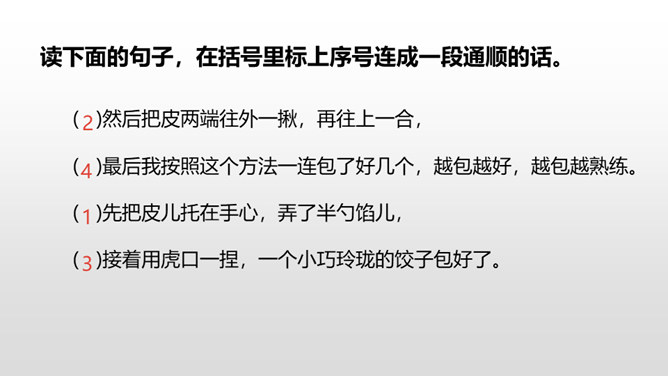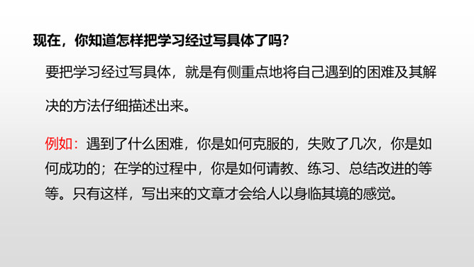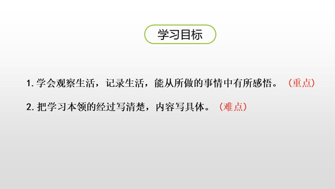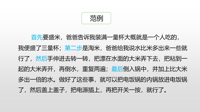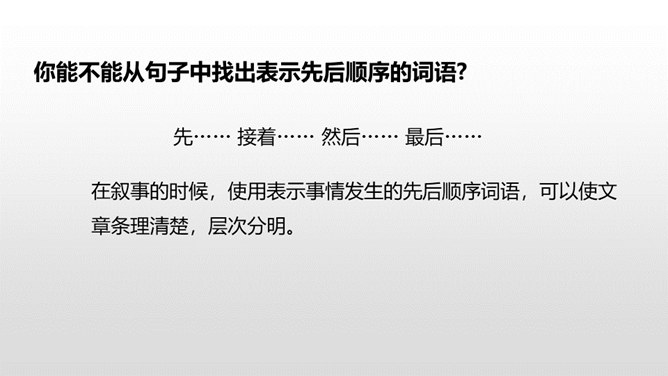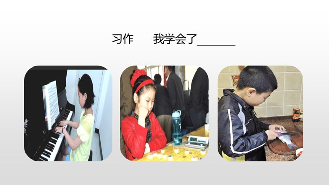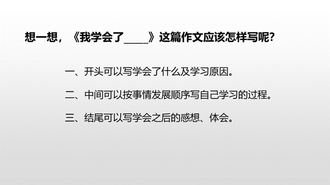 1.学会观察生活,记录生活,能从所做的事情中有所感悟。 (重点)2.把学习本领的经过写清楚,内容写具体。 (难点)一、开头可以写学会了什么及学习原因。二、中间可以按事情发展顺序写自己学习的过程。三、结尾可以写学会之后的感想、体会。通过上节课的学习,我们知道了本次习作的写作要求及写作步骤。下面,让我们学习怎样按顺序把学习过程写具体吧。你能不能从句子中找出表示先后顺序的词语?所属专题:我学会了ppt。