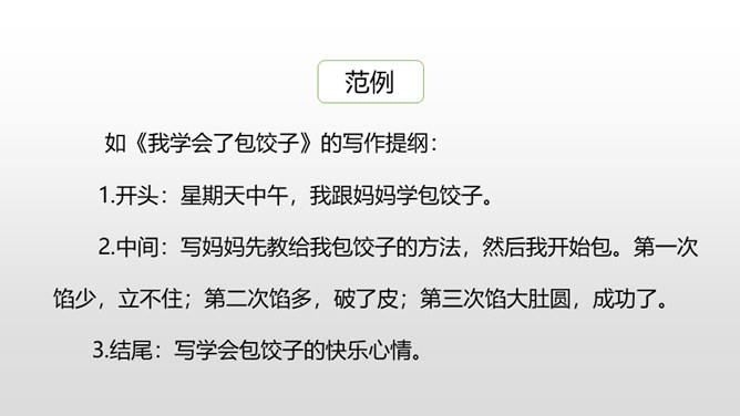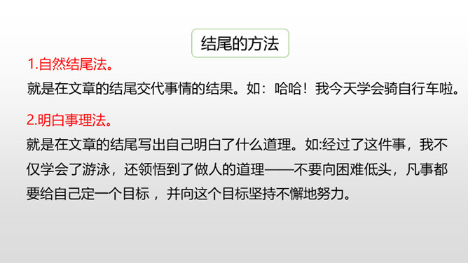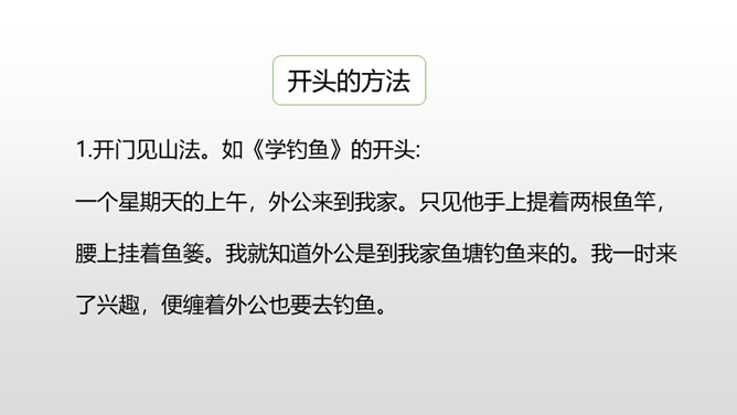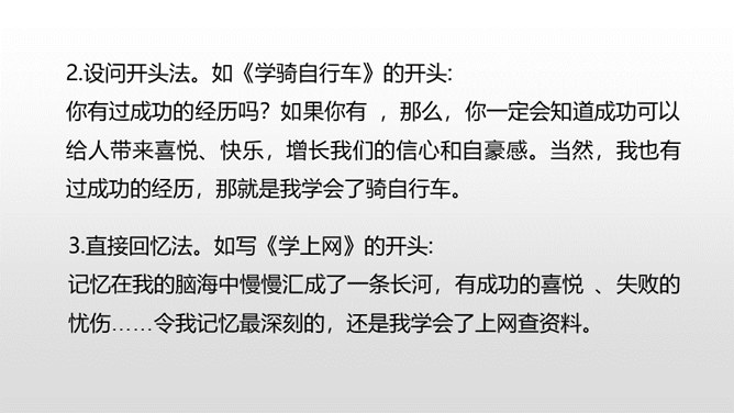 1.开门见山法。如《学钓鱼》的开头: 一个星期天的上午,外公来到我家。只见他手上提着两根鱼竿,腰上挂着鱼篓。我就知道外公是到我家鱼塘钓鱼来的。我一时来了兴趣,便缠着外公也要去钓鱼。2.设问开头法。如《学骑自行车》的开头: 你有过成功的经历吗?如果你有 ,那么,你一定会知道成功可以给人带来喜悦、快乐,增长我们的信心和自豪感。当然,我也有过成功的经历,那就是我学会了骑自行车。所属专题:我学会了ppt。