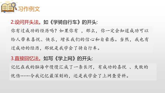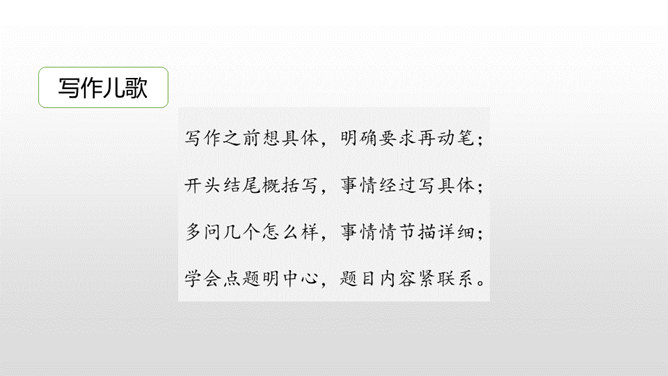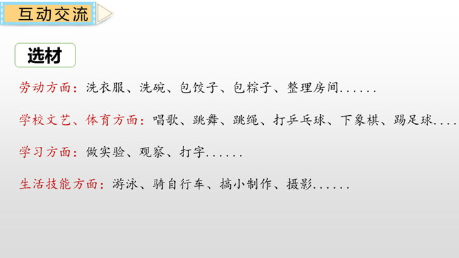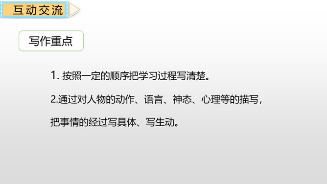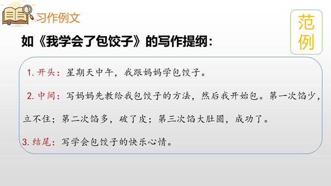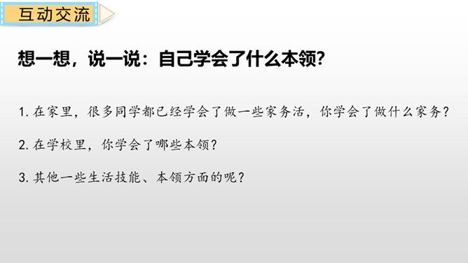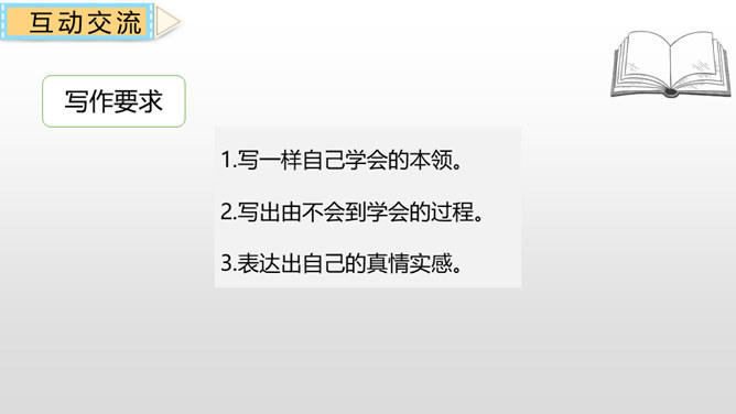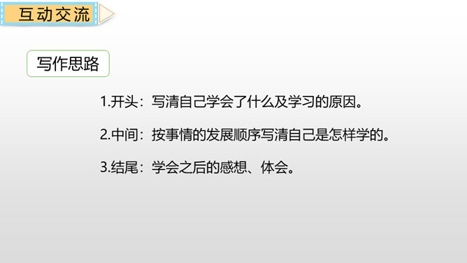 想一想,说一说:自己学会了什么本领?1.在家里,很多同学都已经学会了做一些家务活,你学会了做什么家务?2.在学校里,你学会了哪些本领?3.其他一些生活技能、本领方面的呢?1. 按照一定的顺序把学习过程写清楚。2.通过对人物的动作、语言、神态、心理等的描写,把事情的经过写具体、写生动。1.开头:写清自己学会了什么及学习的原因。2.中间:按事情的发展顺序写清自己是怎样学的。3.结尾:学会之后的感想、体会。所属专题:我学会了ppt。