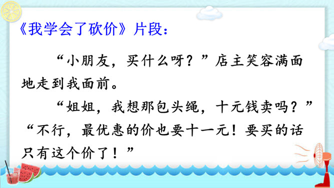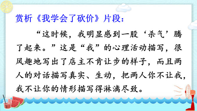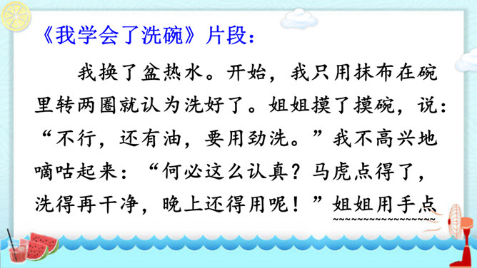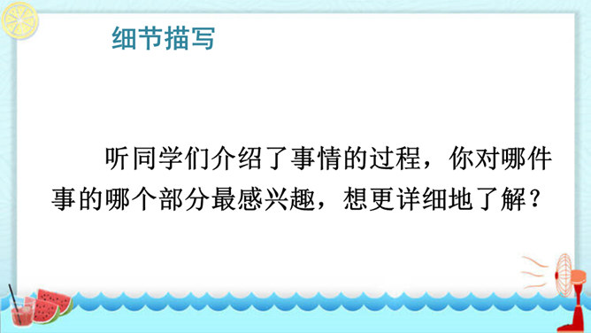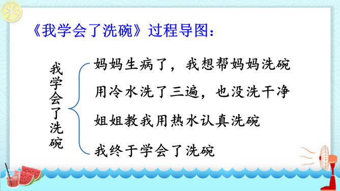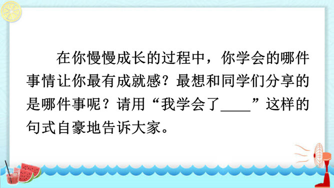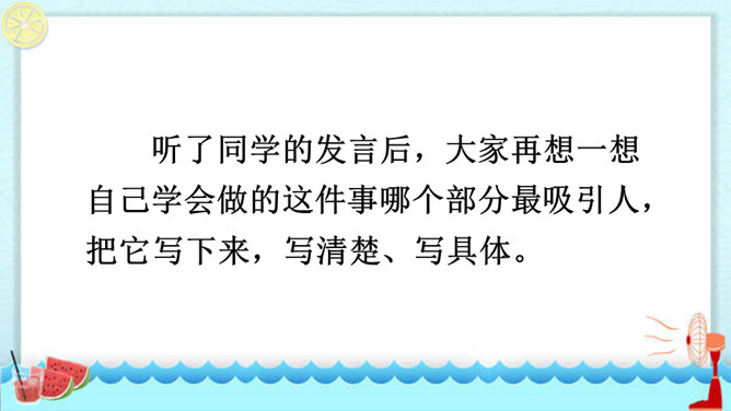 在你慢慢成长的过程中,你学会的哪件事情让你最有成就感?最想和同学们分享的是哪件事呢?请用“我学会了____”这样的句式自豪地告诉大家。听同学们介绍了事情的过程,你对哪件事的哪个部分最感兴趣,想更详细地了解? 这两个片段主要抓住了整个事情中人物的动作、语言及心理活动,把事情最真实、有趣的部分写得非常具体,让人有身临其境之感。我为什么要学梳头?我是怎么梳头发的,最后我是怎么学会的?所属专题:我学会了ppt。
