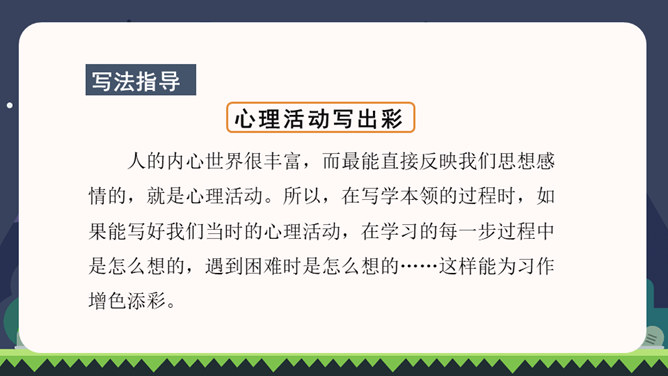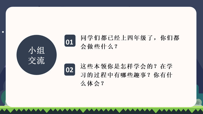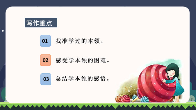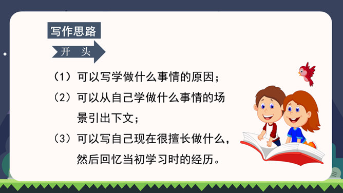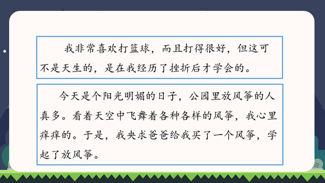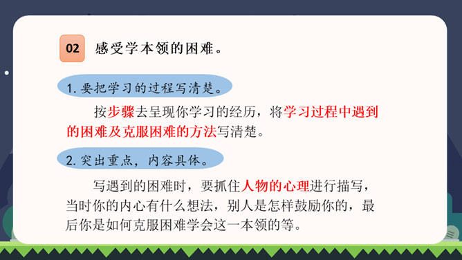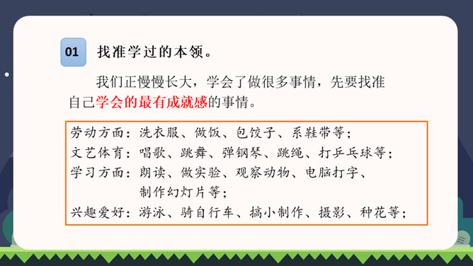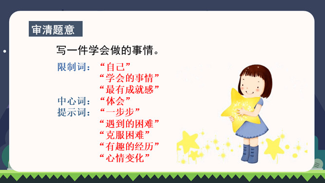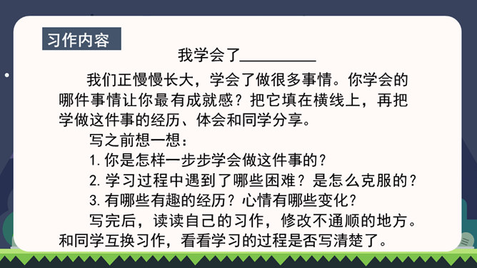 同学们都已经上四年级了,你们都会做些什么?这些本领你是怎样学会的?在学习的过程中有哪些趣事?你有什么体会?我们正慢慢长大,学会了做很多事情。你学会的哪件事情让你最有成就感?把它填在横线上,再把学做这件事的经历、体会和同学分享。写之前想一想:1.你是怎样一步步学会做这件事的?2.学习过程中遇到了哪些困难?是怎么克服的?3.有哪些有趣的经历?心情有哪些变化?写完后,读读自己的习作,修改不通顺的地方。和同学互换习作,看看学习的过程是否写清楚了。所属专题:我学会了ppt。
