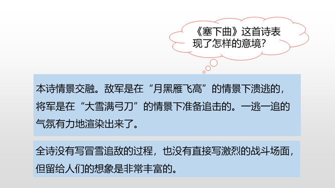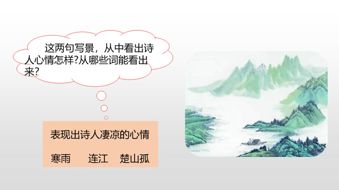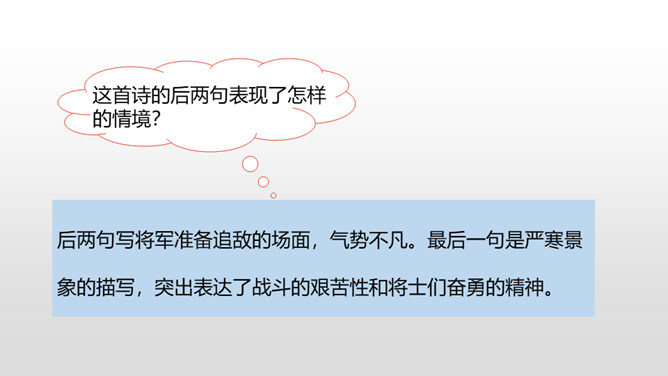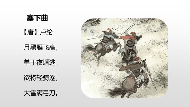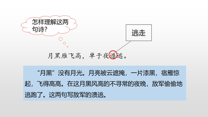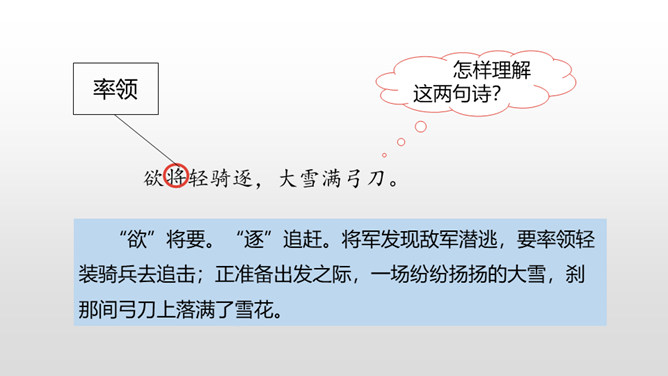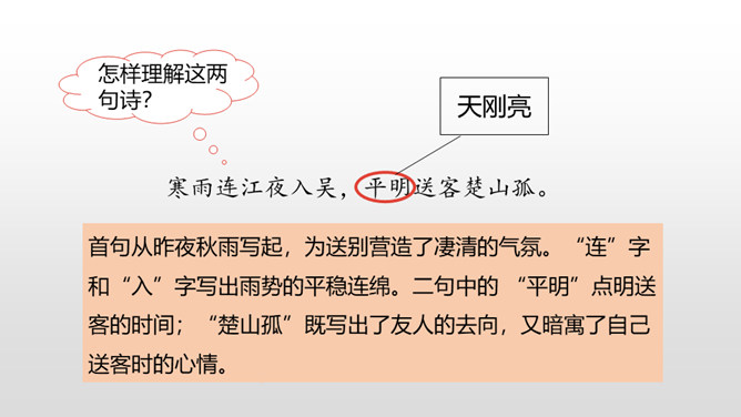 首句从昨夜秋雨写起,为送别营造了凄清的气氛。“连”字和“入”字写出雨势的平稳连绵。二句中的 “平明”点明送客的时间;“楚山孤”既写出了友人的去向,又暗寓了自己送客时的心情。“月黑”没有月光。月亮被云遮掩,一片漆黑,宿雁惊起,飞得高高。在这月黑风高的不寻常的夜晚,敌军偷偷地逃跑了。这两句写敌军的溃逃。“欲”将要。“逐”追赶。将军发现敌军潜逃,要率领轻装骑兵去追击;正准备出发之际,一场纷纷扬扬的大雪,刹那间弓刀上落满了雪花。