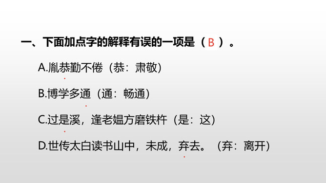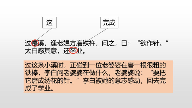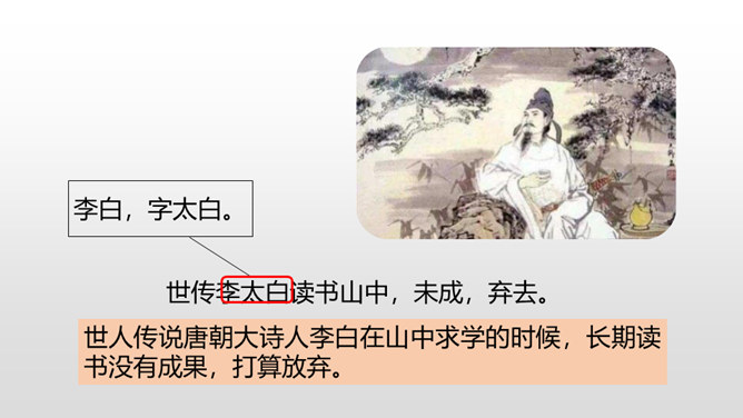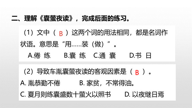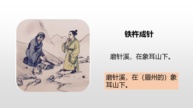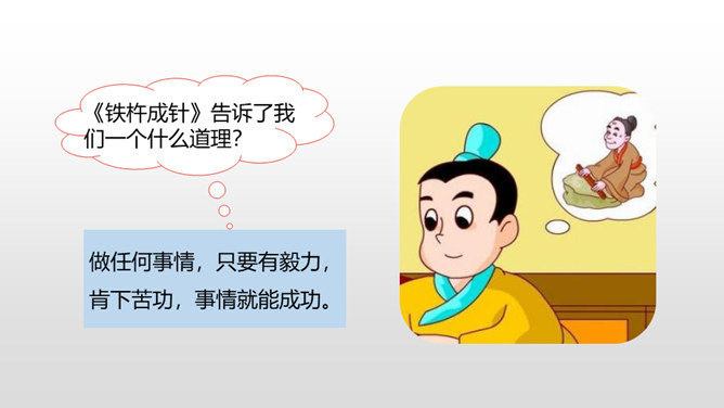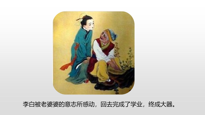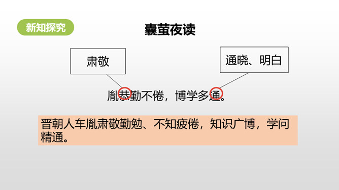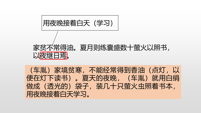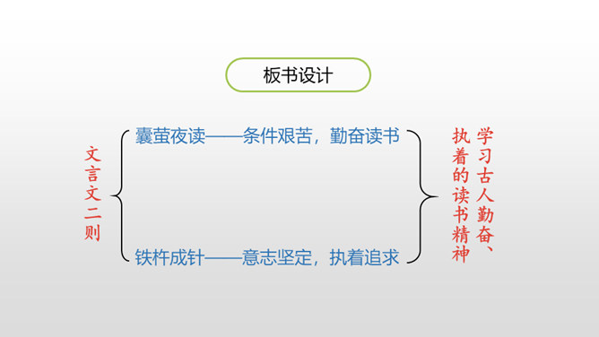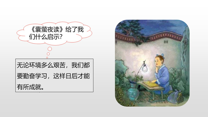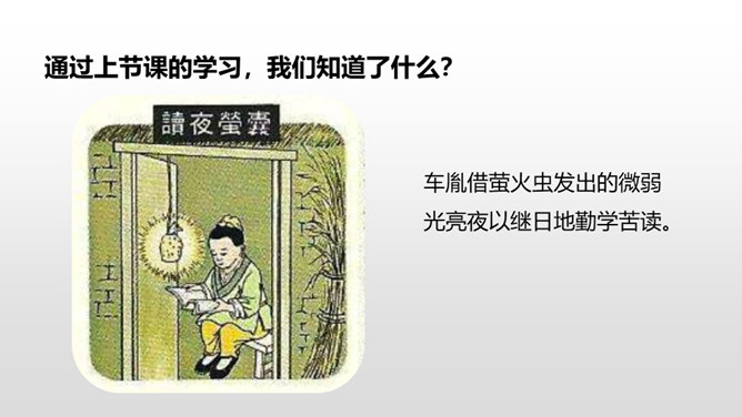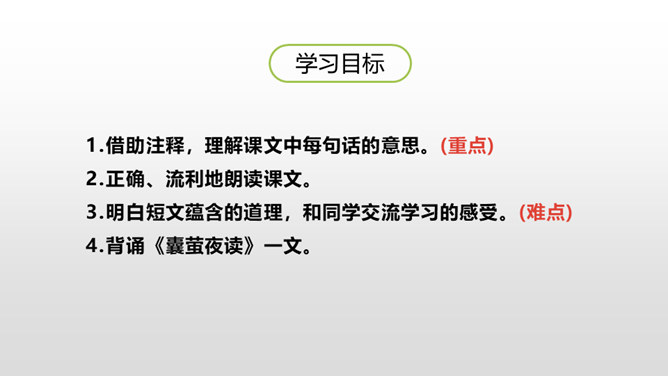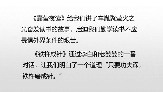 1.借助注释,理解课文中每句话的意思。(重点)2.正确、流利地朗读课文。3.明白短文蕴含的道理,和同学交流学习的感受。(难点)《囊萤夜读》给我们讲了车胤聚萤火之光奋发读书的故事,启迪我们勤学读书不应畏惧外界条件的艰苦。《铁杵成针》通过李白和老婆婆的一番对话,让我们明白了一个道理“只要功夫深,铁杵磨成针。”孙康映雪读书的故事告诉我们,做什么事都只有通过刻苦努力,才能成功。特别是遇到困难时,不应该放弃,要动脑筋想办法战胜困难。对于我们青少年来说就要利用一切时间去学习,不要放弃,不要畏惧,要在困境中磨砺自己。