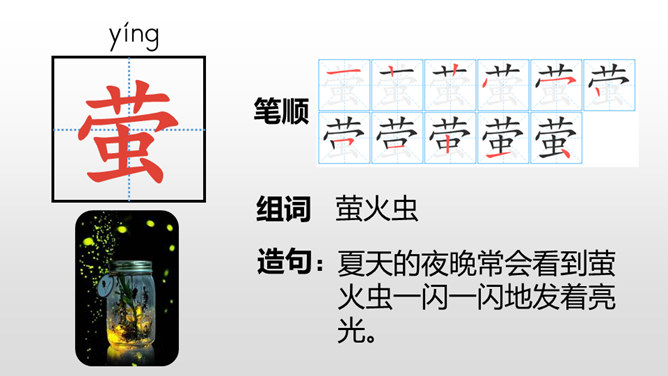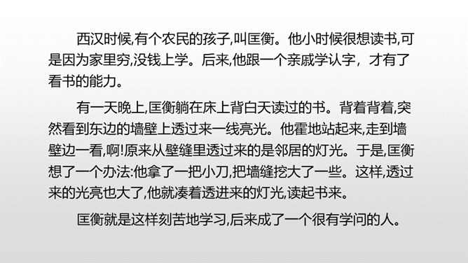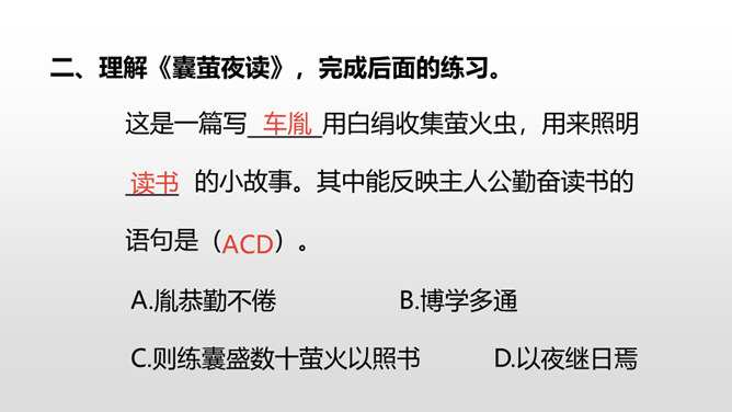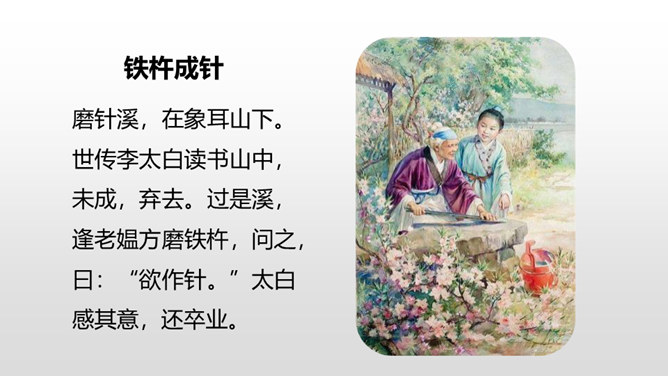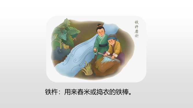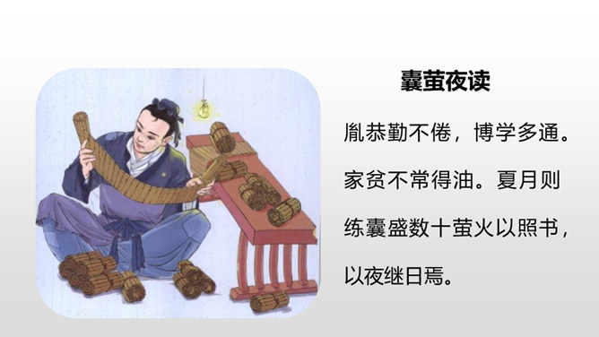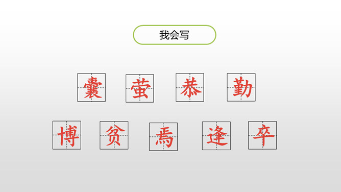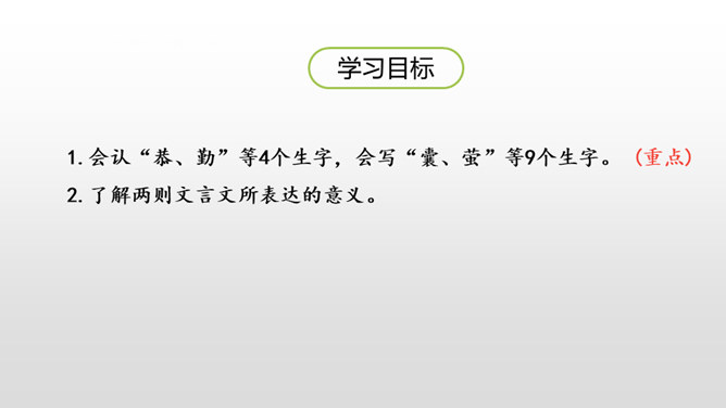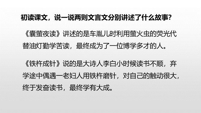 1.会认“恭、勤”等4个生字,会写“囊、萤”等9个生字。 (重点)2.了解两则文言文所表达的意义。今天我们就来学习两则有关古人勤奋读书的故事。初读课文,说一说两则文言文分别讲述了什么故事?《铁杵成针》说的是大诗人李白小时候读书不顺,弃学途中偶遇一老妇人用铁杵磨针,对自己的触动很大,终于发奋读书,最终学有大成。《囊萤夜读》讲述的是车胤儿时利用萤火虫的荧光代替油灯勤学苦读,最终成为了一位博学多才的人。