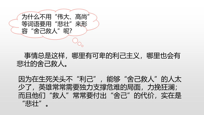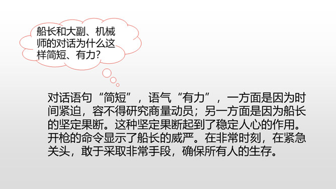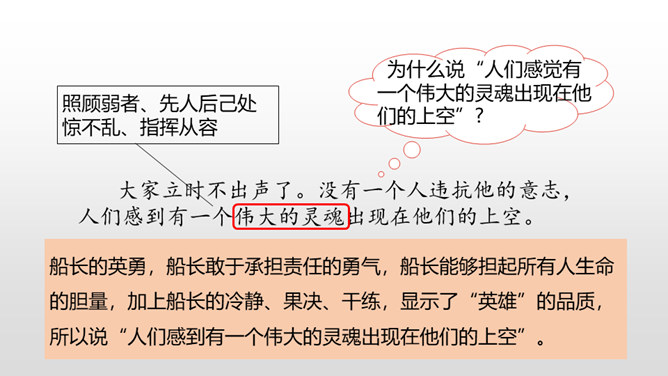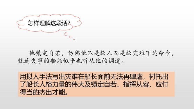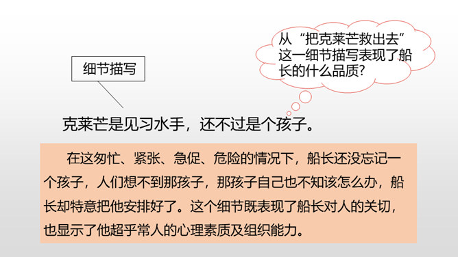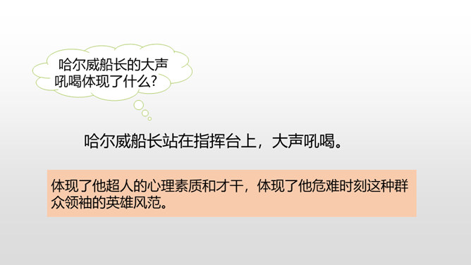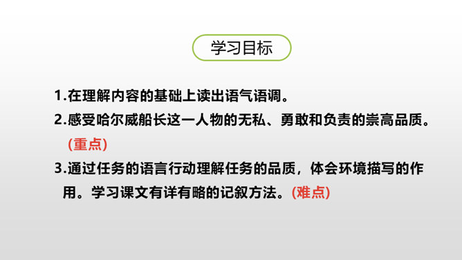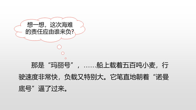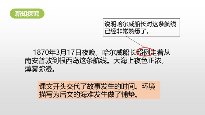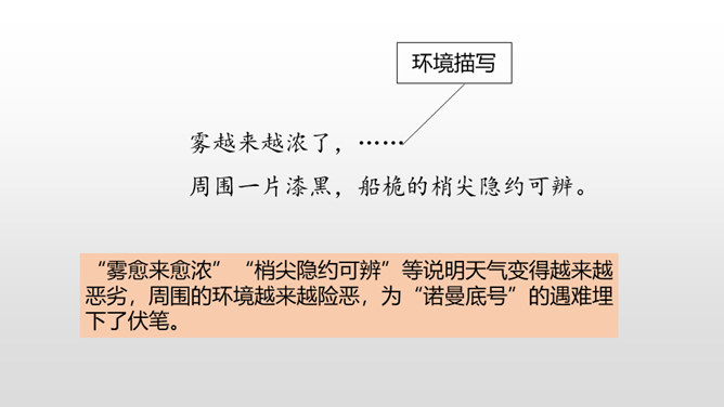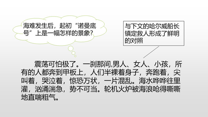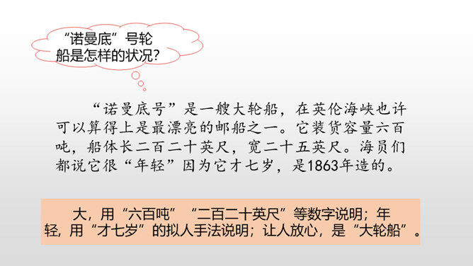 通过上节课的学习,我们知道了什么?在遭遇突如其来的海难时,哈尔威船长临危不乱、勇于决断的品格和尽职尽责、舍己救人的精神值得我们敬仰。课文开头交代了故事发生的时间。环境描写为后文的海难发生做了铺垫。大,用“六百吨”“二百二十英尺”等数字说明;年轻, 用“才七岁”的拟人手法说明;让人放心,是“大轮船”。“雾愈来愈浓”“梢尖隐约可辨”等说明天气变得越来越恶劣,为“诺曼底号”的遇难埋下了伏笔。所属专题:诺曼底号遇难记ppt。