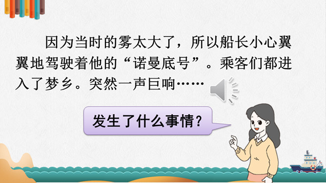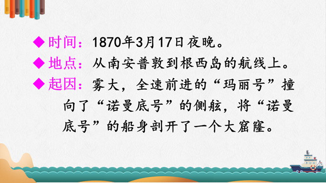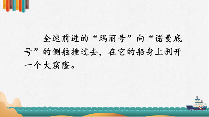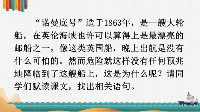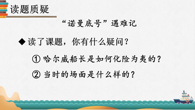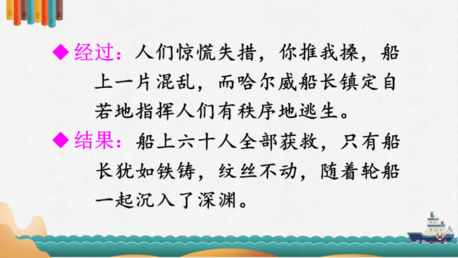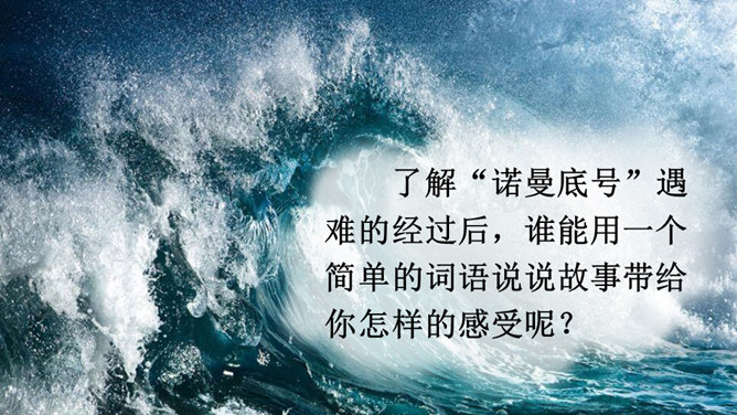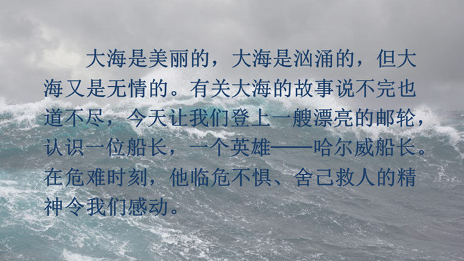 践行一次英雄的“壮举”的机会人人都有,关键在你是否付诸于行动。在死亡面前,哈尔威船长临危不惧、镇定自若、舍己为人,他的高贵品质没有任何一个海员能与他相提并论。“诺曼底号”不幸在海上失事了,在一片惊恐慌乱中,哈尔威船长临危不惧、镇定自若地指挥船员,船上所有的人都获救了,而他自己,却被海水无情地吞没,哈尔威船长危难时刻舍己为人、沉着机智、指挥有方的崇高精神,永远留在人们心中!所属专题:诺曼底号遇难记ppt。