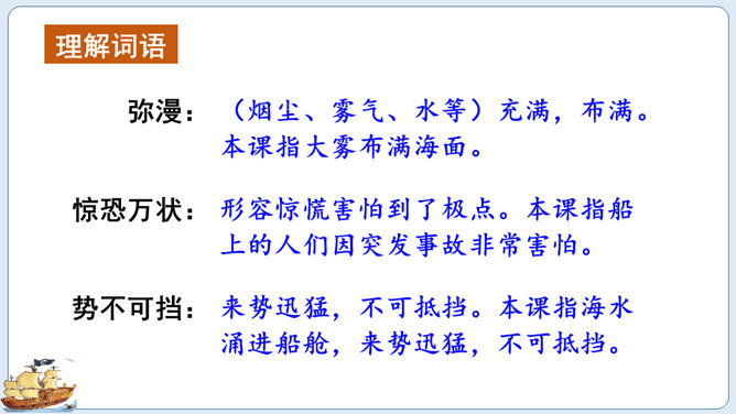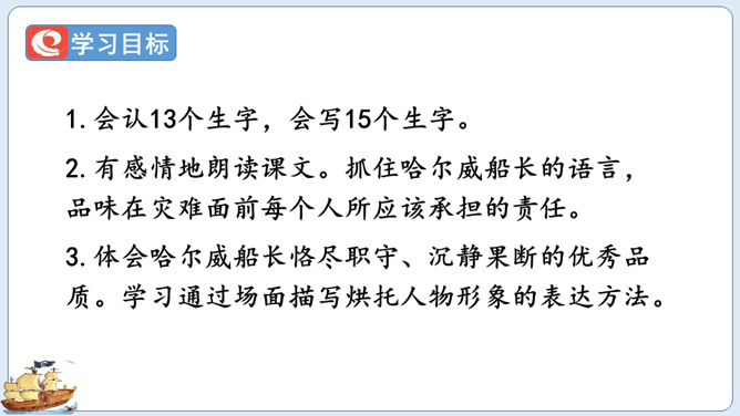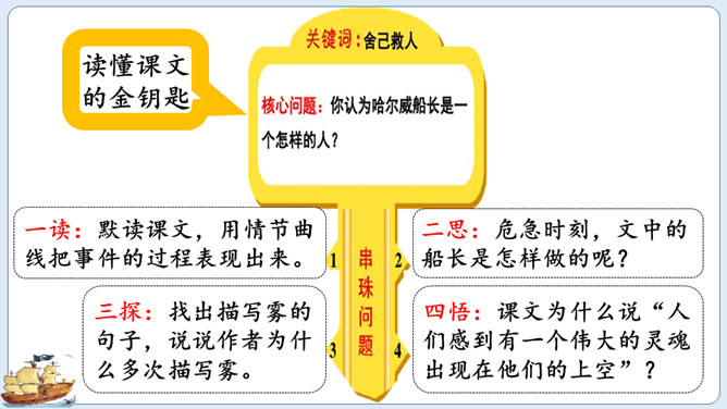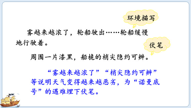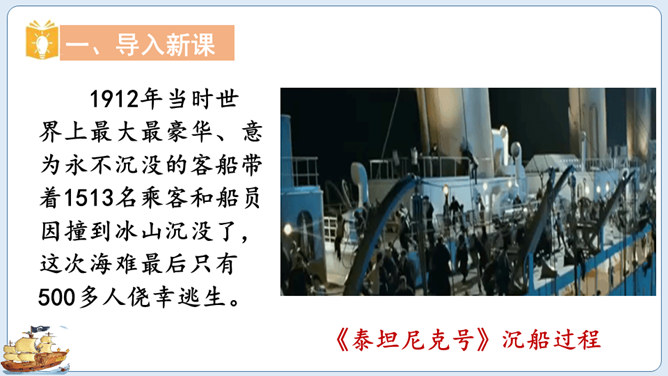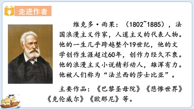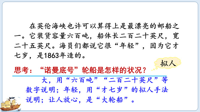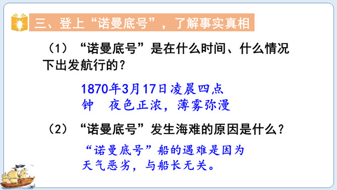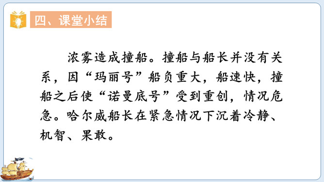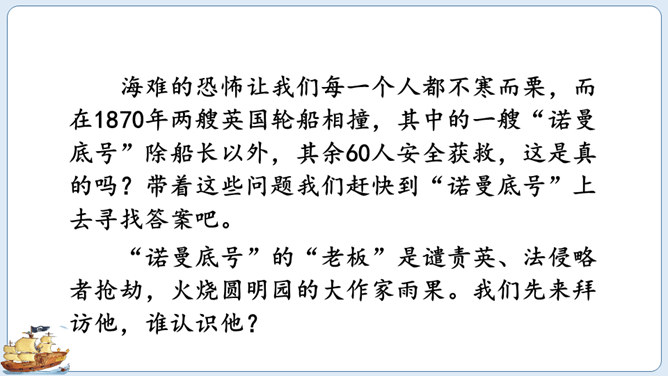 海难的恐怖让我们每一个人都不寒而栗,而在1870年两艘英国轮船相撞,其中的一艘“诺曼底号”除船长以外,其余60人安全获救,这是真的吗?带着这些问题我们赶快到“诺曼底号”上去寻找答案吧。“诺曼底号”的“老板”是谴责英、法侵略者抢劫,火烧圆明园的大作家雨果。我们先来拜访他,谁认识他?浓雾造成撞船。撞船与船长并没有关系,因“玛丽号”船负重大,船速快,撞船之后使“诺曼底号”受到重创,情况危急。哈尔威船长在紧急情况下沉着冷静、机智、果敢。所属专题:诺曼底号遇难记ppt。