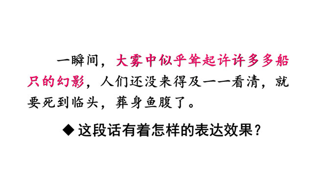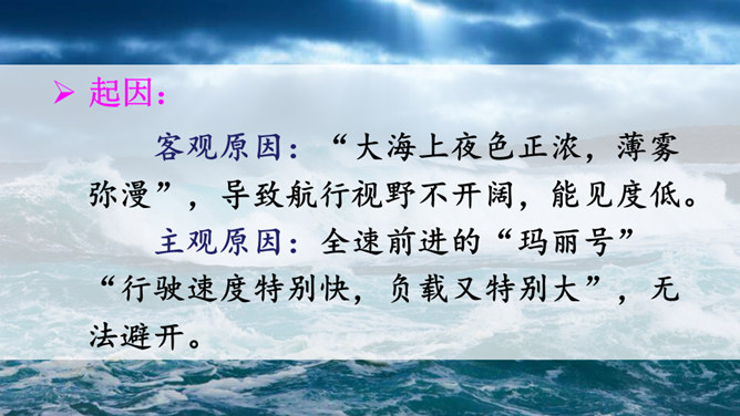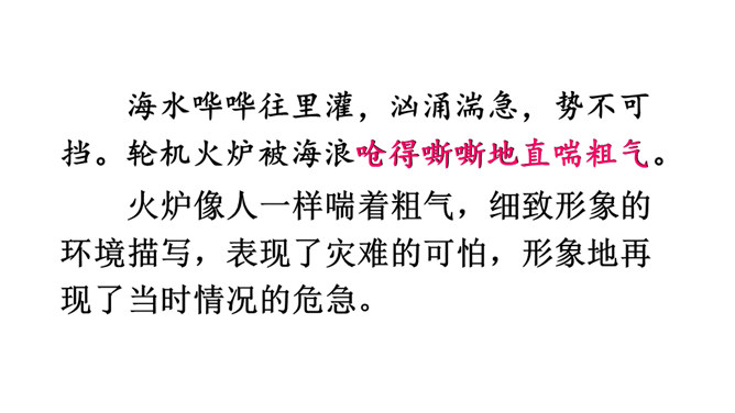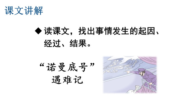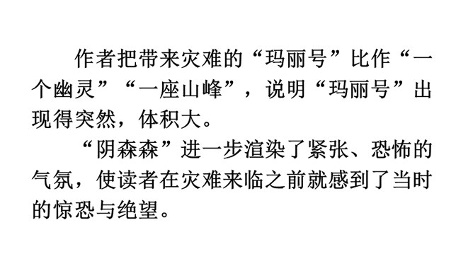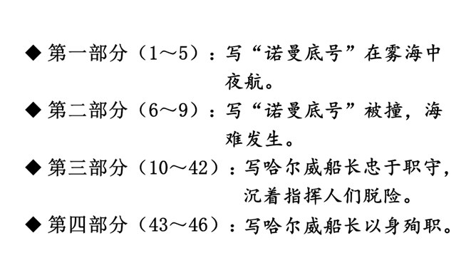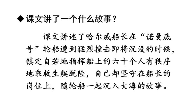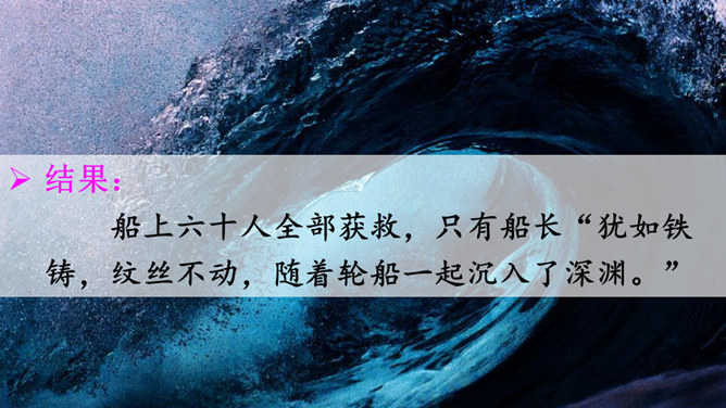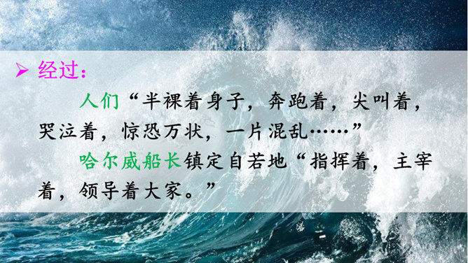 碰撞发生后,船上的人们和船长各有什么表现?找出课文中的句子,读一读,和同学交流感受。细致描写人们的行为,表现出了他们的惊恐与绝望,也反映了当时场面的混乱,与下文船长的镇定自若形成鲜明的对比。一个冷静的船长和一群混乱的人,对比的手法让我们更加深刻地感受到这位船长在灾难骤然降临时表现出的冷静、果敢。双重否定句,加强了肯定的语气,高度赞扬了哈尔威船长的精神品质。所属专题:诺曼底号遇难记ppt。